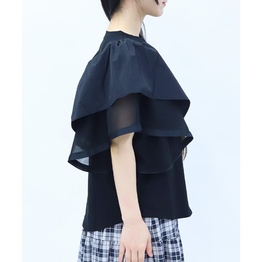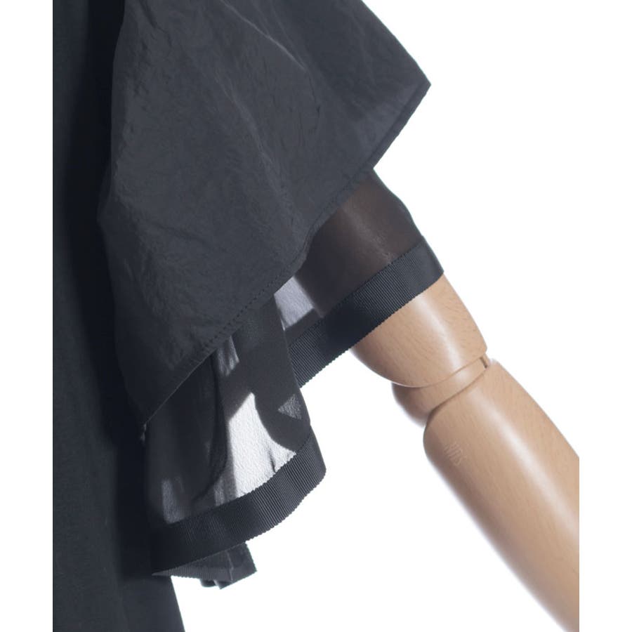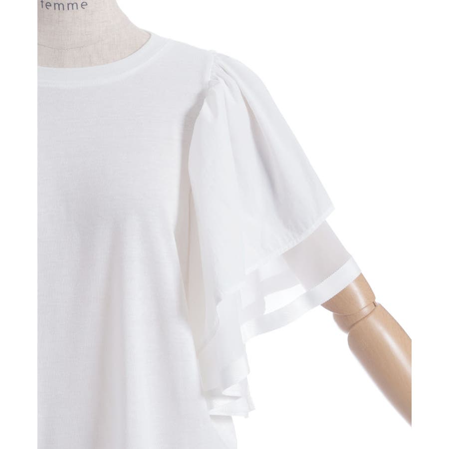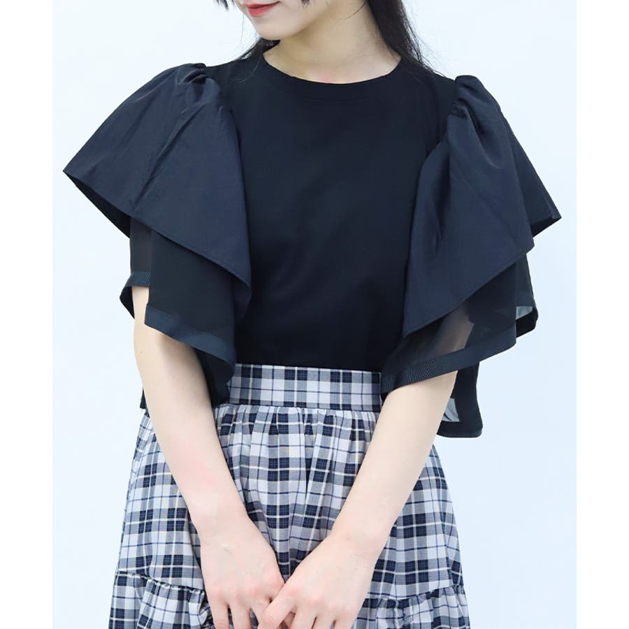 身頃は無地でベーシックにまとめ、袖には透け感のある異素材をドッキング。ふんわりと広がるフリルスリーブが二の腕をさりげなくカバーしながら、女性らしい印象に仕上げてくれます。