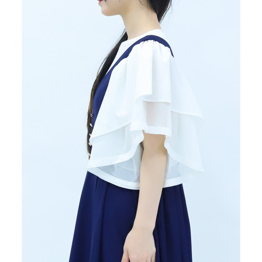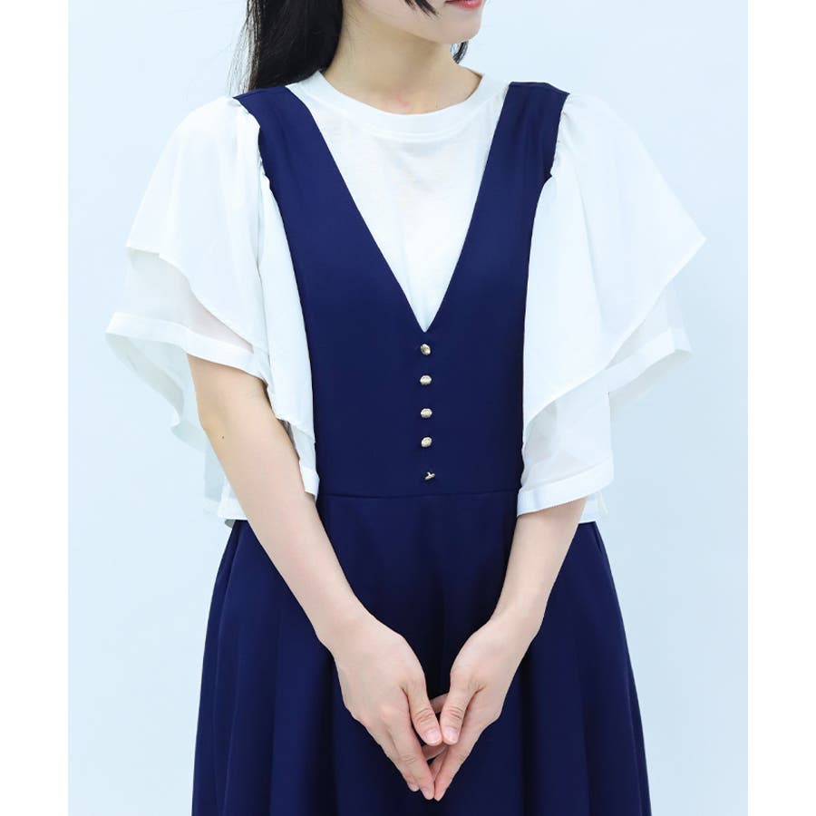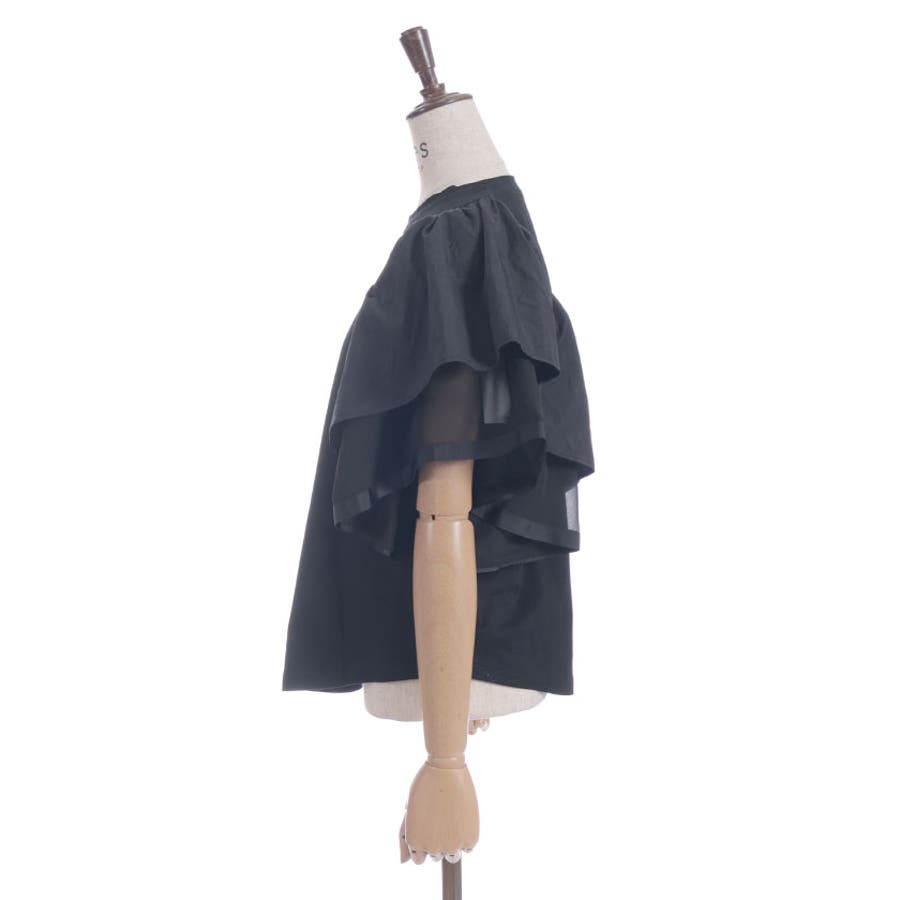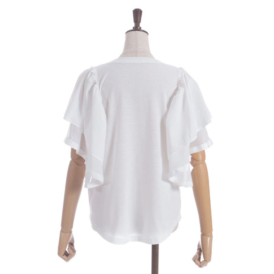 身頃は無地でベーシックにまとめ、袖には透け感のある異素材をドッキング。ふんわりと広がるフリルスリーブが二の腕をさりげなくカバーしながら、女性らしい印象に仕上げてくれます。