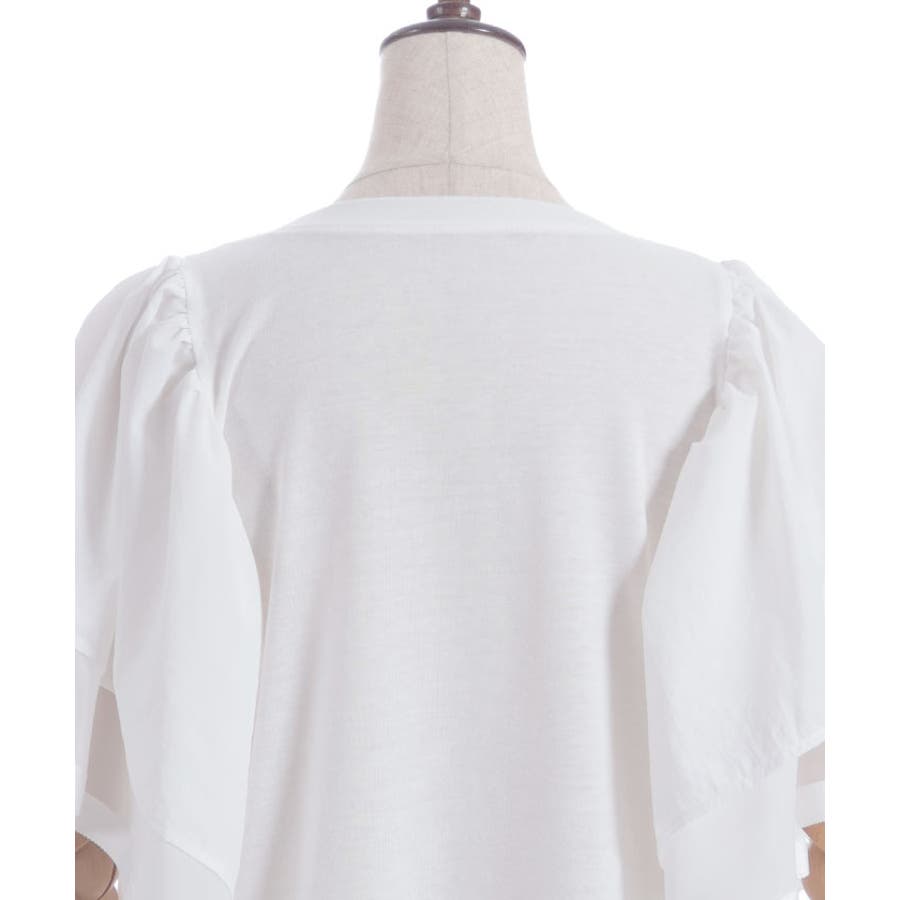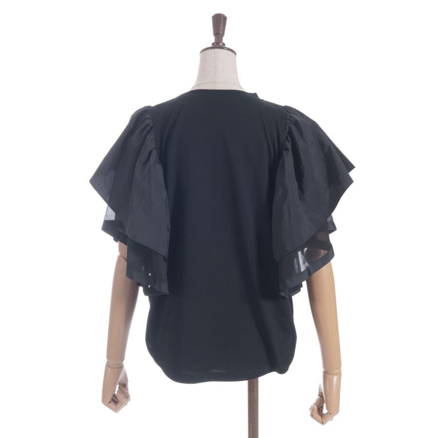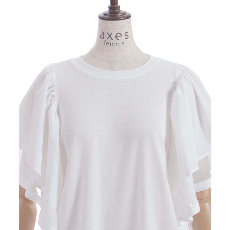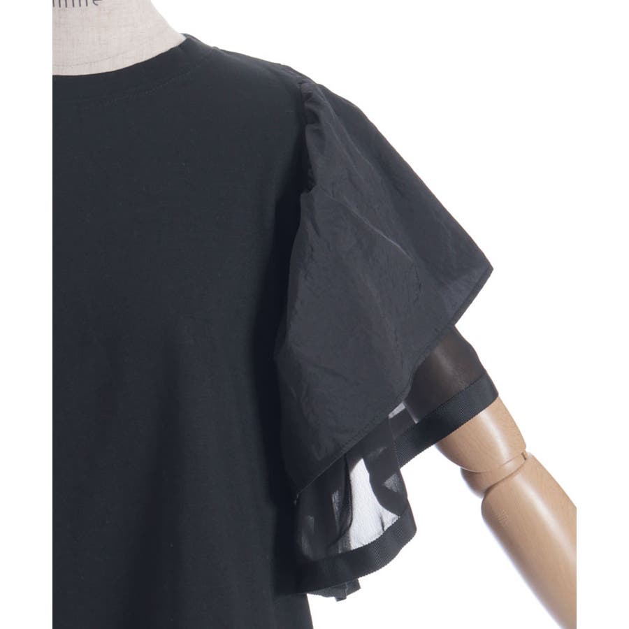 シンプルなシルエットに、袖のフリルデザインで華やかさをプラスした異素材スリーブトップス。カジュアルな着心地ながら、1枚で存在感のある着映えアイテムです。
