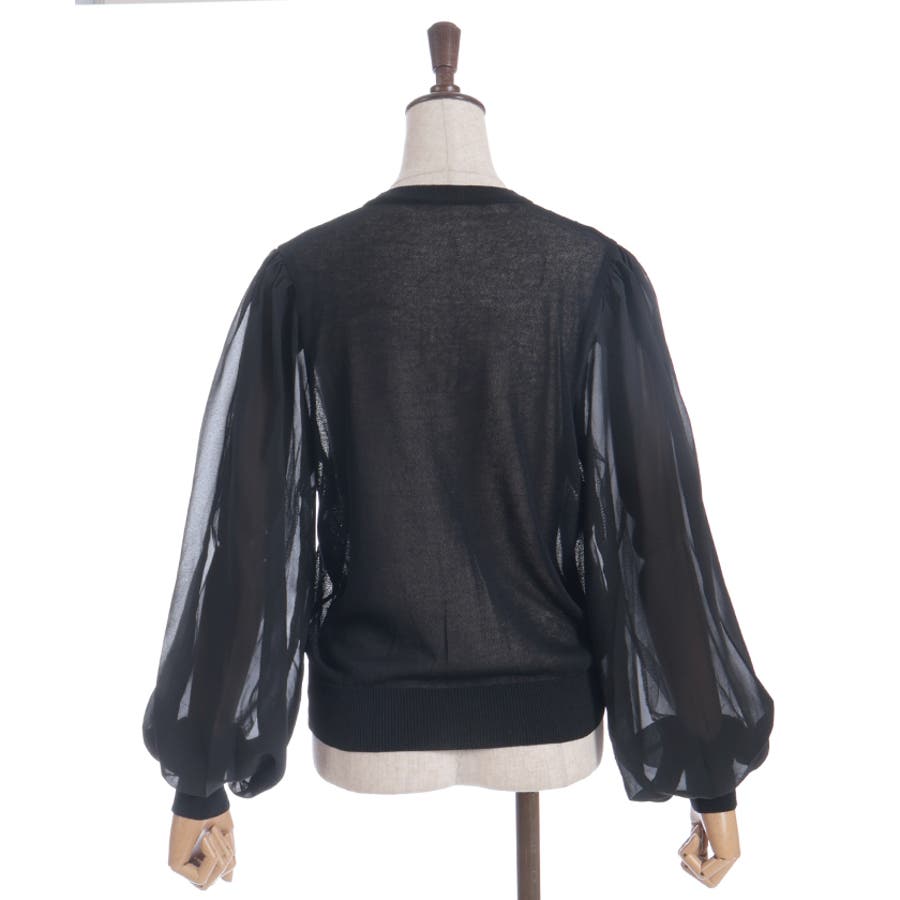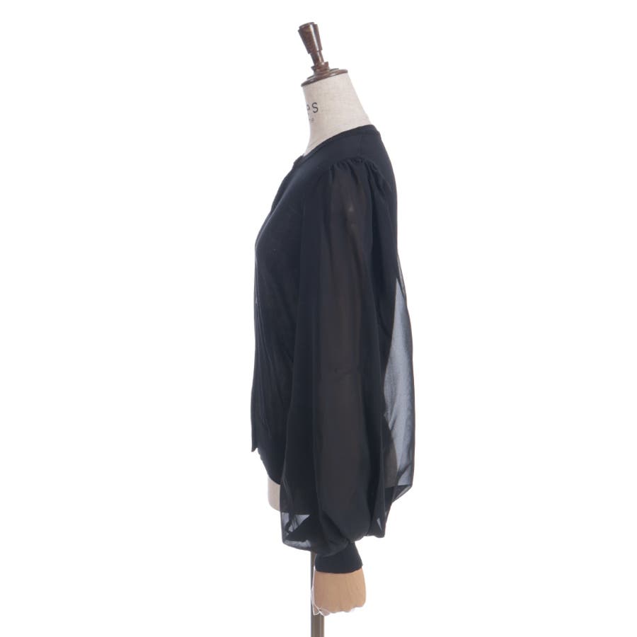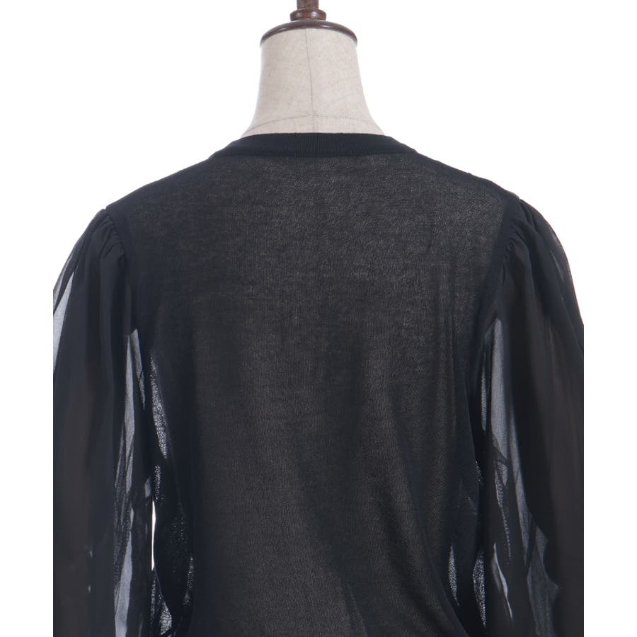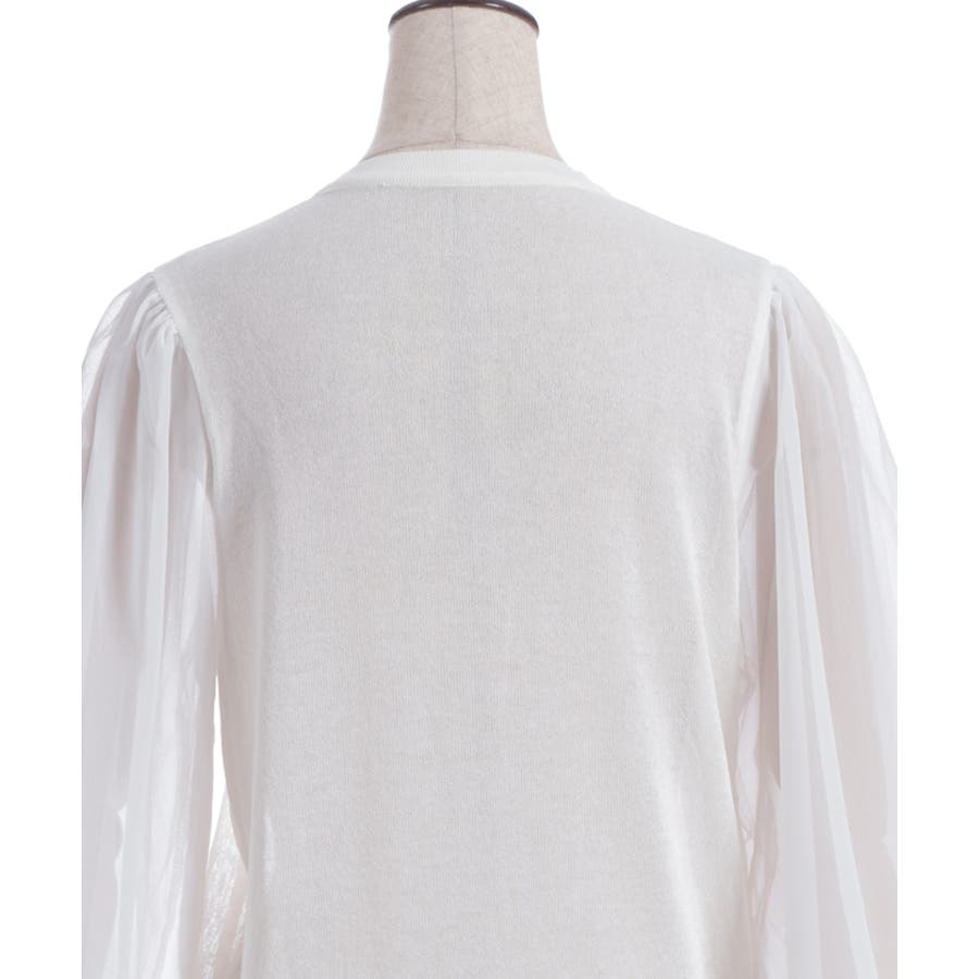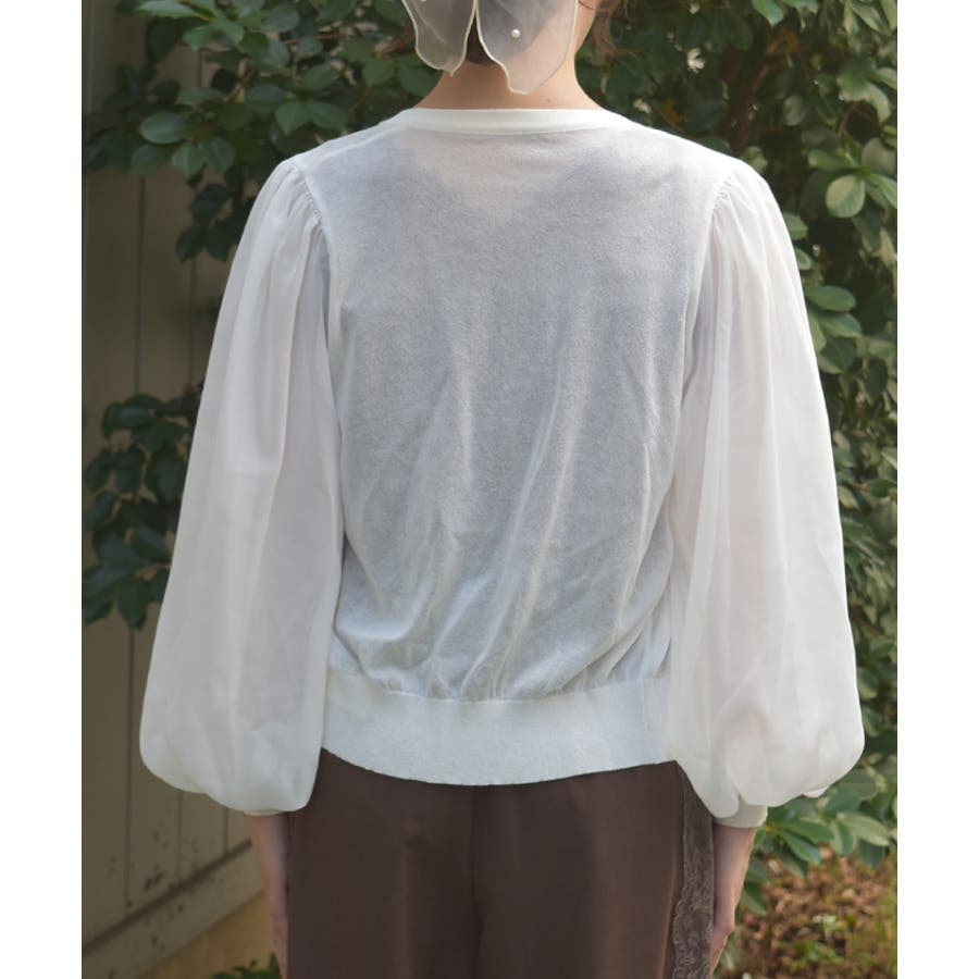 本体は柔らかいニット素材、袖は異素材切替のシフォン調で軽やかに。