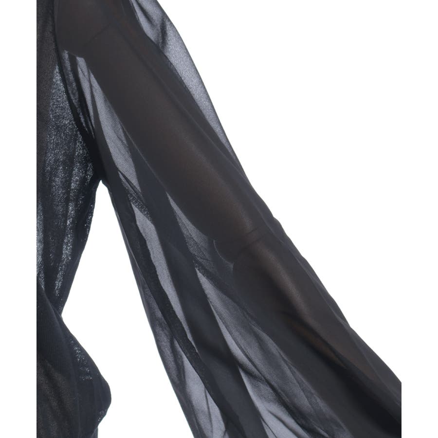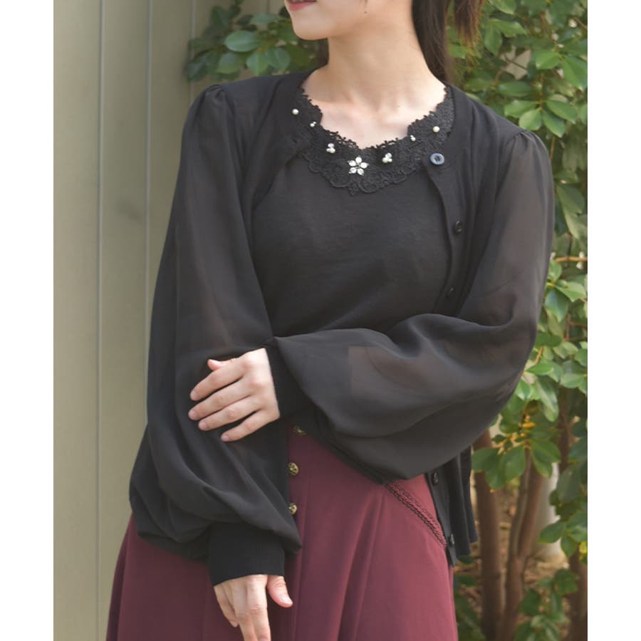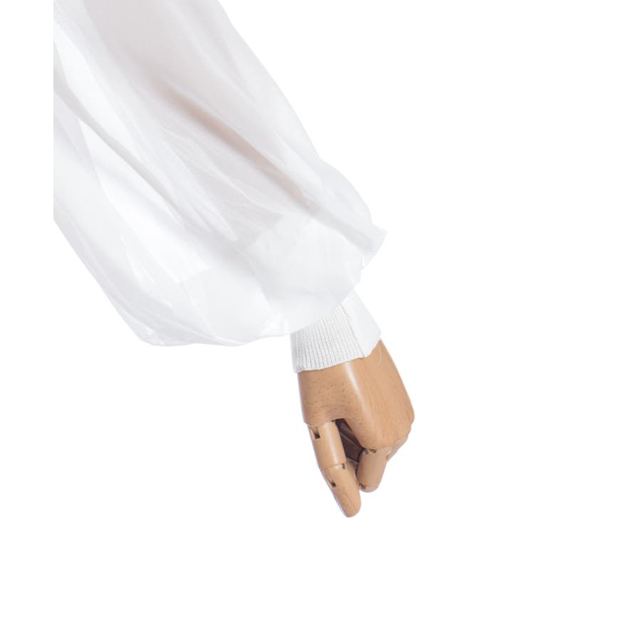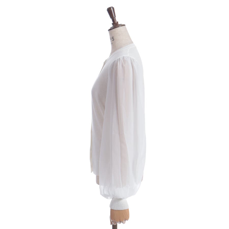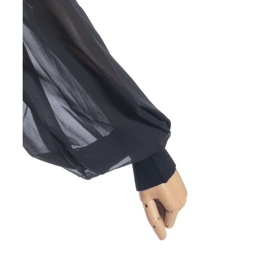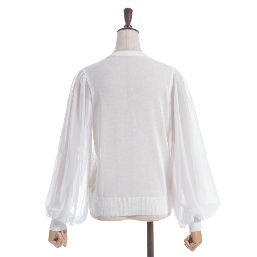 本体は柔らかいニット素材、袖は異素材切替のシフォン調で軽やかに。