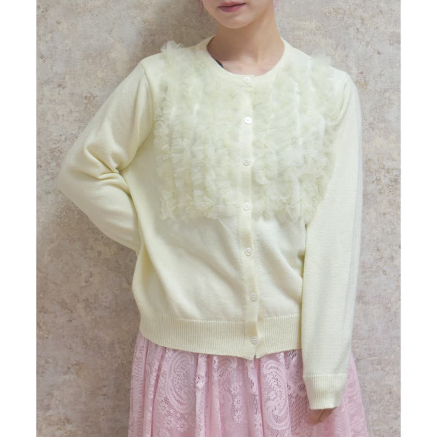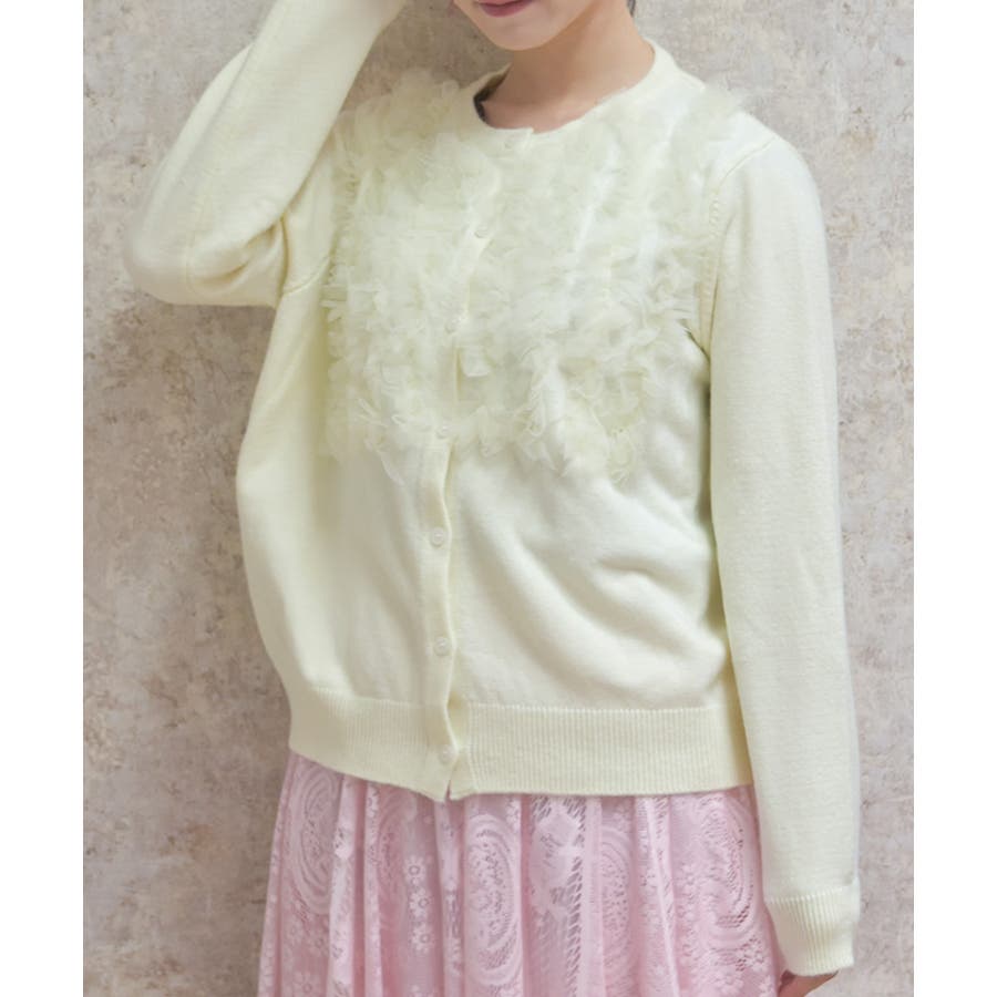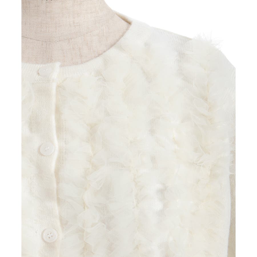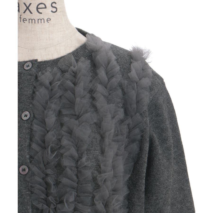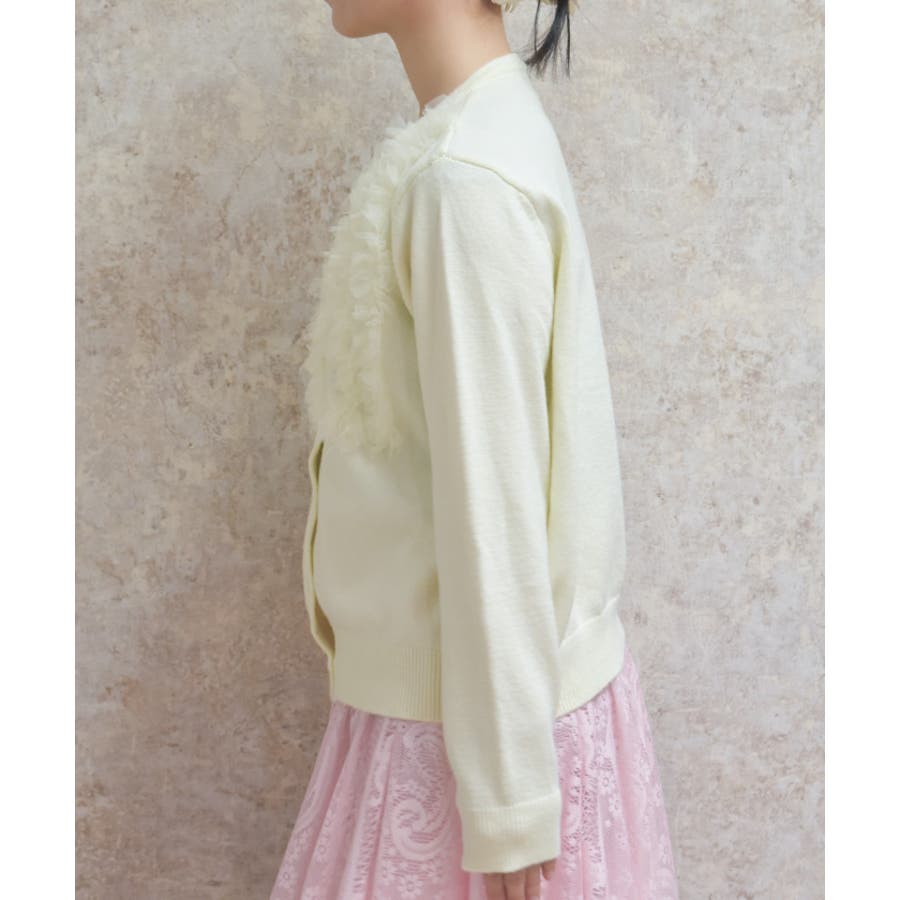 チュールフリルを贅沢にあしらったニットカーディガン。柔らかな肌触りのニット素材で、デイリーにも着やすい一枚です。
