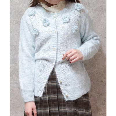 ふわっと柔らかなニットに、立体的なモチーフをあしらった愛らしいカーディガン。ほっこりとした温もりを感じられる素材で、寒い季節の主役トップスとしても活躍します。