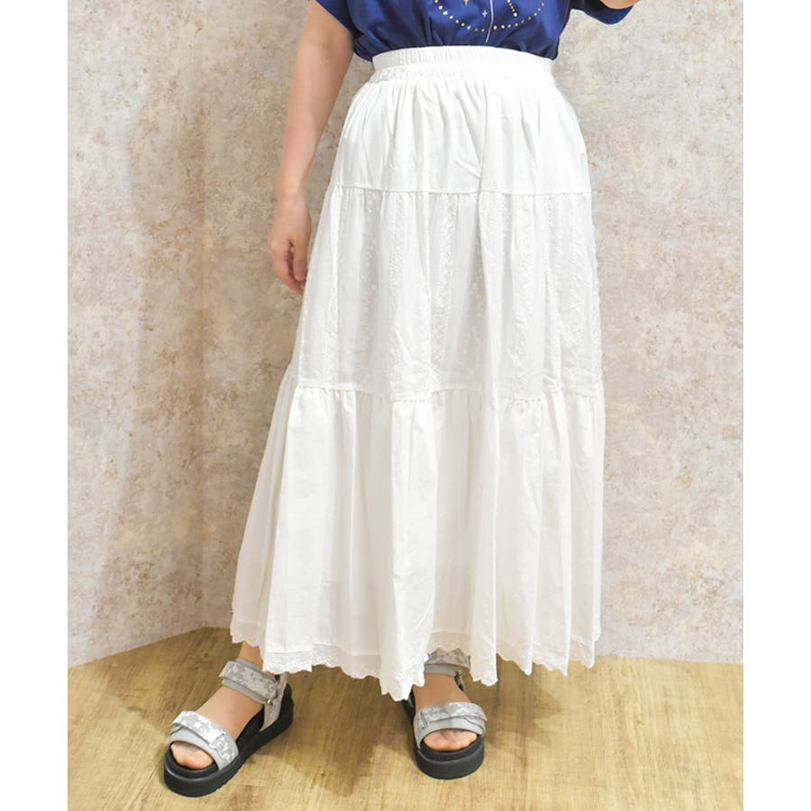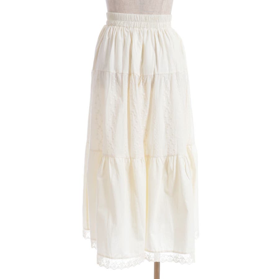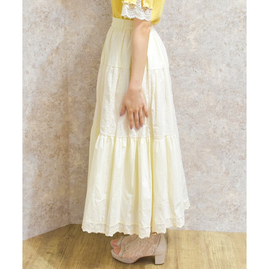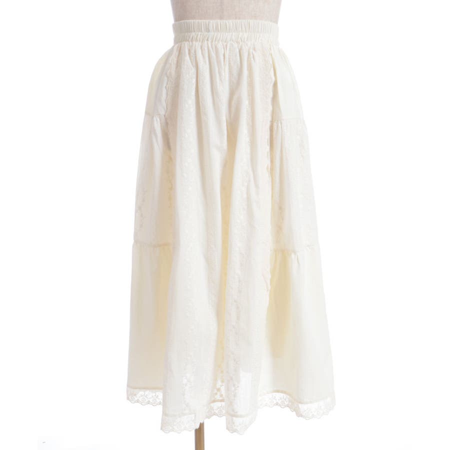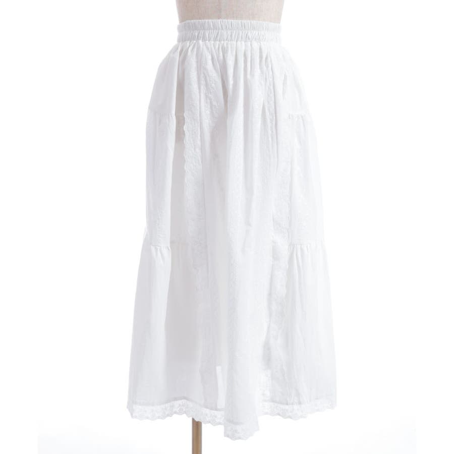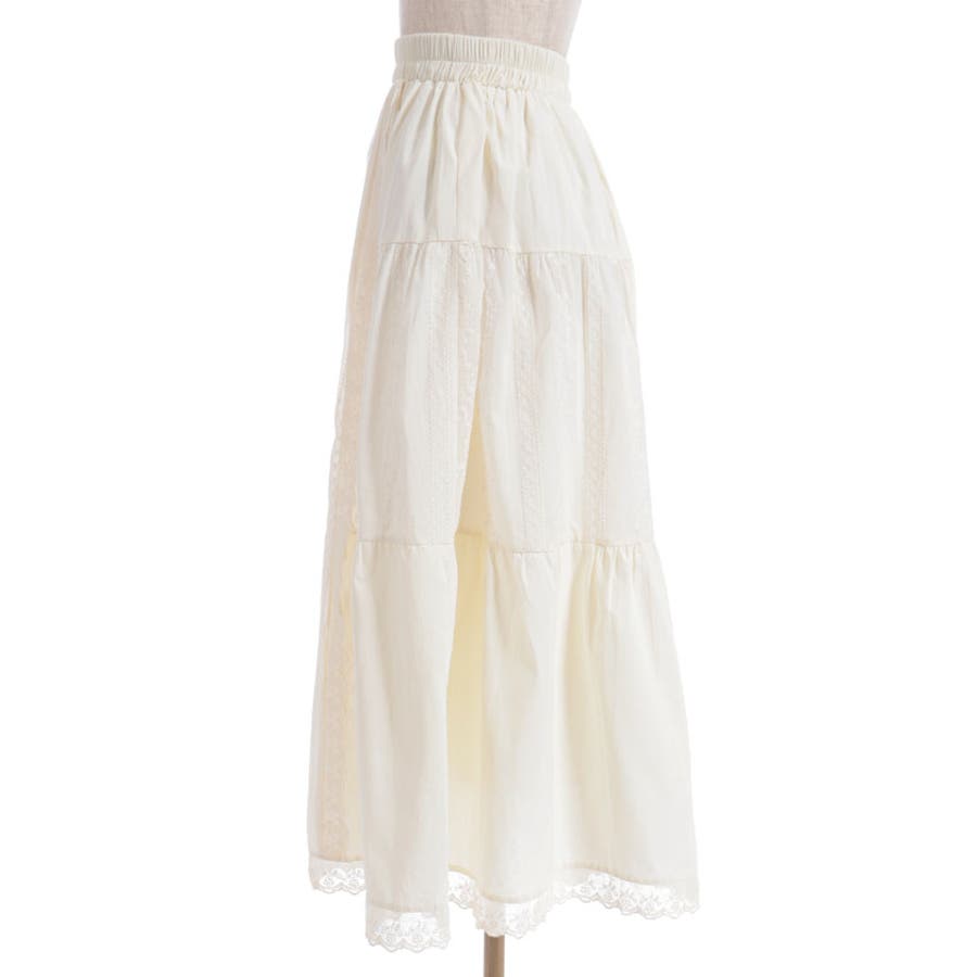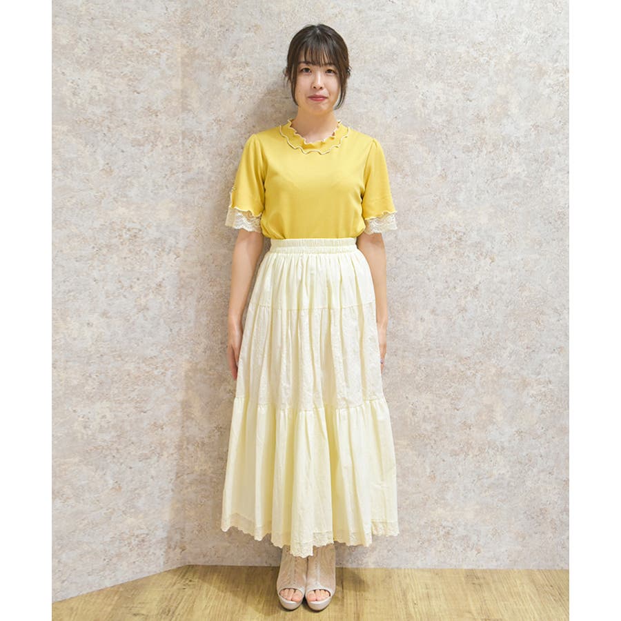 ティアード切替と繊細なカットワークレースがフェミニンな印象のロングスカート。