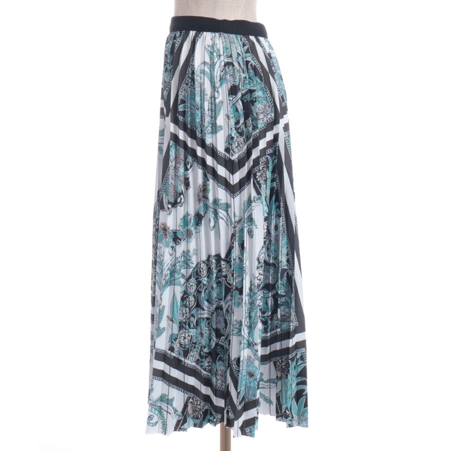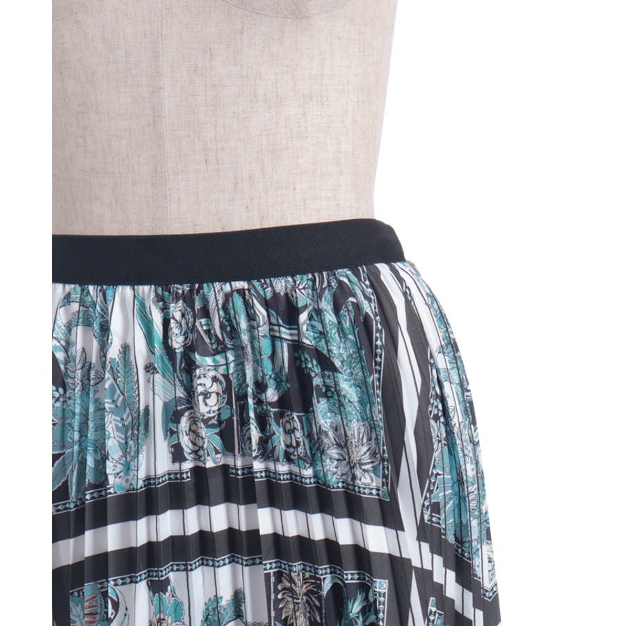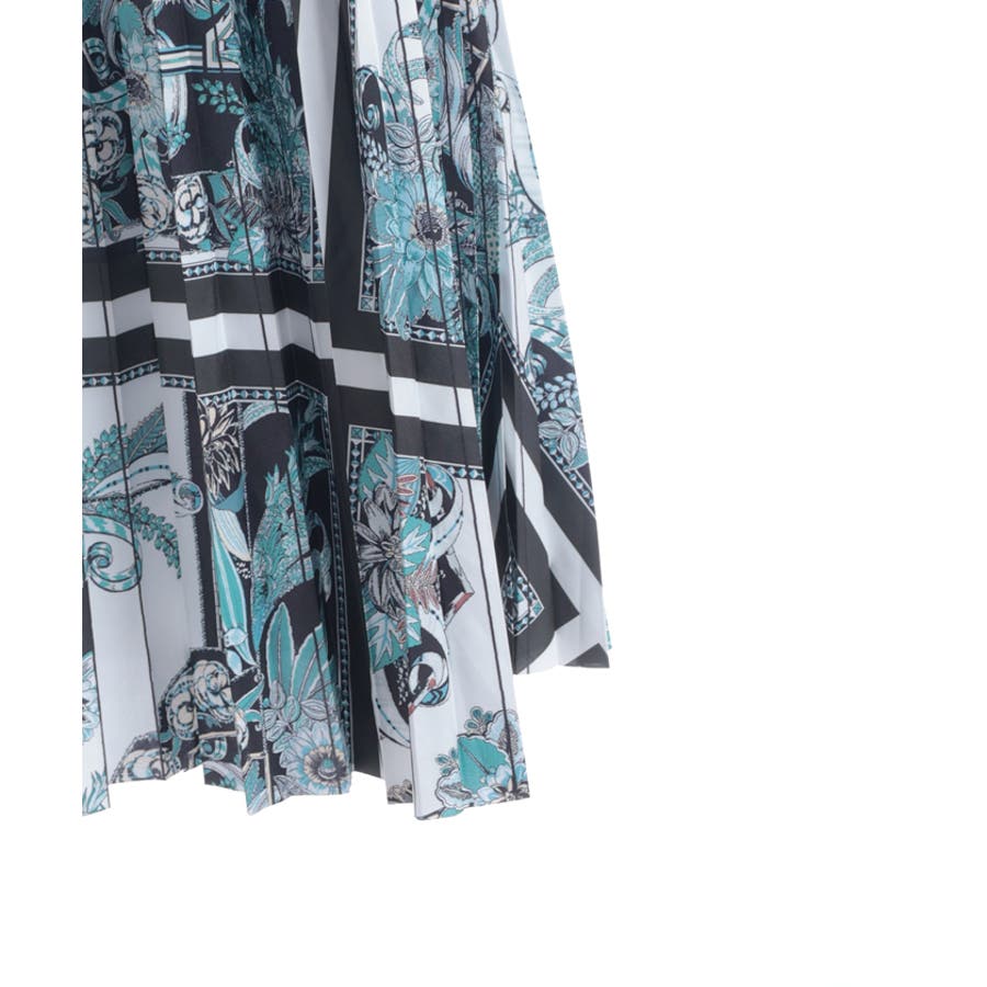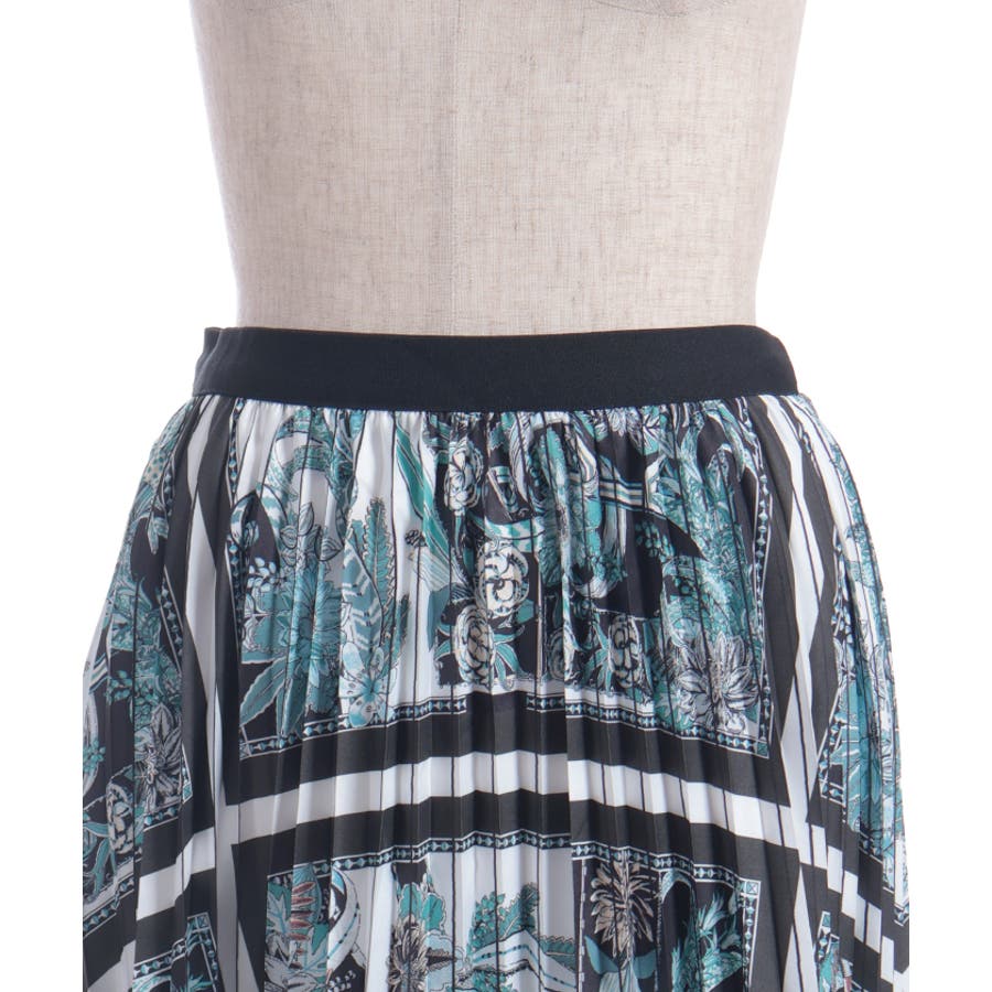 フラワーモチーフとストライプ調の切り替えが印象的なプリーツスカート。歩くたびに揺れるシルエットが、上品で華やかな雰囲気を演出します。