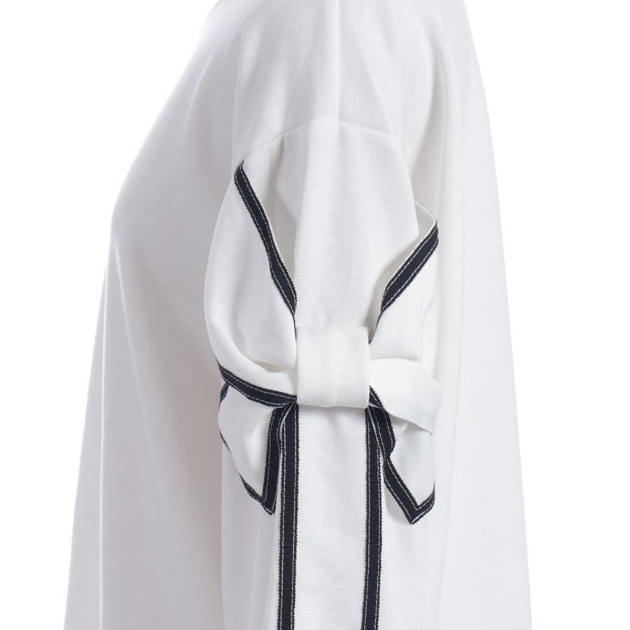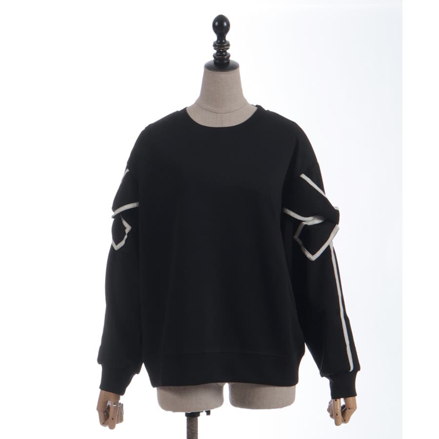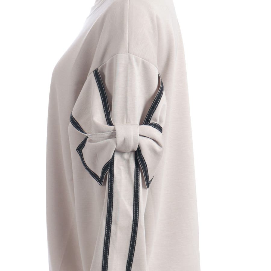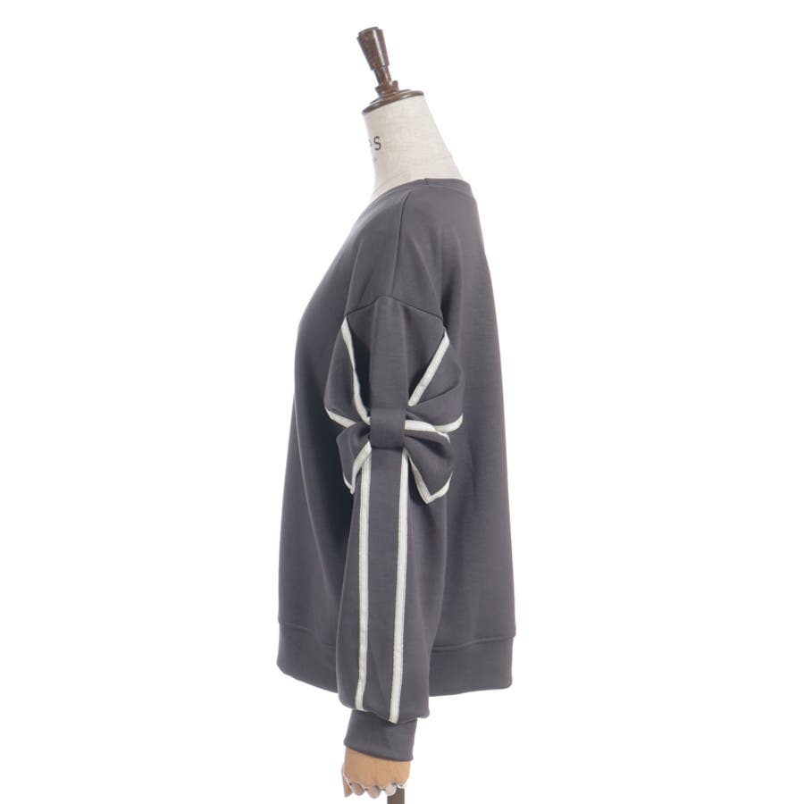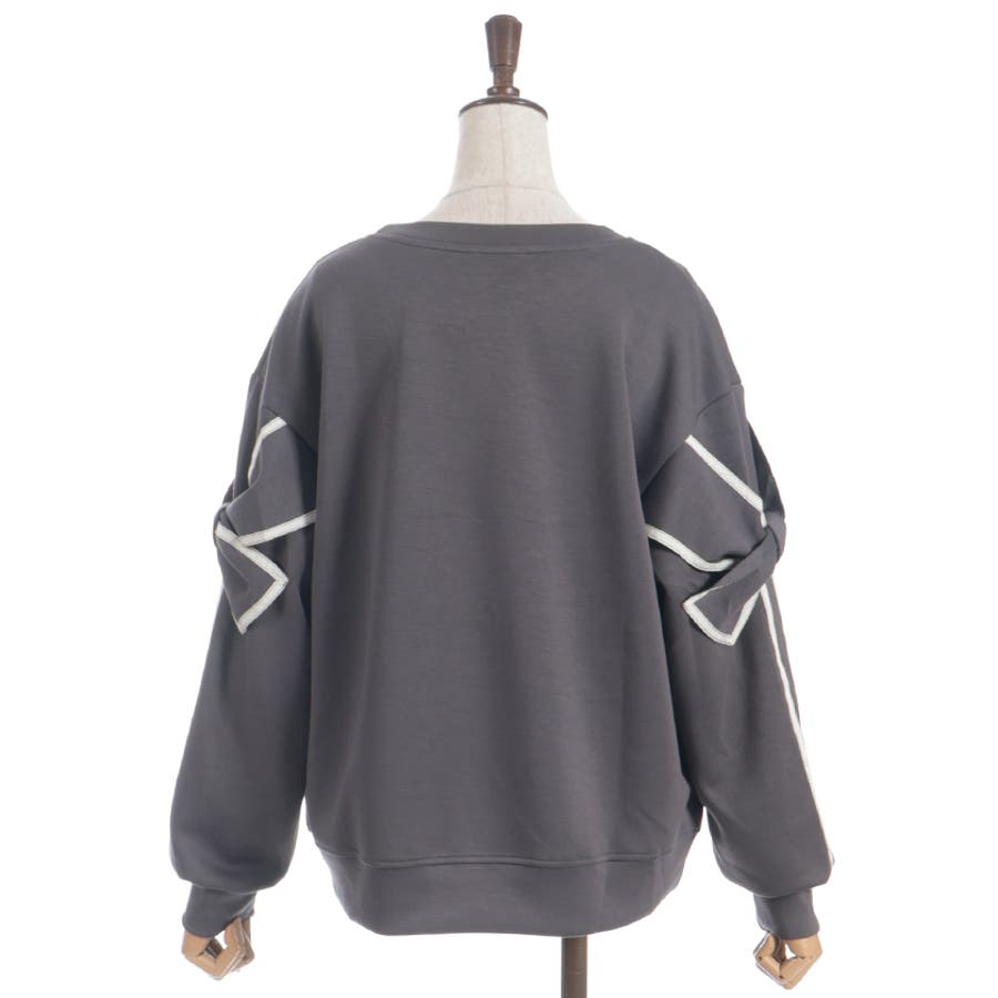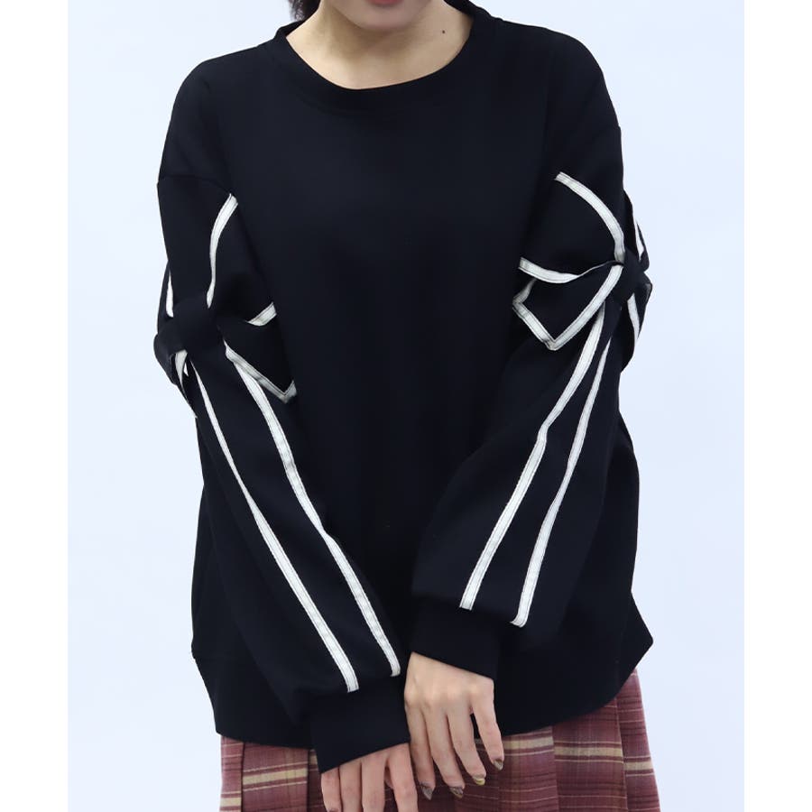 シンプルなシルエットに施されたリボンディテールがフェミニンな印象をプラス。スリーブ部分の切り替えラインとリボンで、カジュアルながらも大人っぽい雰囲気を演出します。