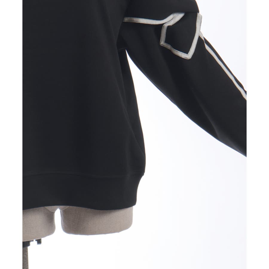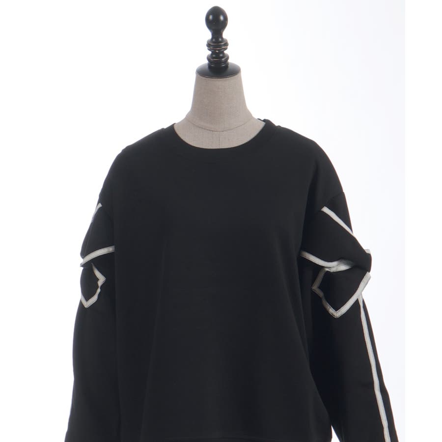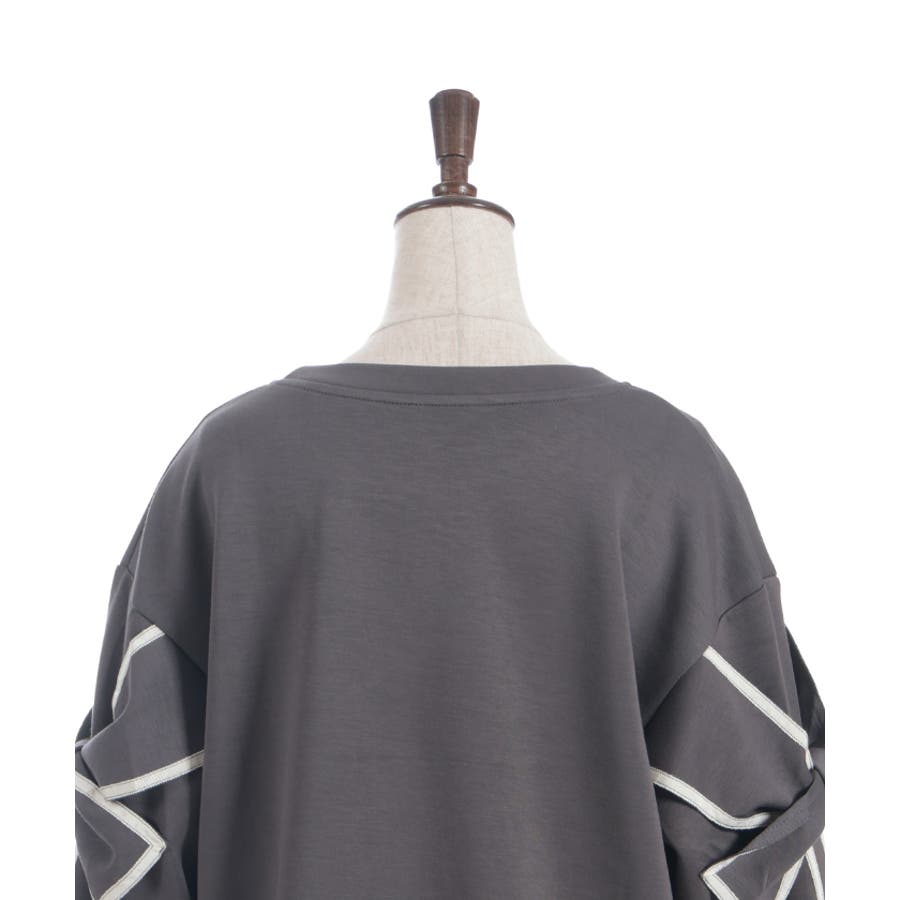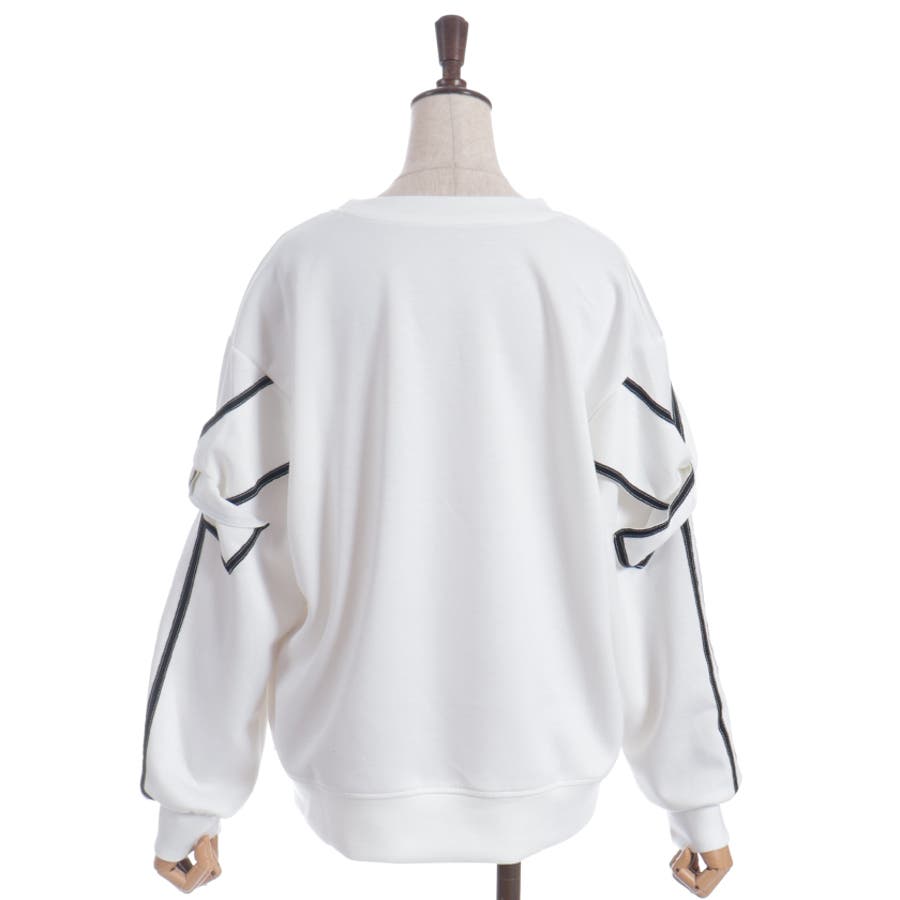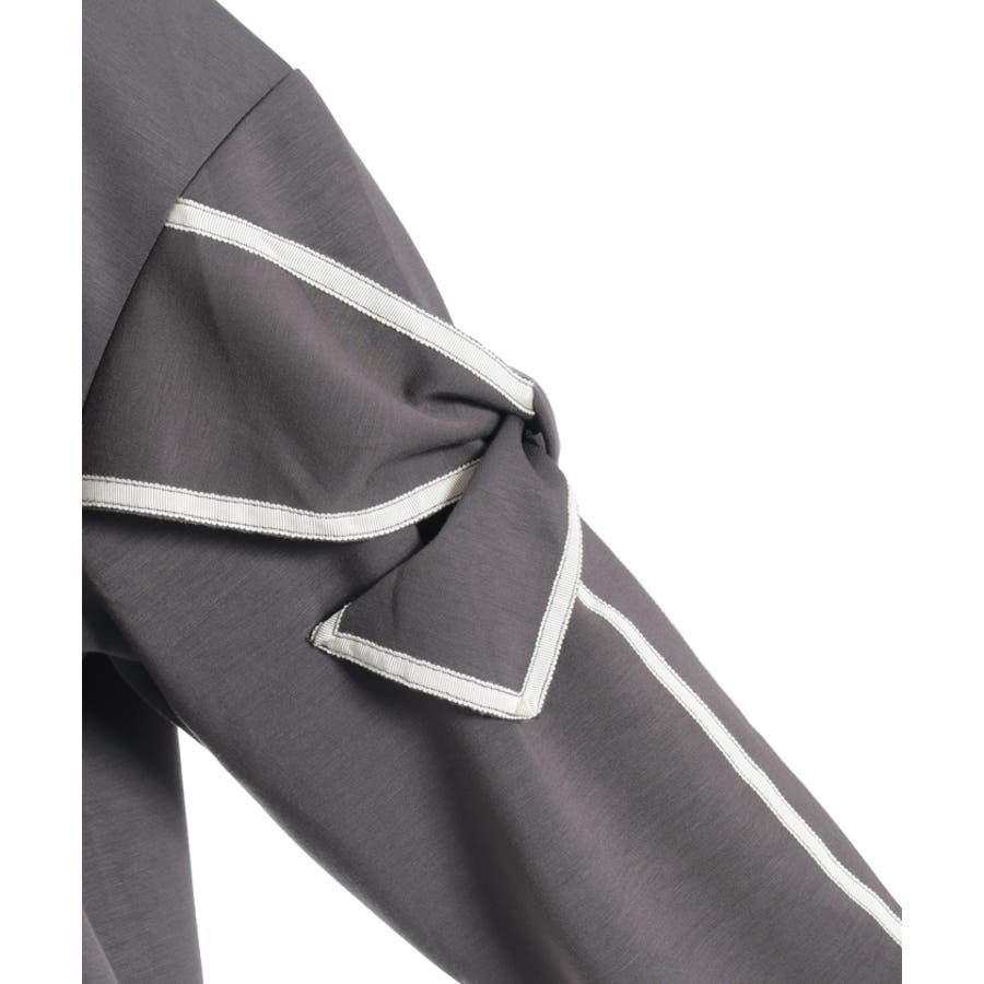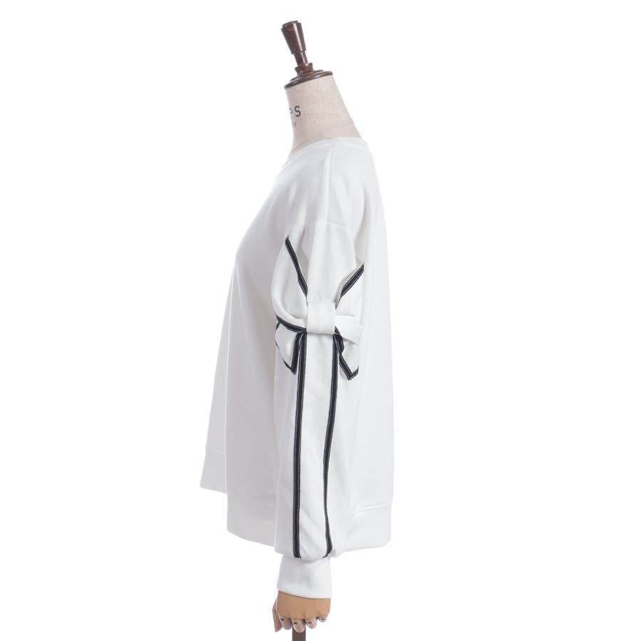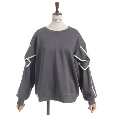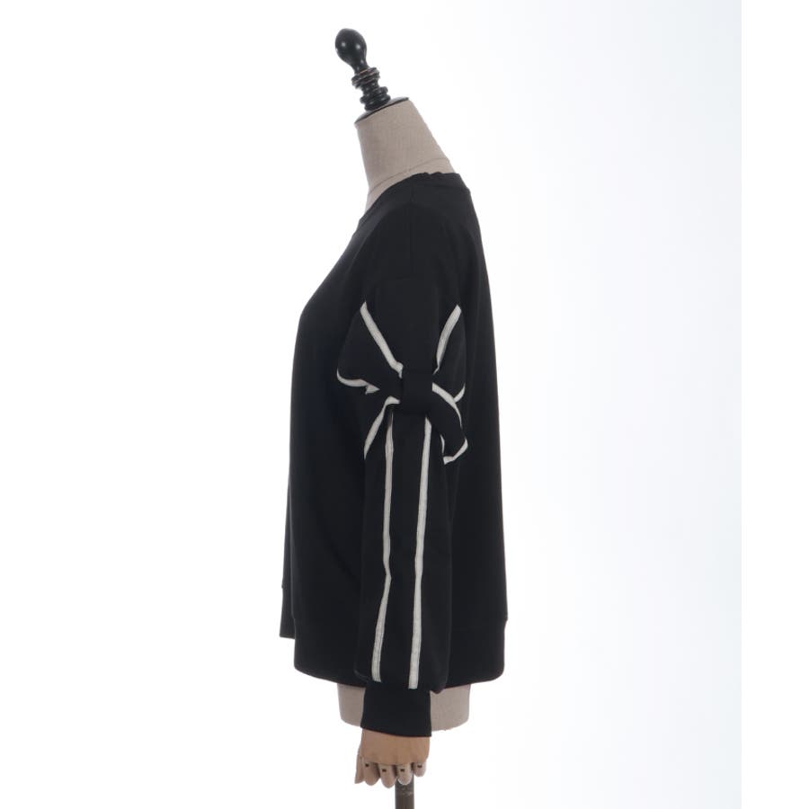 シンプルなシルエットに施されたリボンディテールがフェミニンな印象をプラス。スリーブ部分の切り替えラインとリボンで、カジュアルながらも大人っぽい雰囲気を演出します。