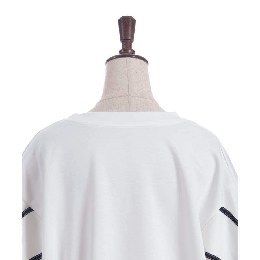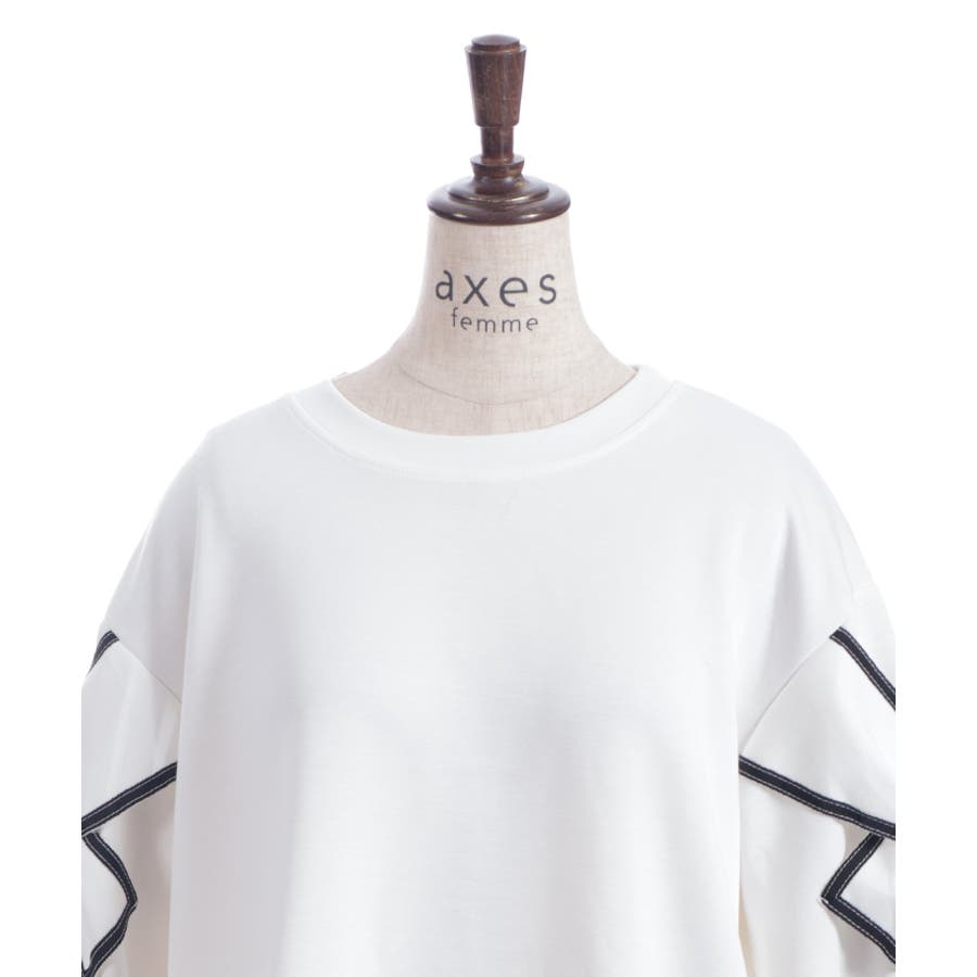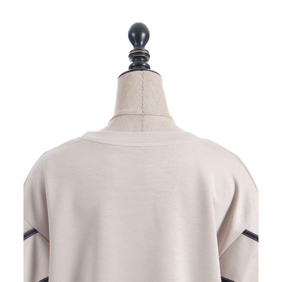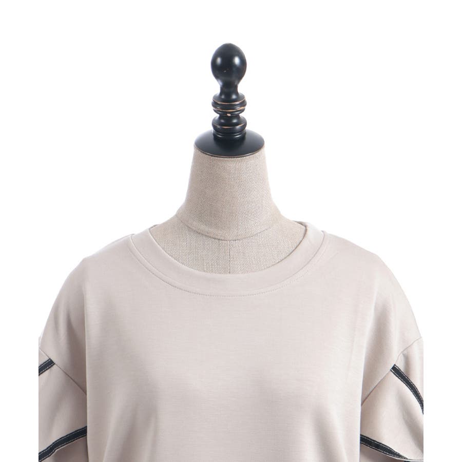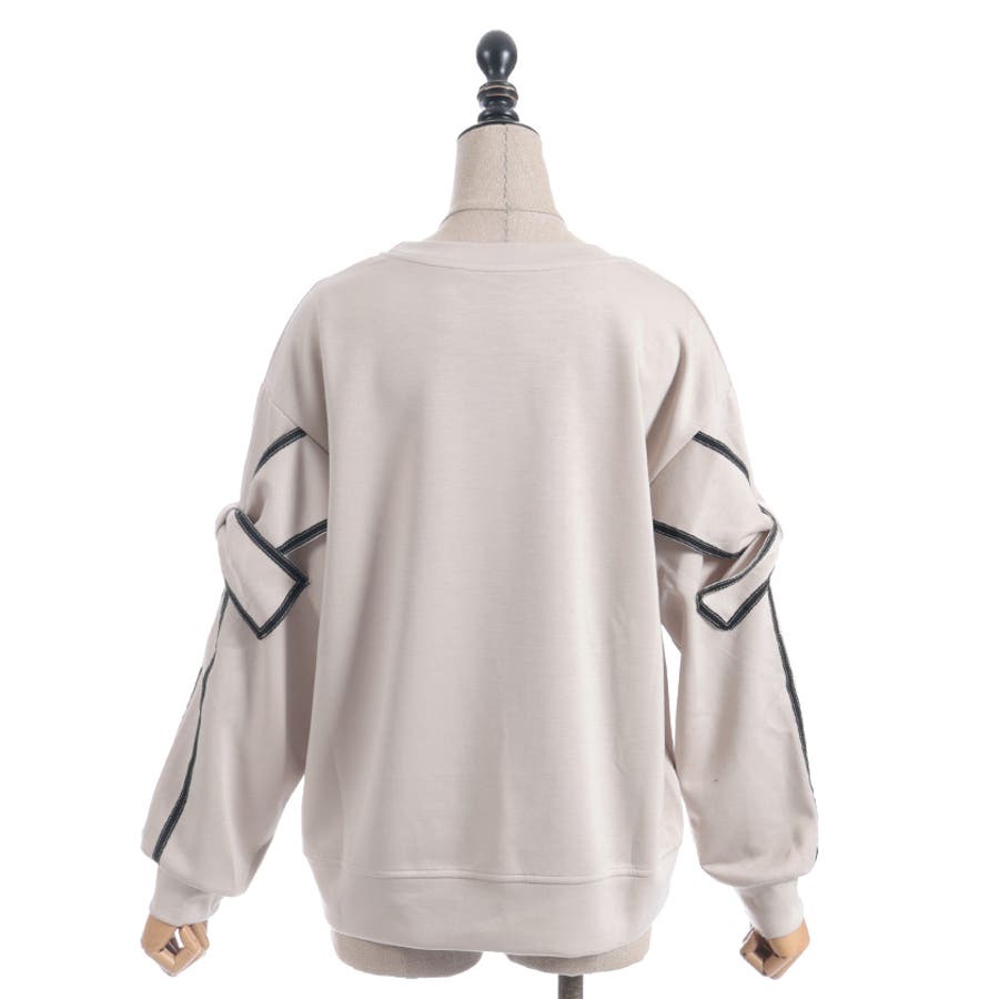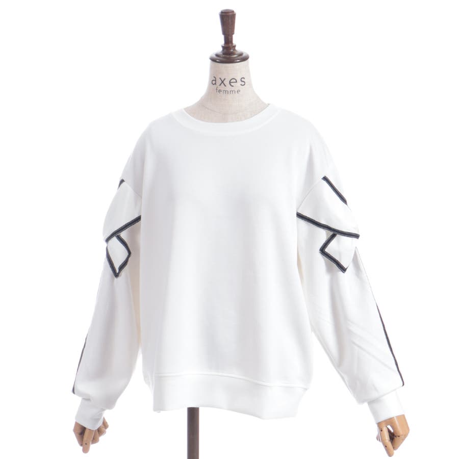 シンプルなシルエットに施されたリボンディテールがフェミニンな印象をプラス。スリーブ部分の切り替えラインとリボンで、カジュアルながらも大人っぽい雰囲気を演出します。