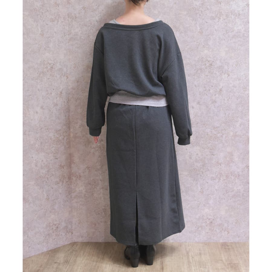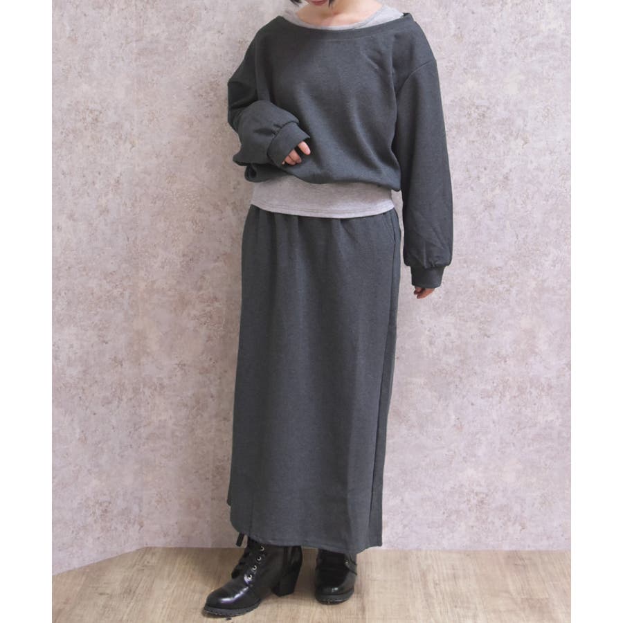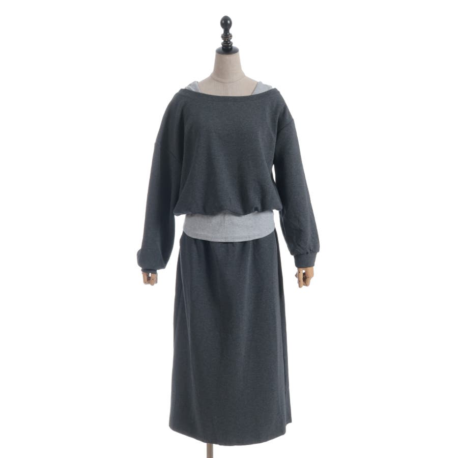 トップスはゆったりとしたシルエット、スカートはストレートラインで女性らしいバランスに仕上げました。
