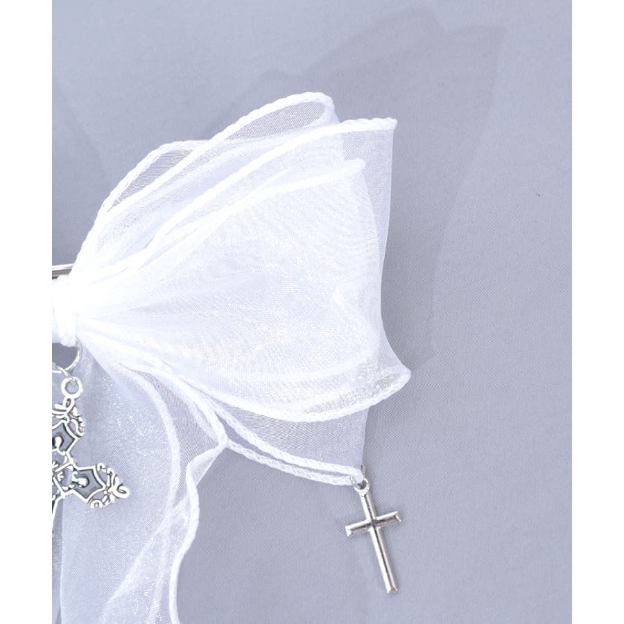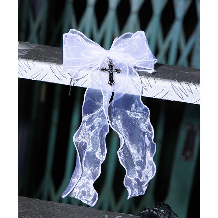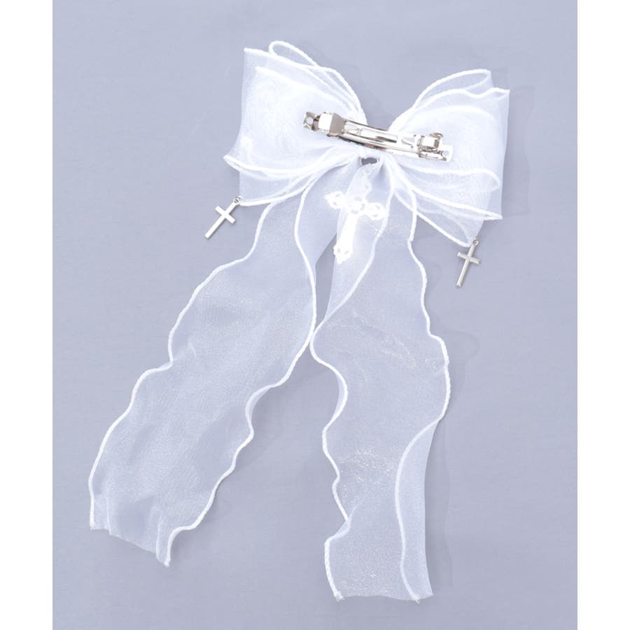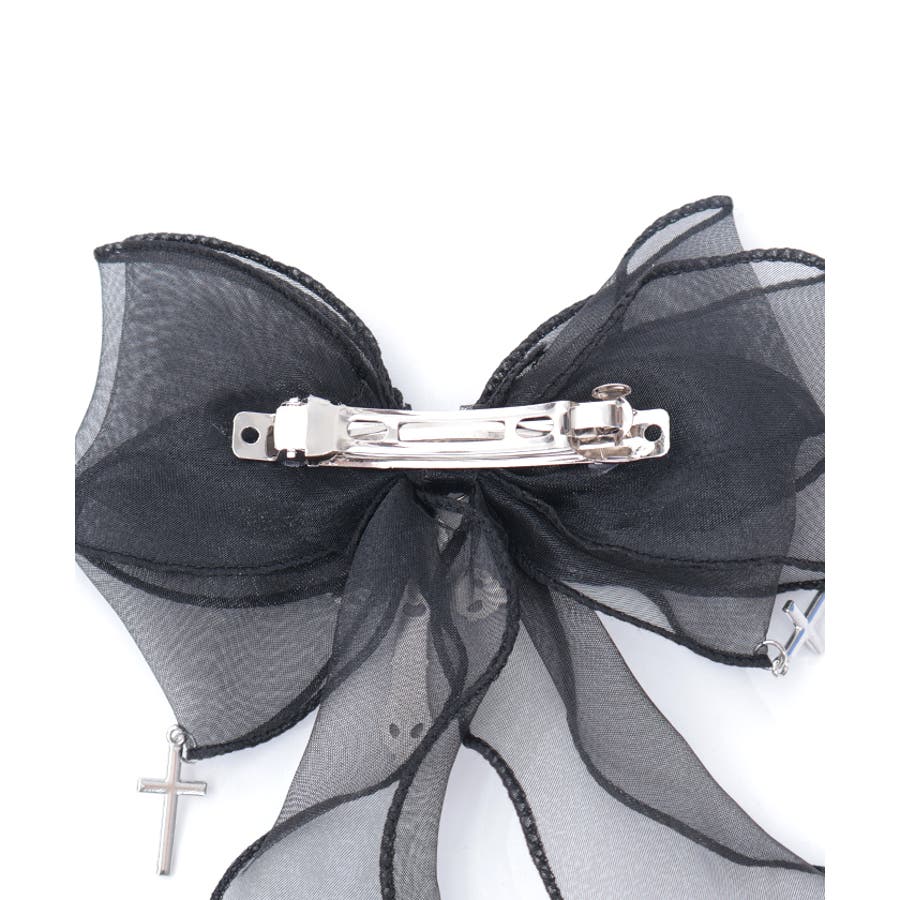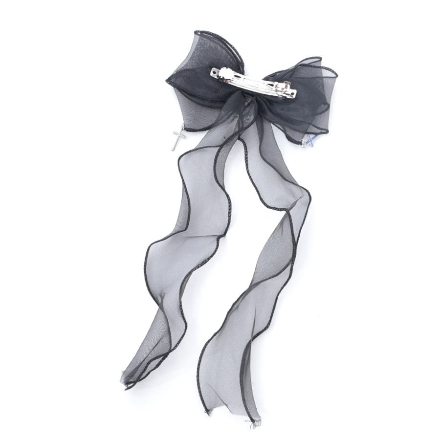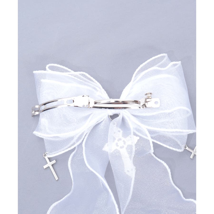 大き目のオーガンジーリボンにクロスチャームを合わせたクリップタイプのヘアアクセサリーです。