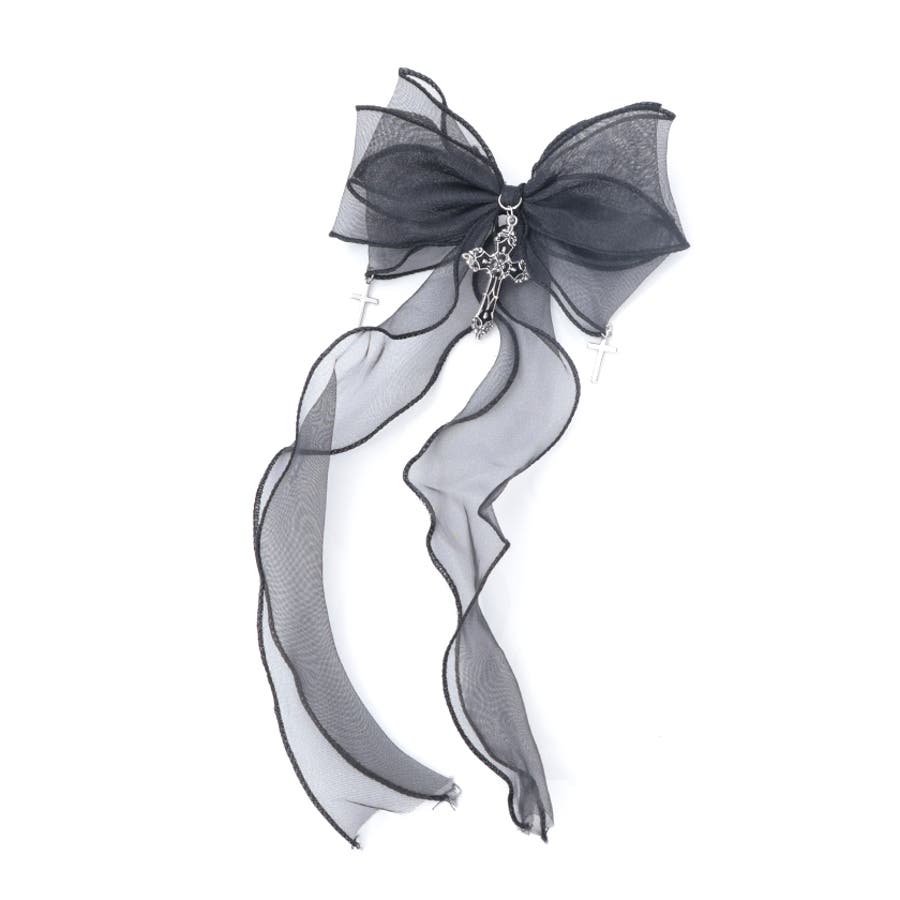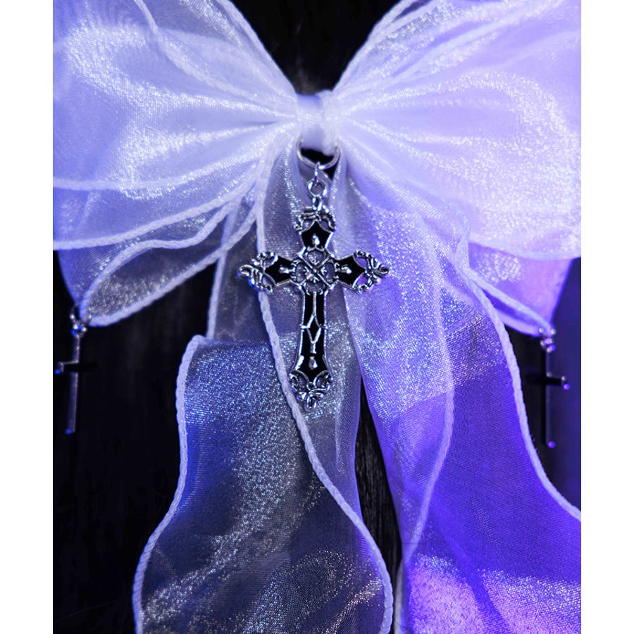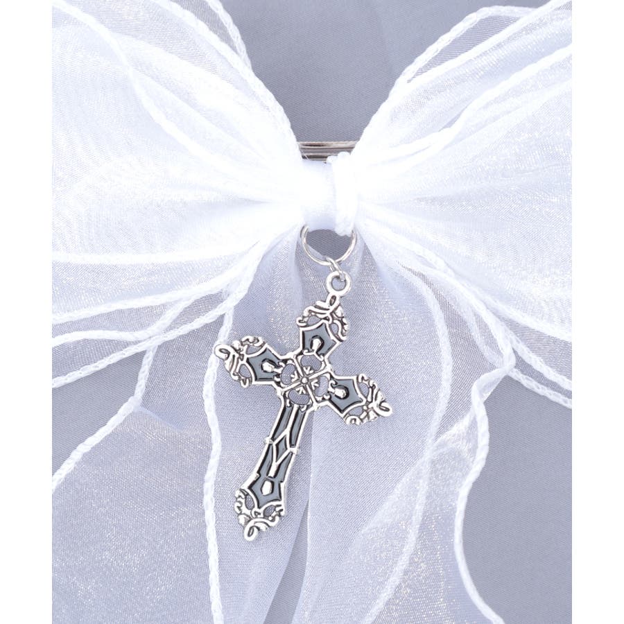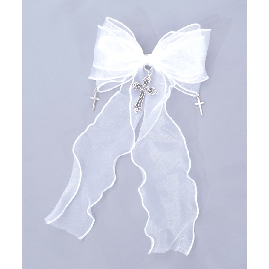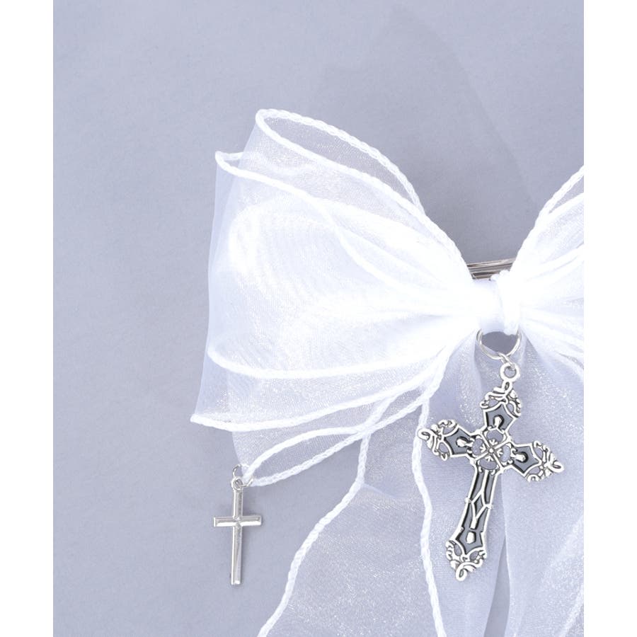 大き目のオーガンジーリボンにクロスチャームを合わせたクリップタイプのヘアアクセサリーです。