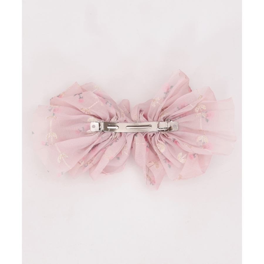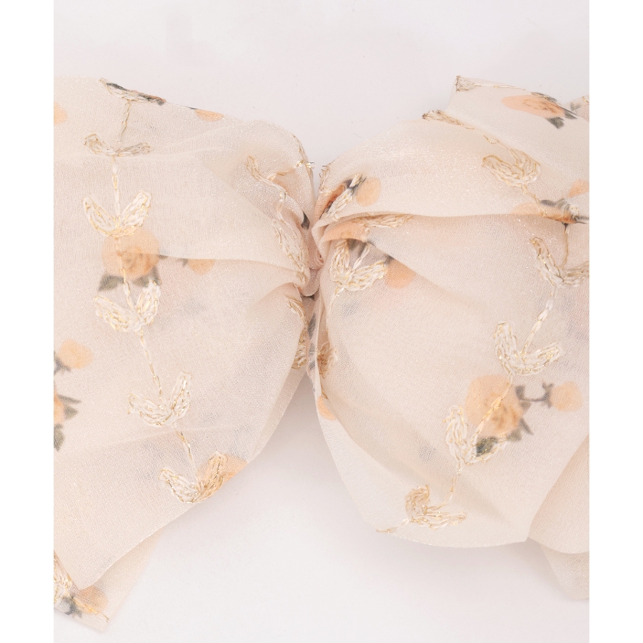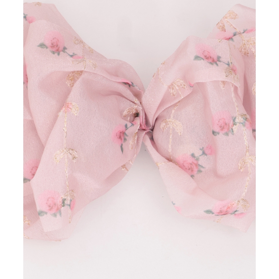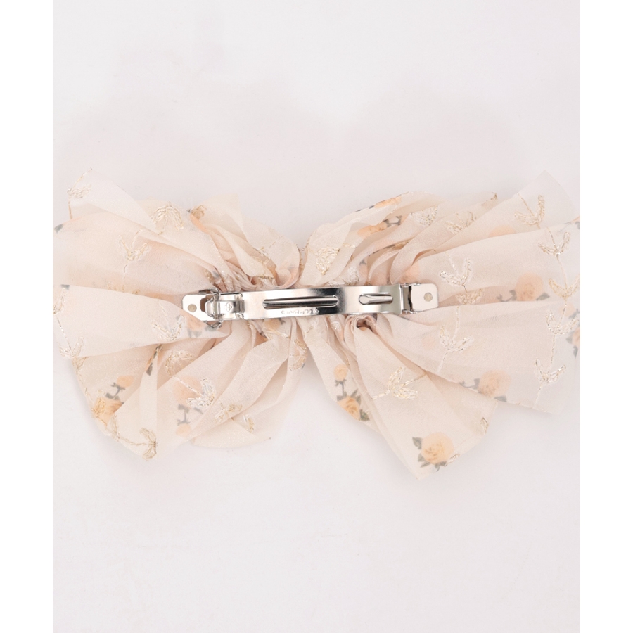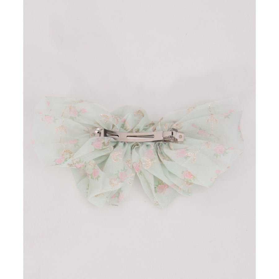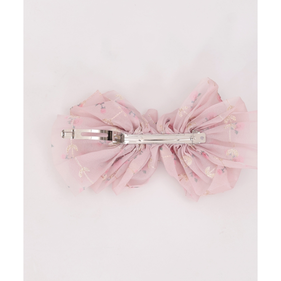 【デザイン】春らしいふんわりした色合いのリボンがロマンティックなバレッタです。花柄プリントにラメ糸を織り交ぜた刺繍もあしらわれた生地を使用しております。