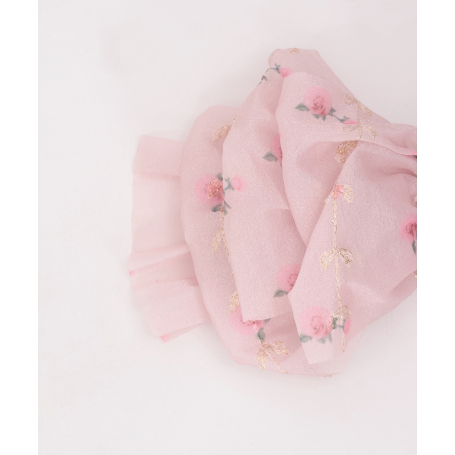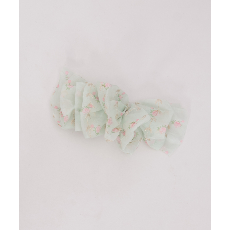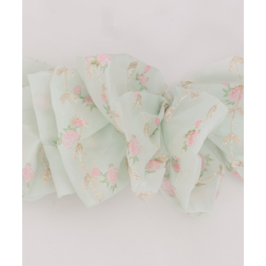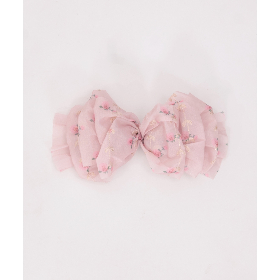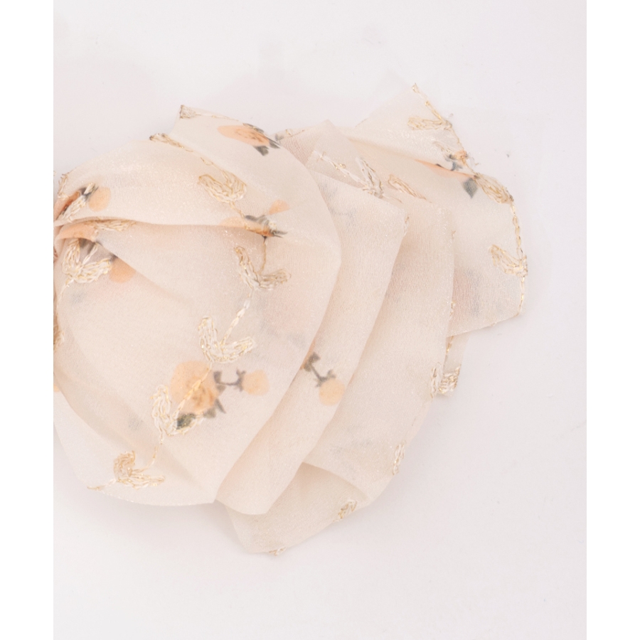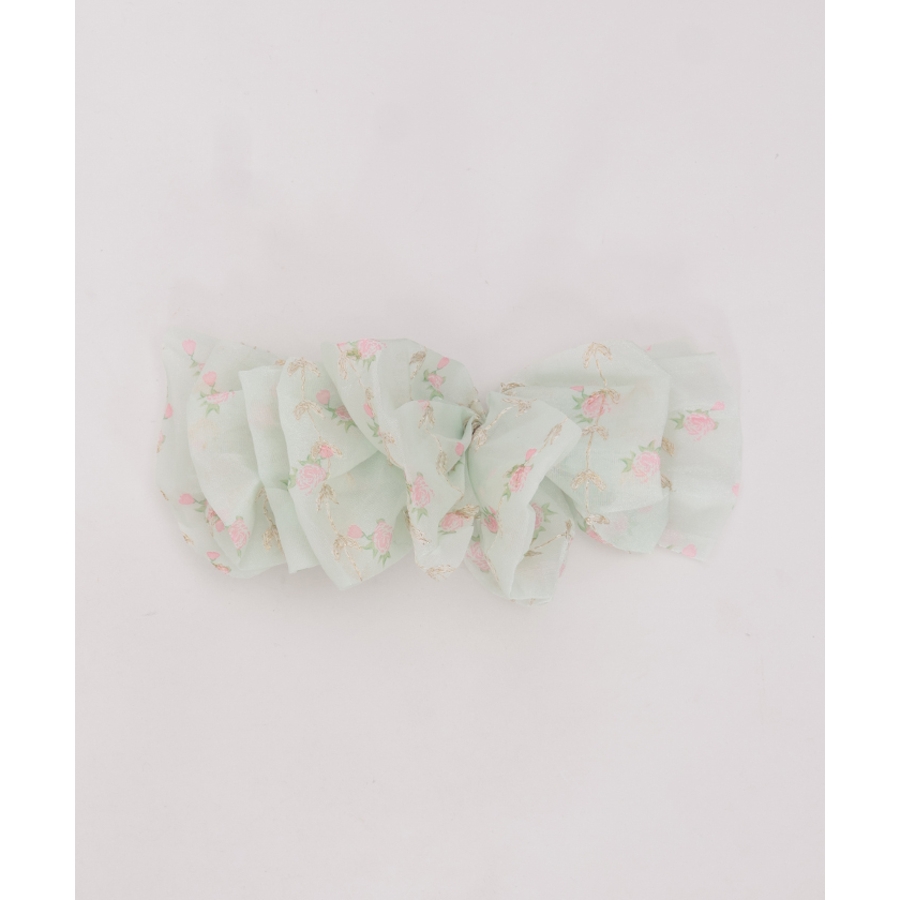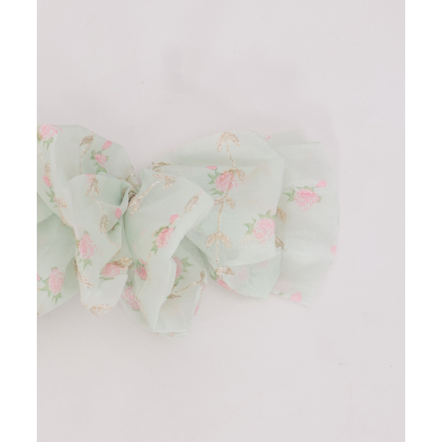 【デザイン】春らしいふんわりした色合いのリボンがロマンティックなバレッタです。花柄プリントにラメ糸を織り交ぜた刺繍もあしらわれた生地を使用しております。