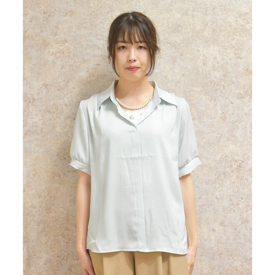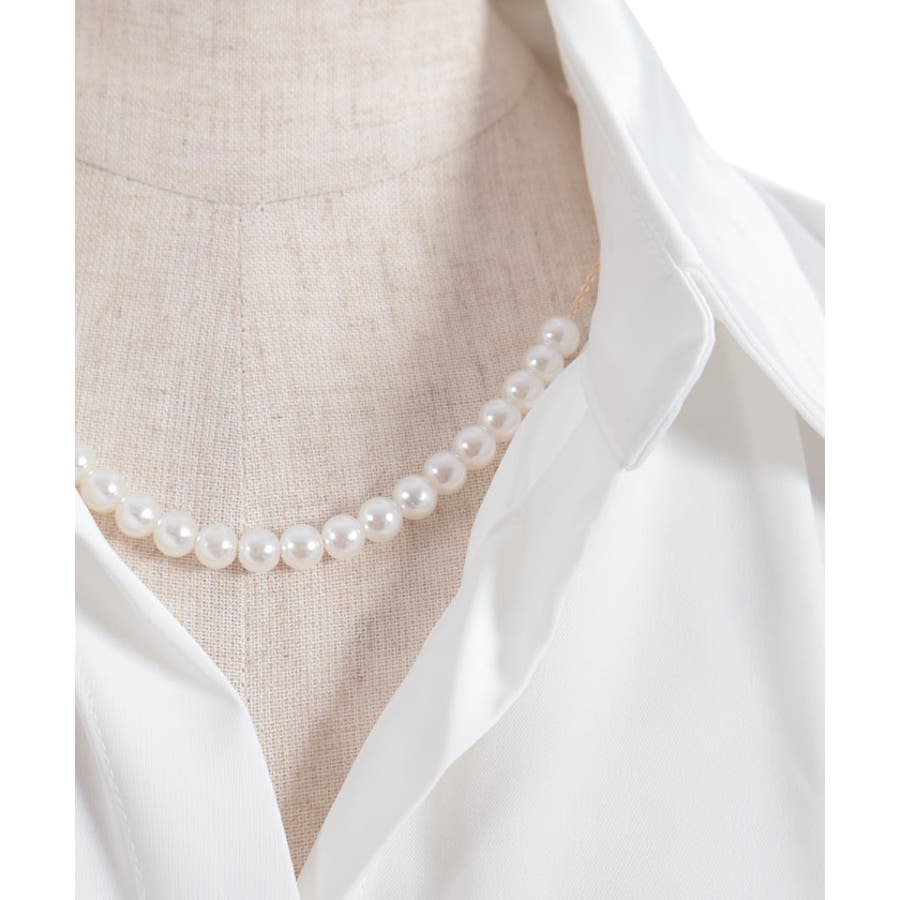 シンプルな比翼仕立てに、取り外し可能なパールアクセサリーがアクセントになった上品シャツ。