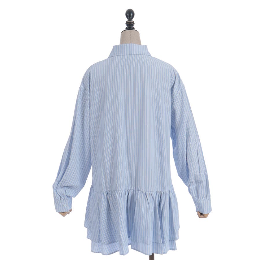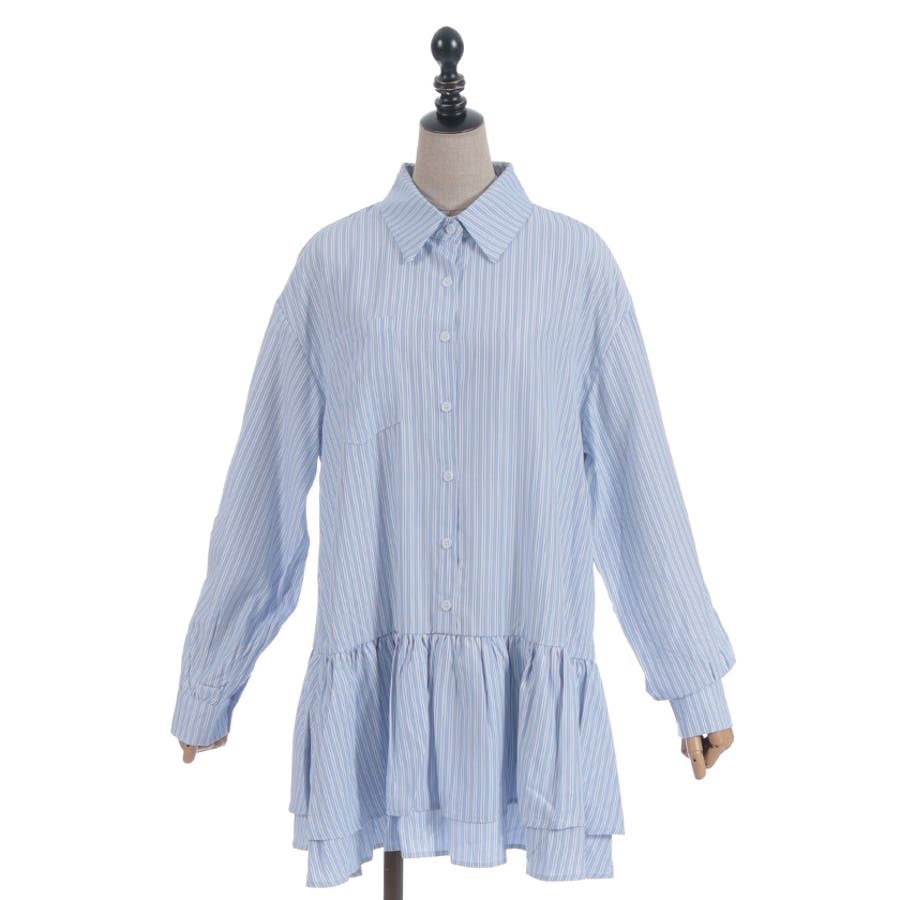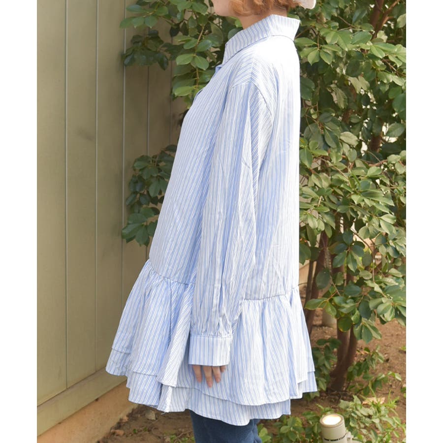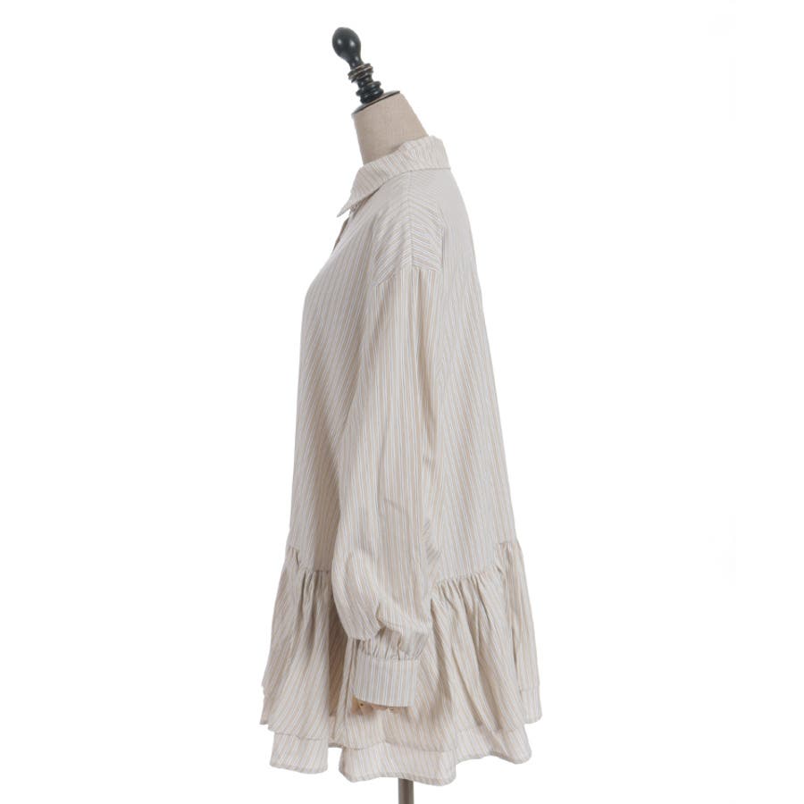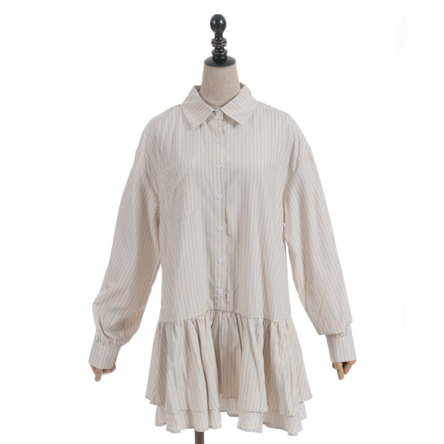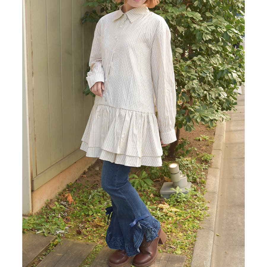シャツ襟とフロントボタンで程よくきれいめに仕上げつつ、裾のフリル切替がふんわりとした立体感をプラスします。腰まわりを自然にカバーできる丈感で、さらっと着るだけでバランスよく決まる一着です。
