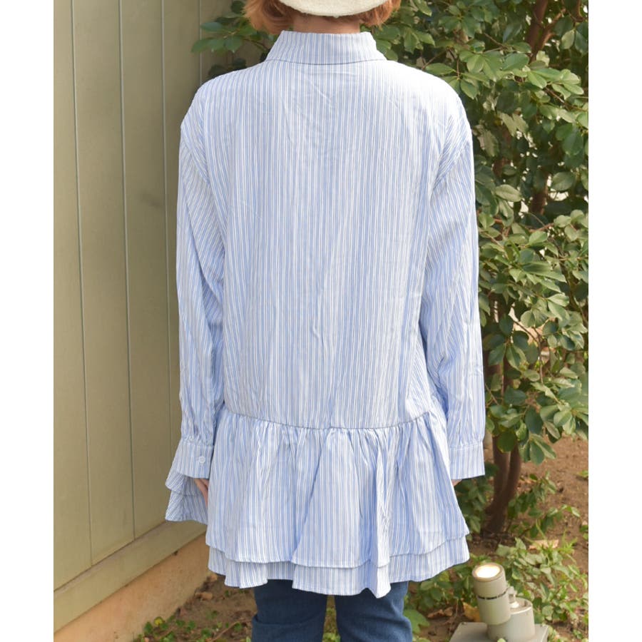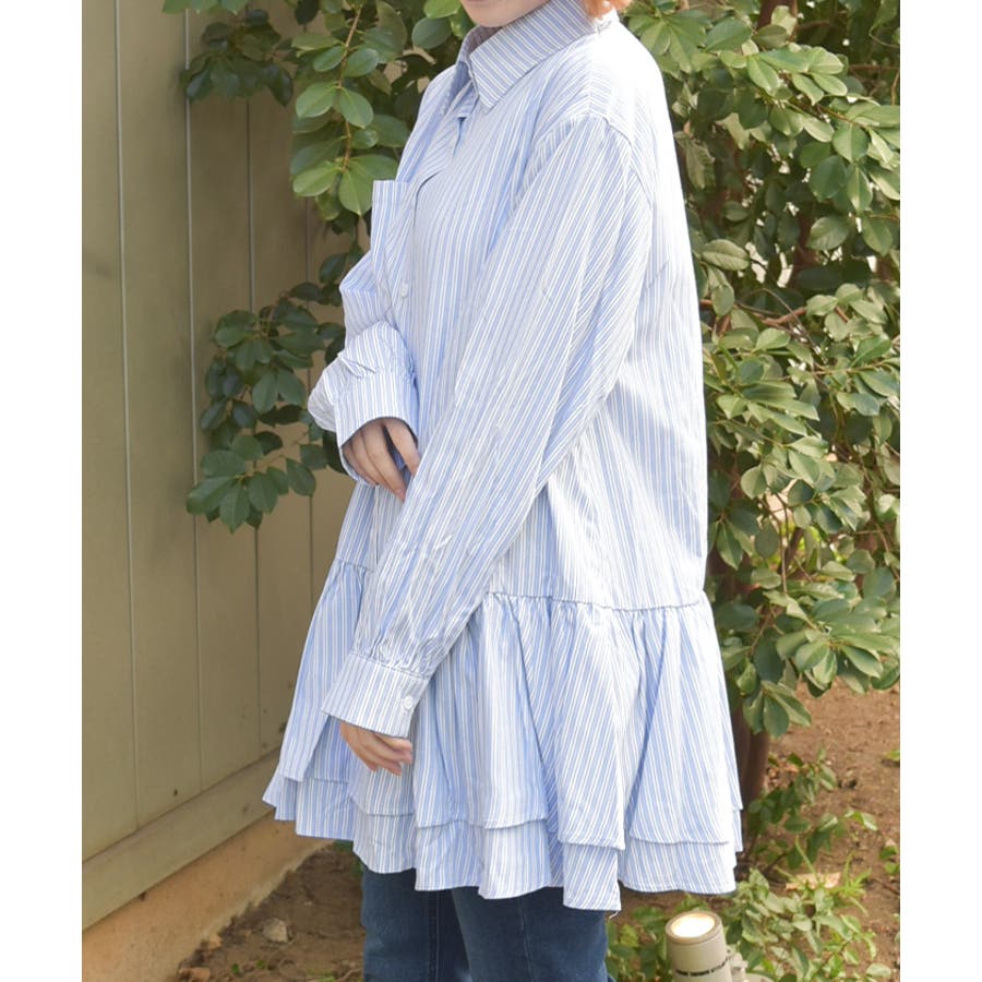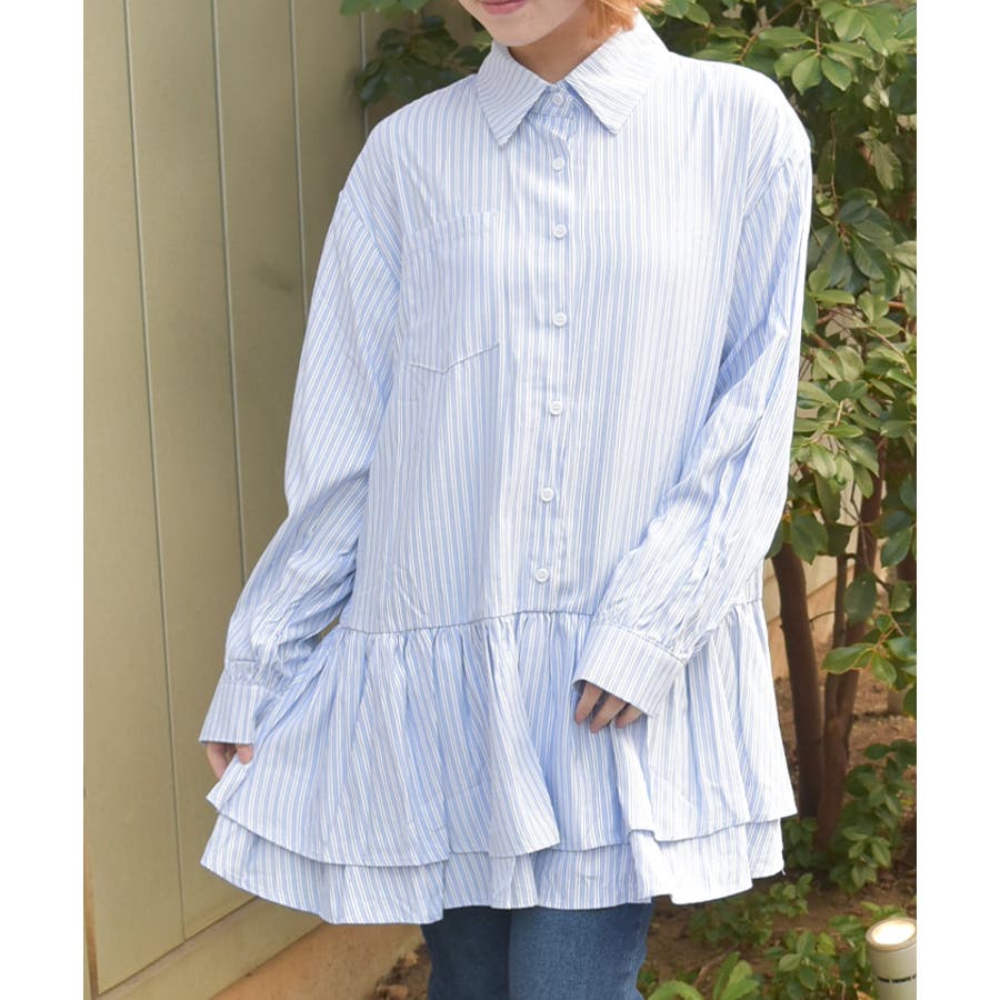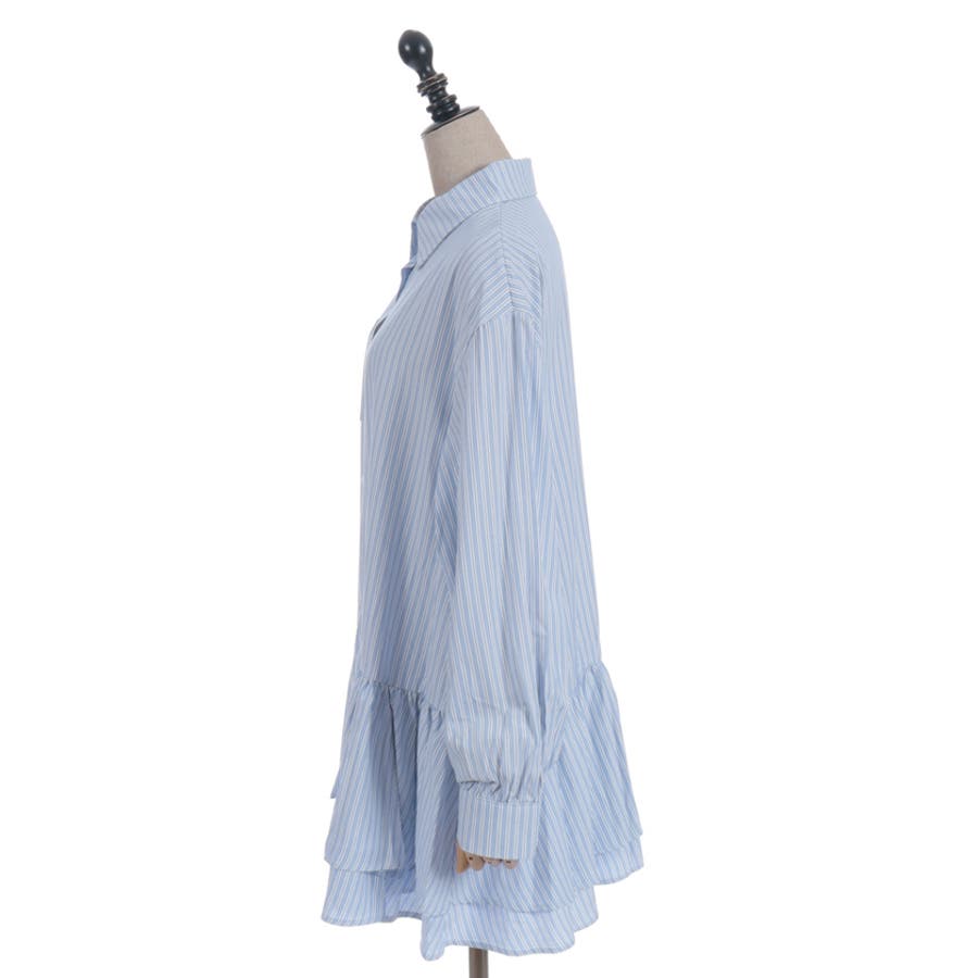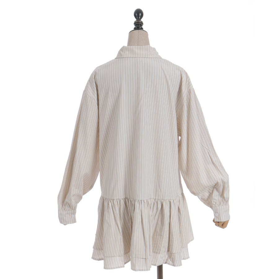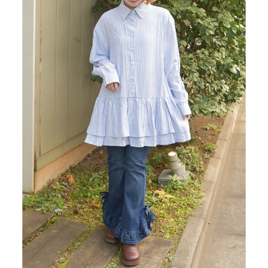 シャツ襟とフロントボタンで程よくきれいめに仕上げつつ、裾のフリル切替がふんわりとした立体感をプラスします。腰まわりを自然にカバーできる丈感で、さらっと着るだけでバランスよく決まる一着です。
