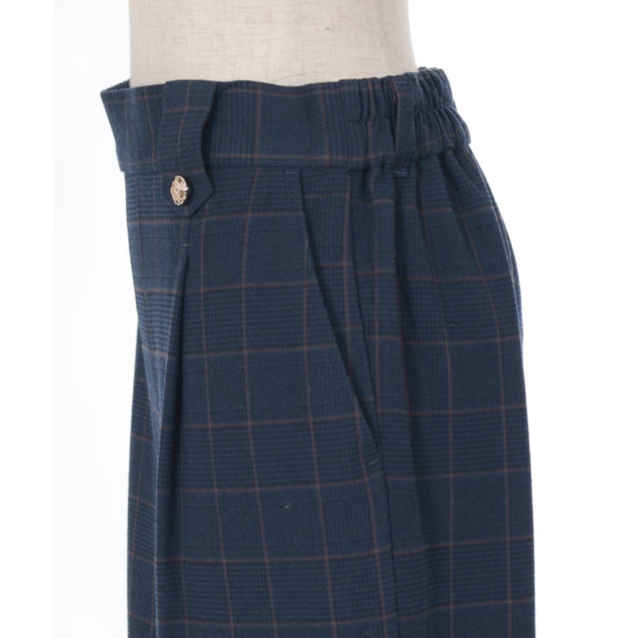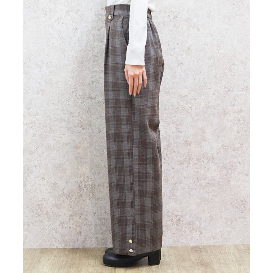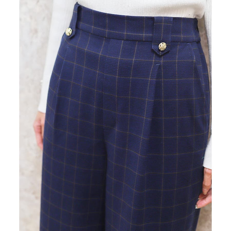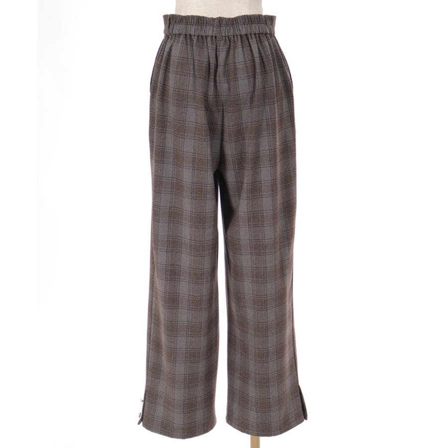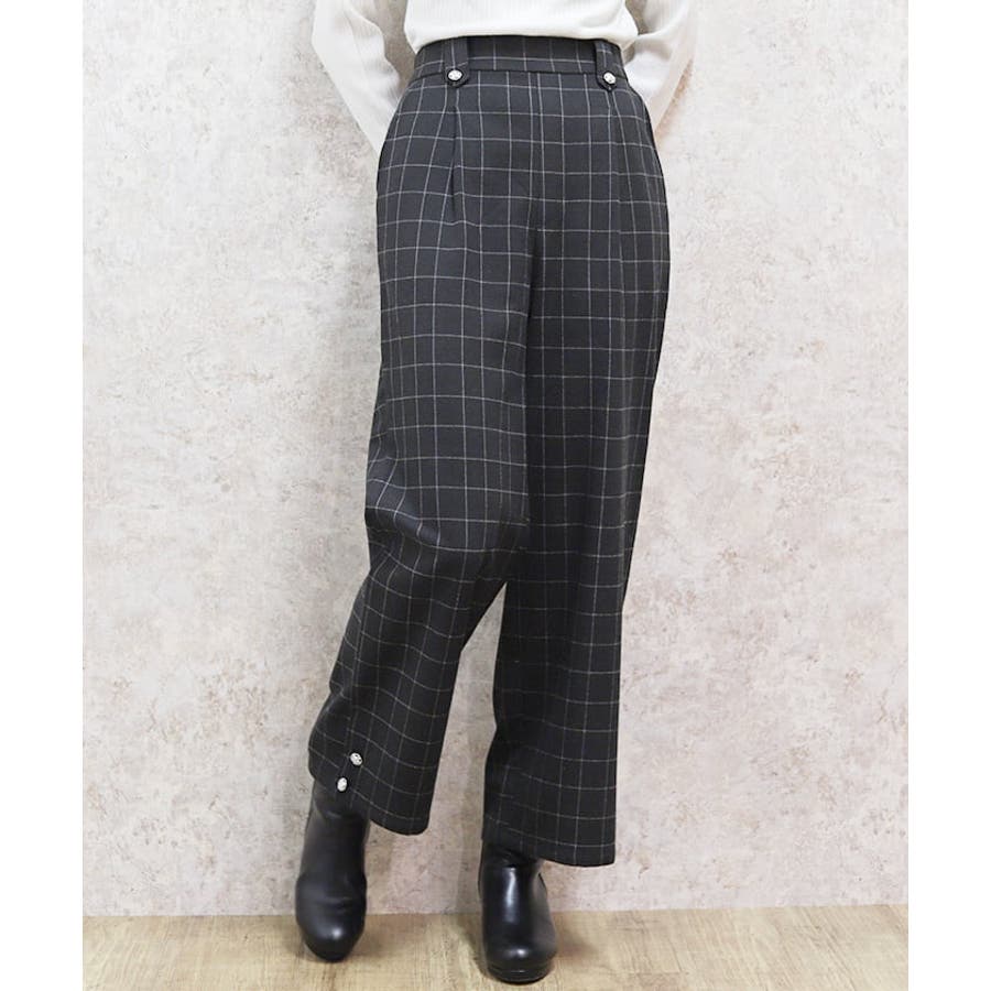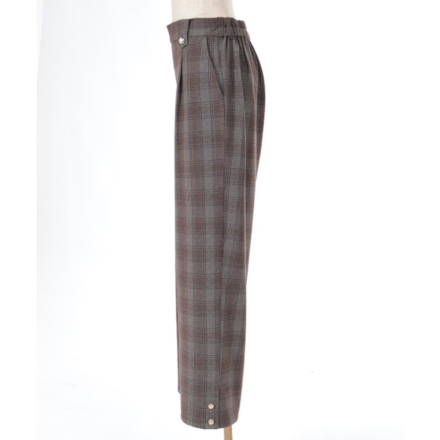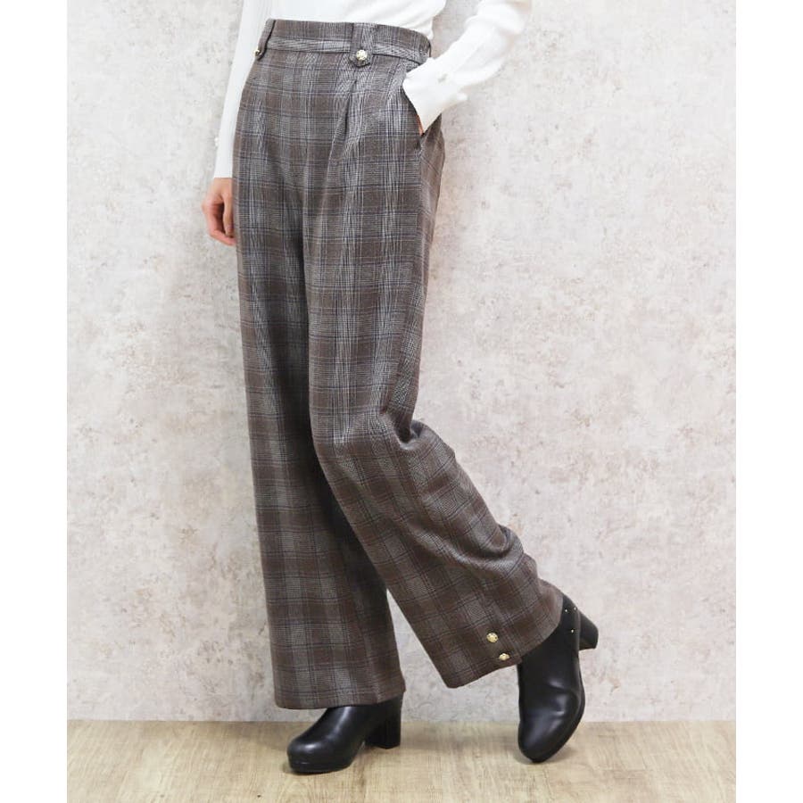 裾釦起毛チェックワイドパンツ