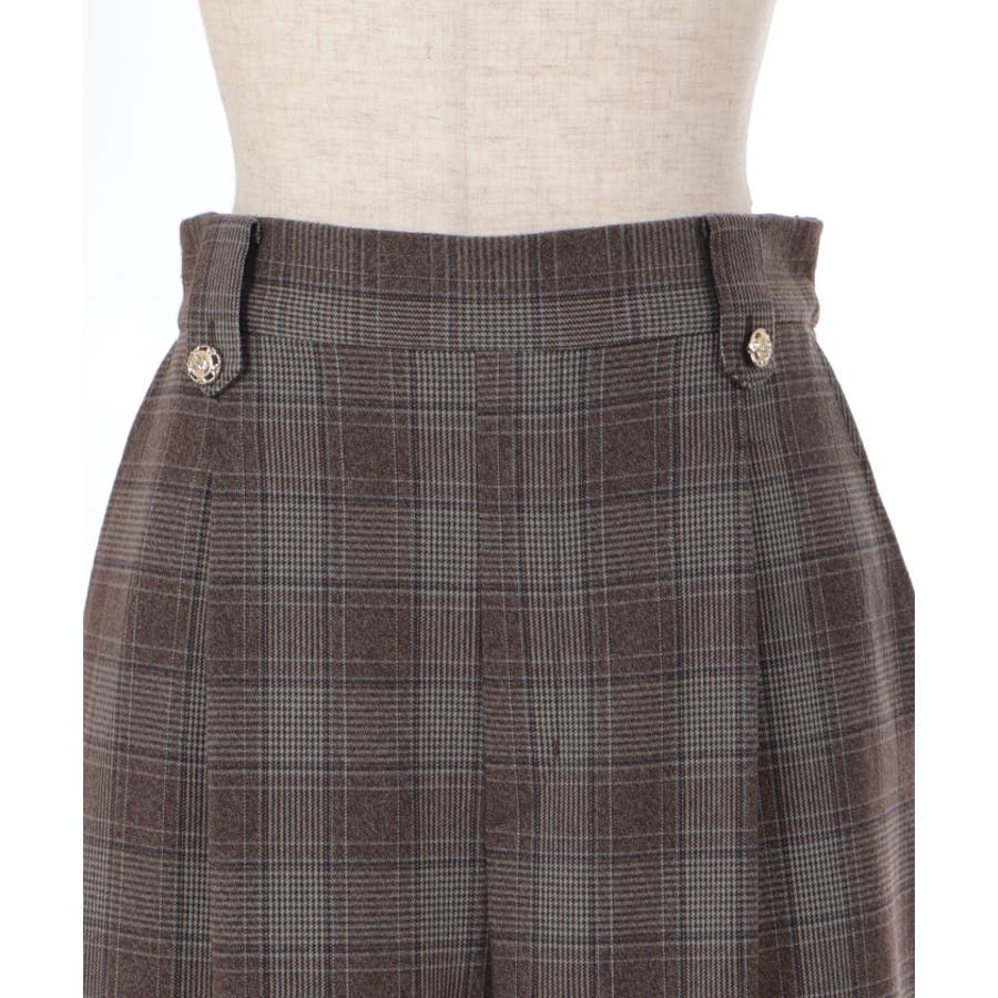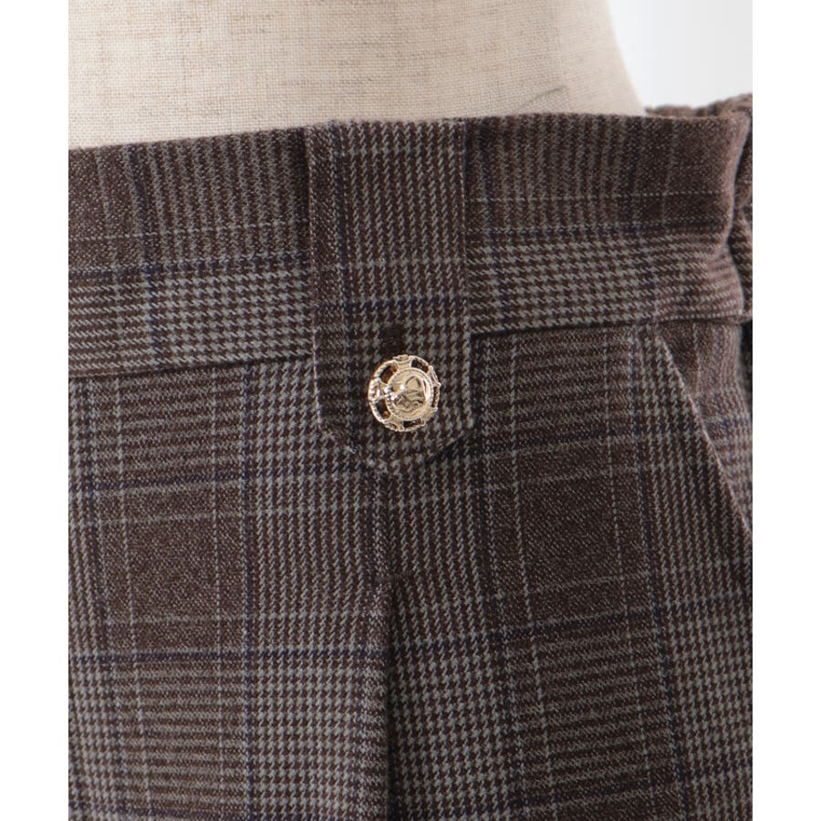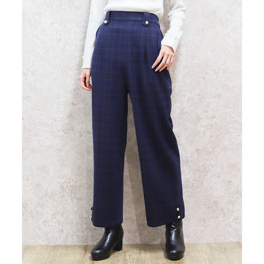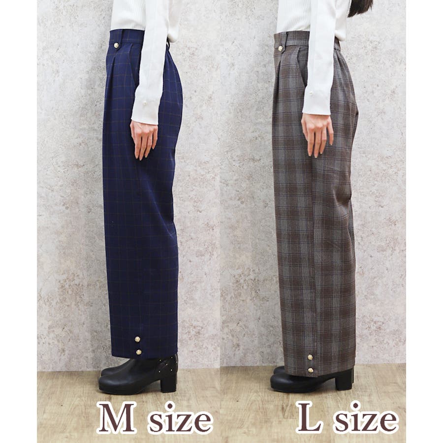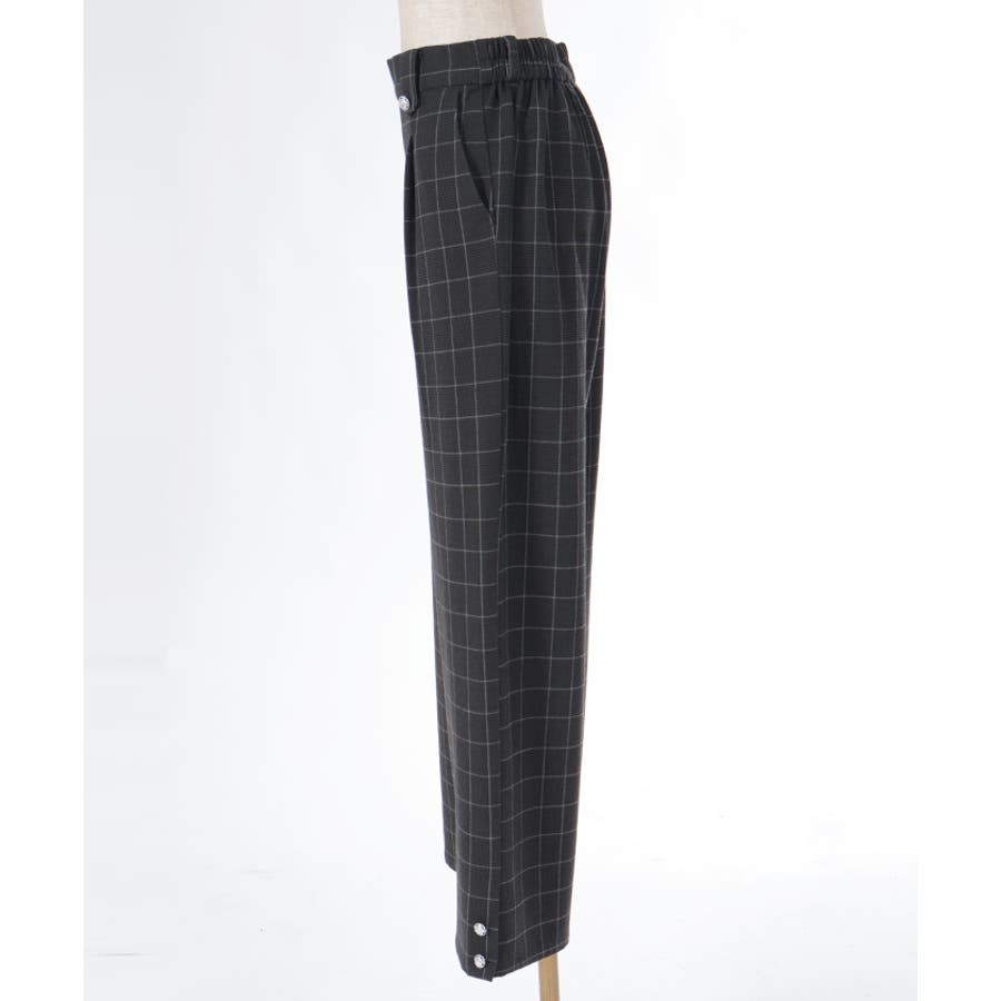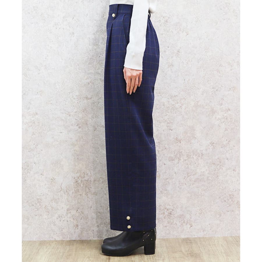 裾釦起毛チェックワイドパンツ