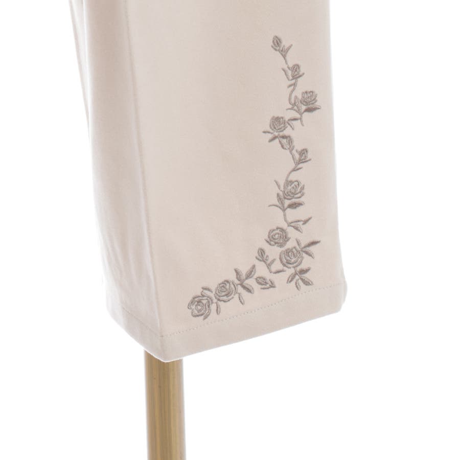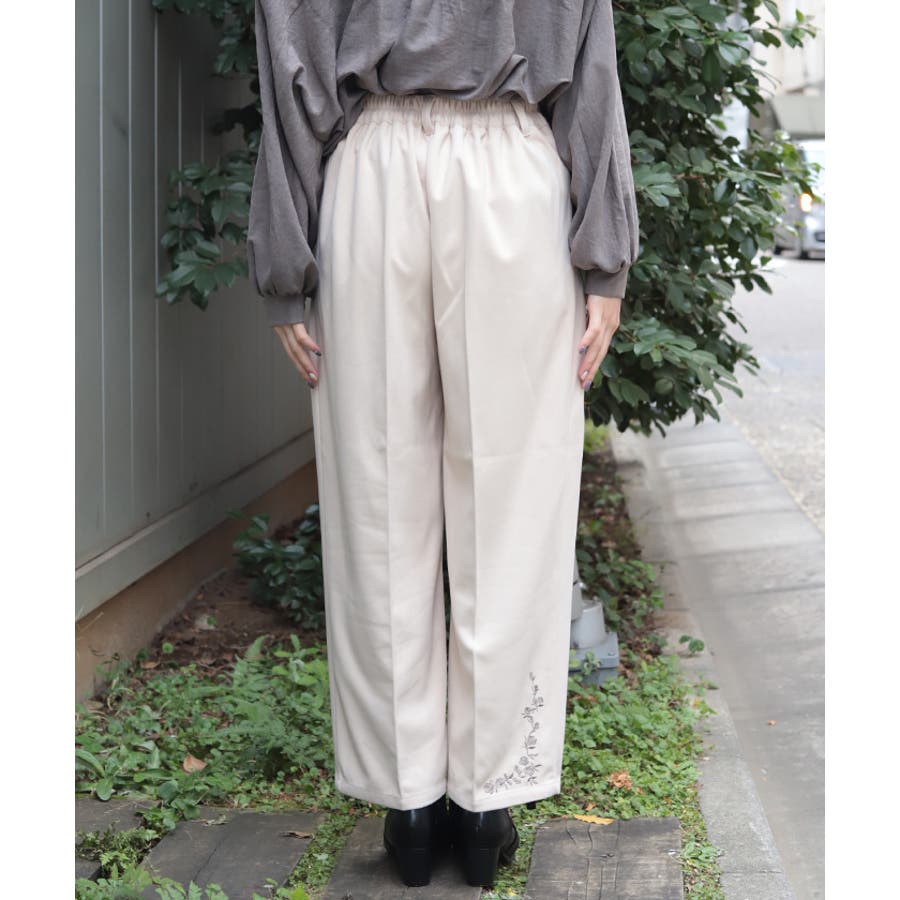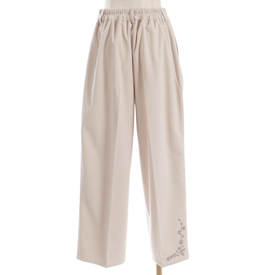 後ろパンツの片側にだけあしらわれたバラモチーフの刺繍が、品よく淑やかなアクセントに。シンプルな中にフェミニンさを忍ばせた、axes femmeらしいさりげないこだわりが光ります。程よいワイド感で脚のラインを拾いにくく、スタイルアップも期待できます。