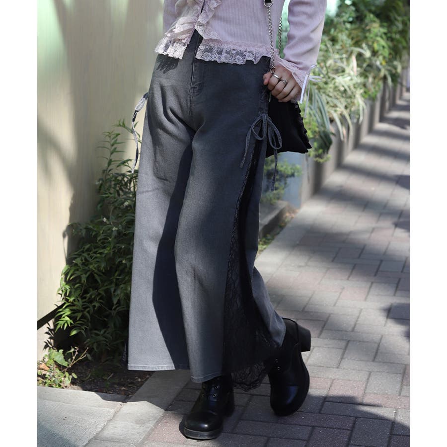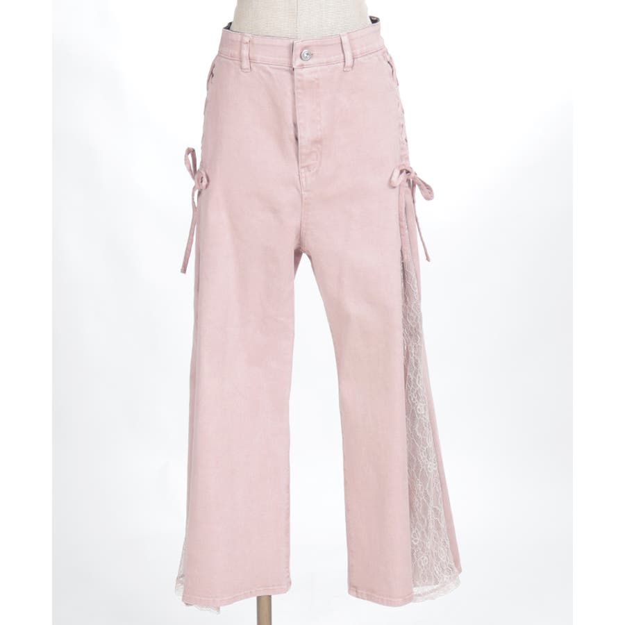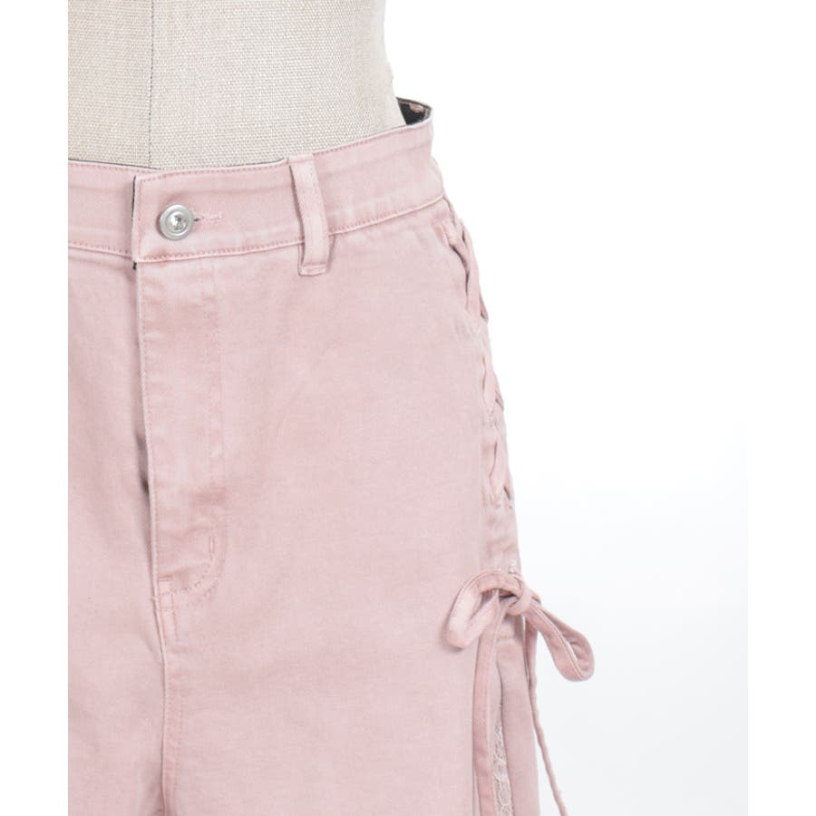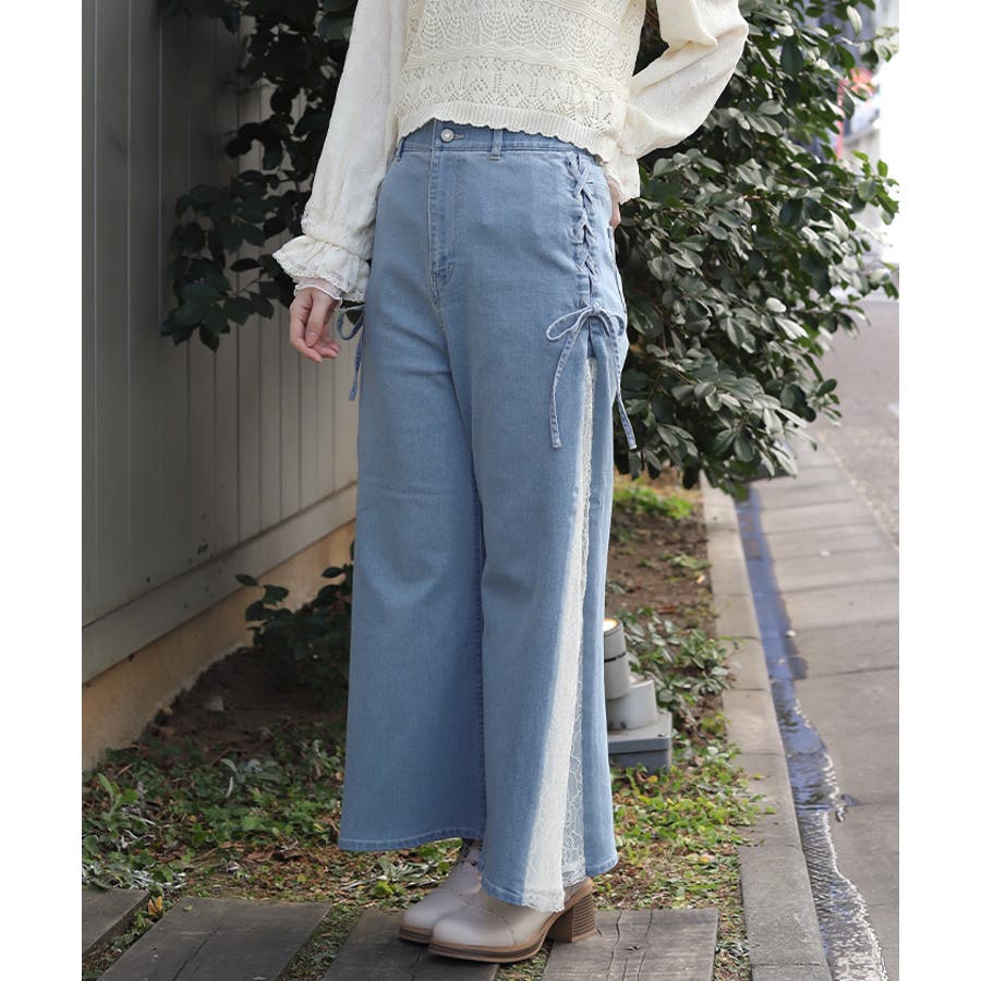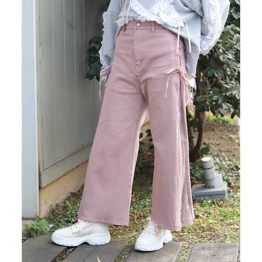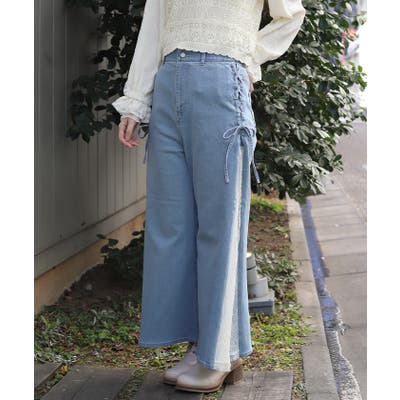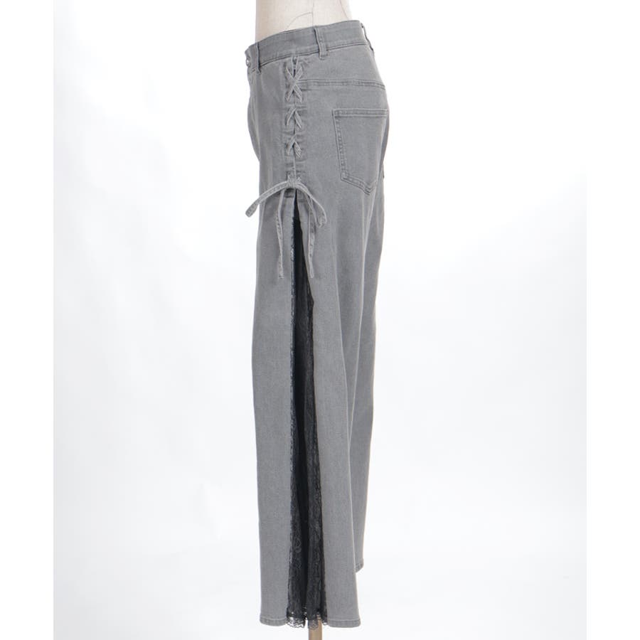 サイドにレースアップとレース素材の切替をあしらい、さりげなくフェミニン感がアクセントになったデザインパンツ。