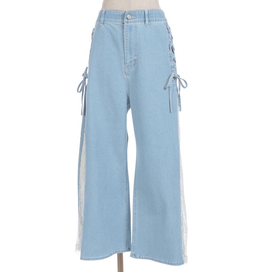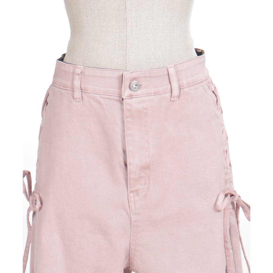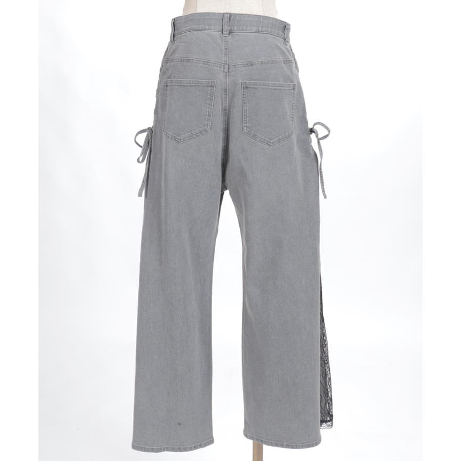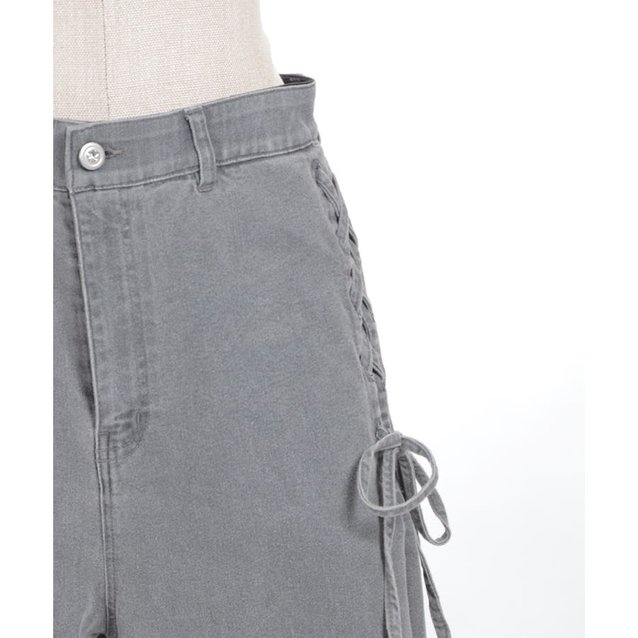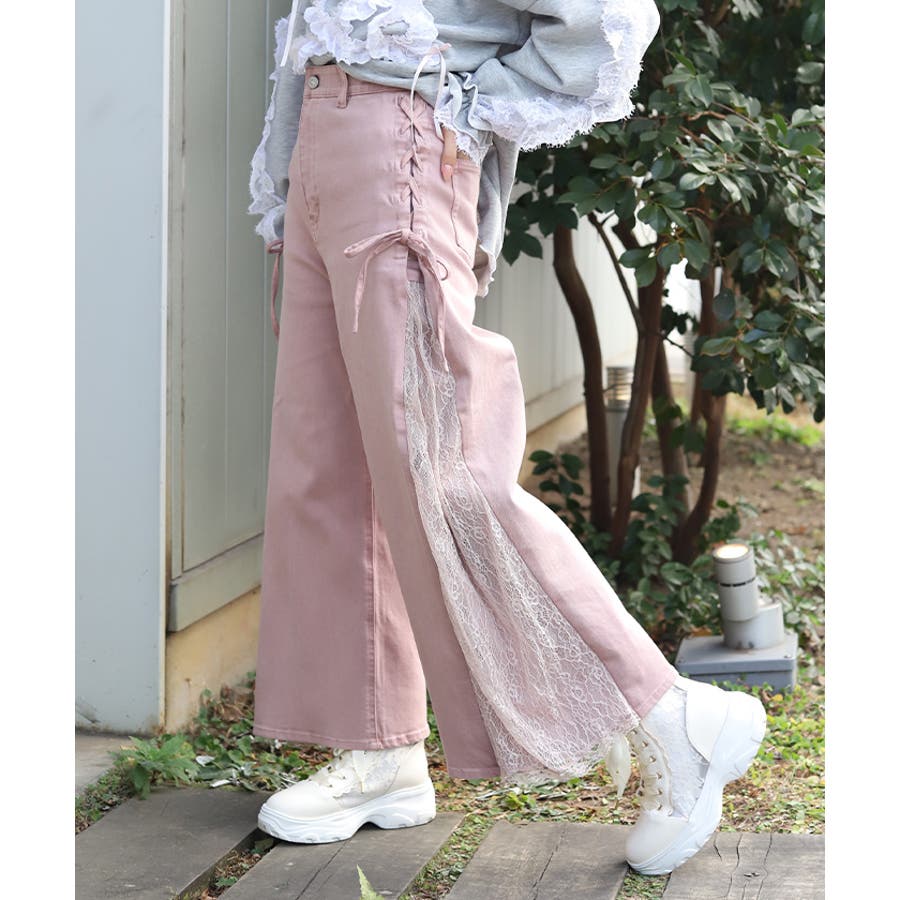 サイドにレースアップとレース素材の切替をあしらい、さりげなくフェミニン感がアクセントになったデザインパンツ。