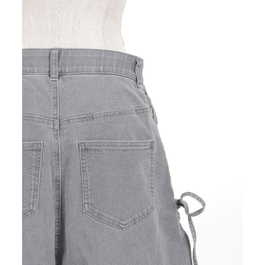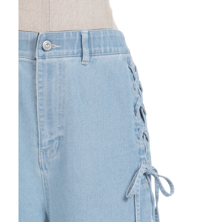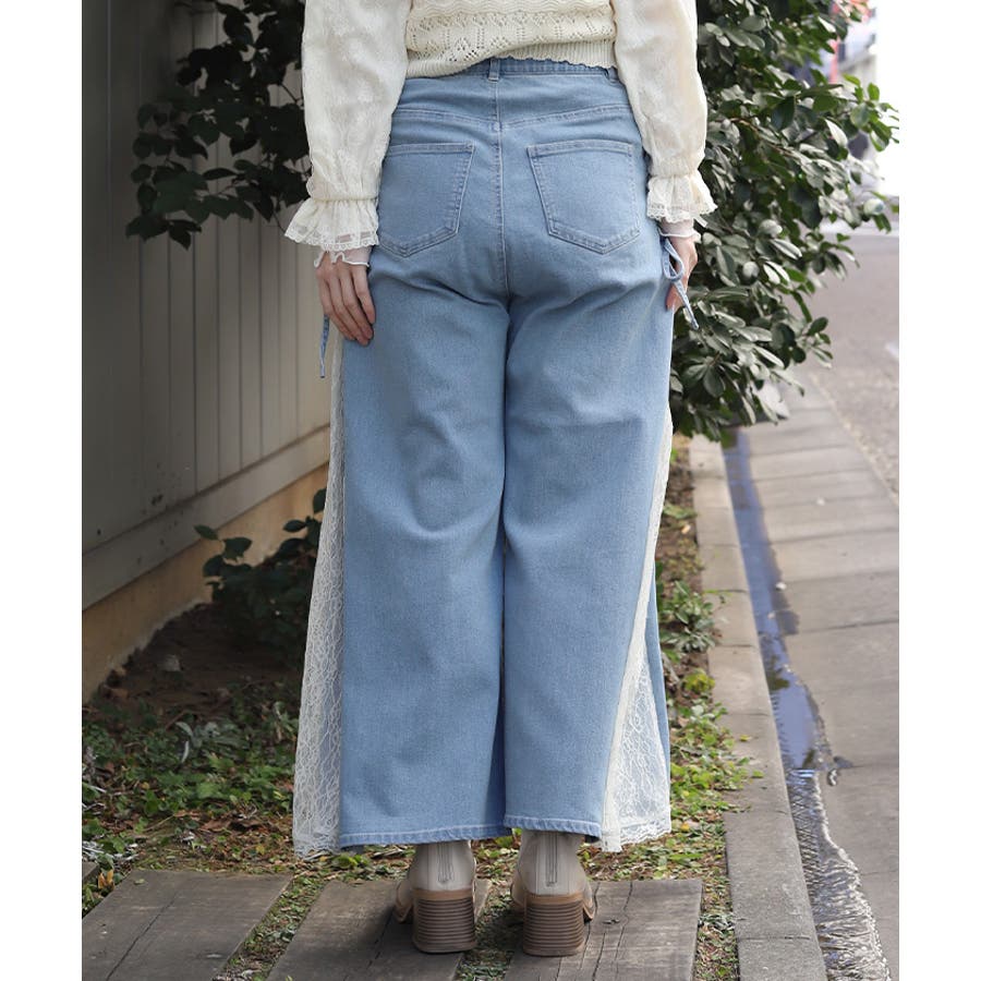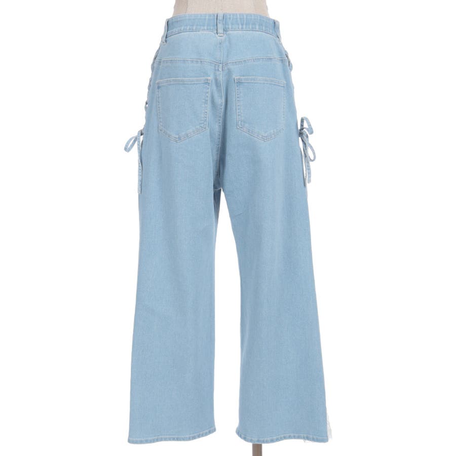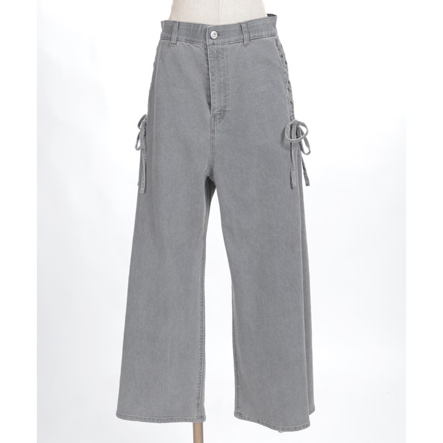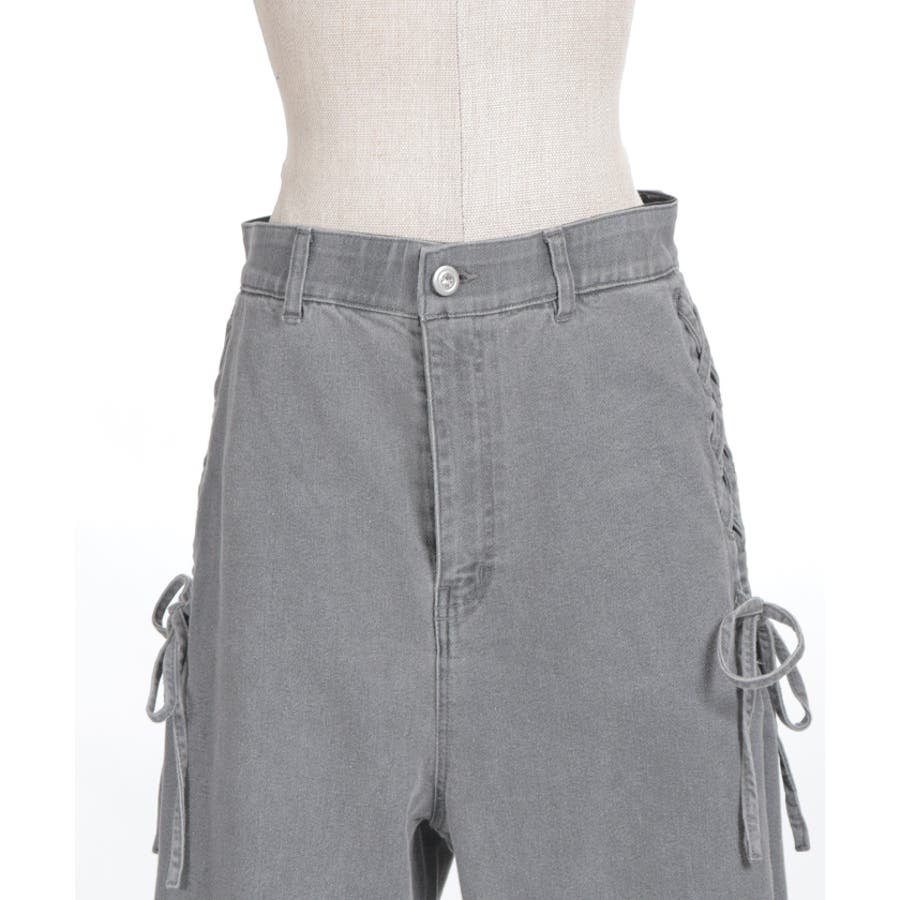 サイドにレースアップとレース素材の切替をあしらい、さりげなくフェミニン感がアクセントになったデザインパンツ。