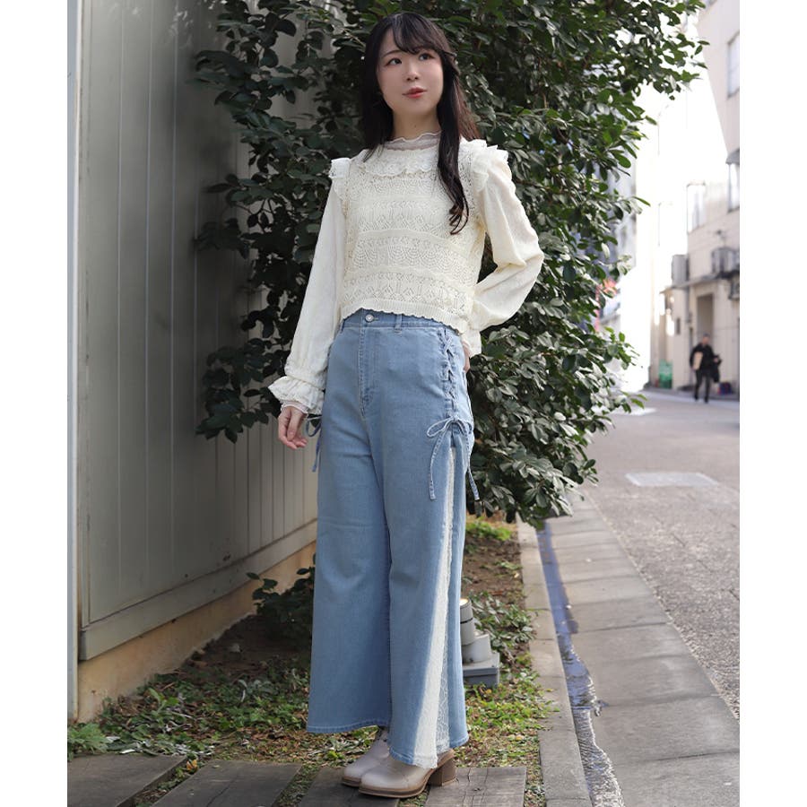 ワイドストレートシルエットで体のラインを拾いにくく、リラックス感がありながらもすっきりとした印象に仕上げています。レース切替が軽やかなアクセントとなり、ラフさの中にフェミニンさを感じられる一着です。