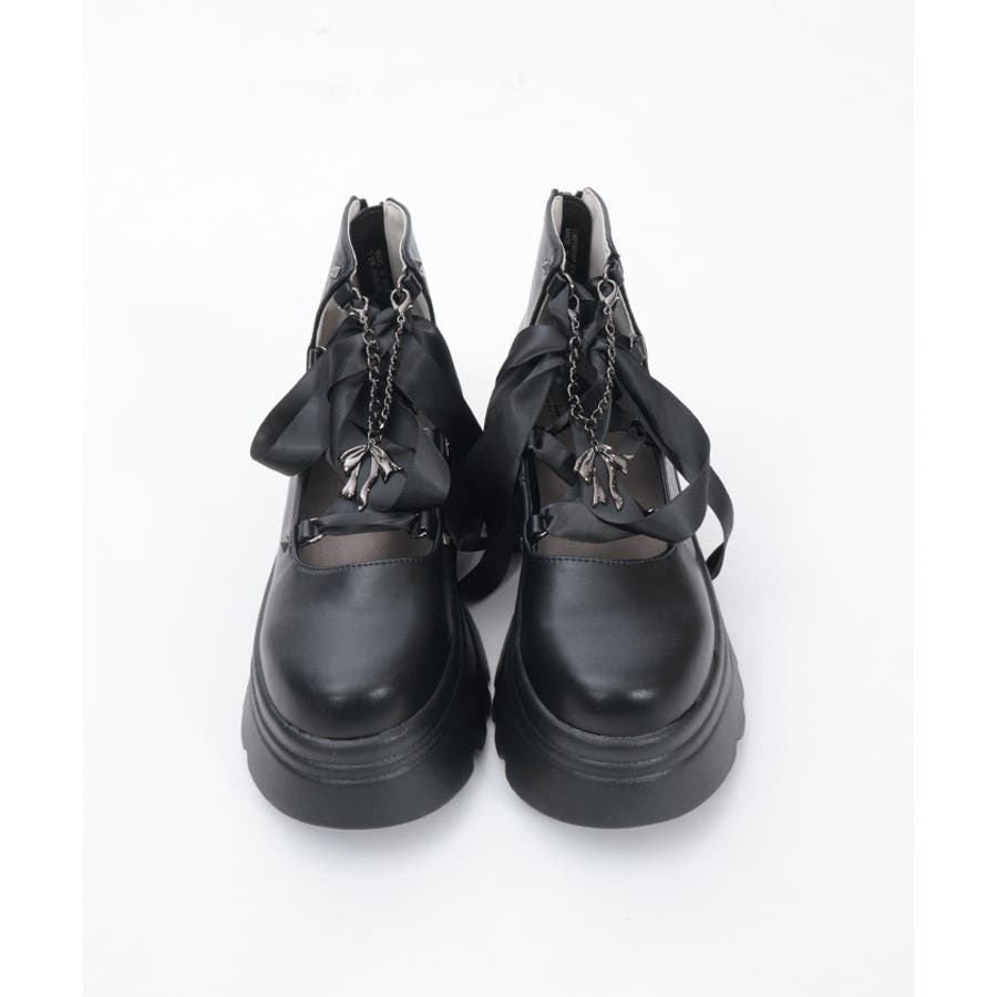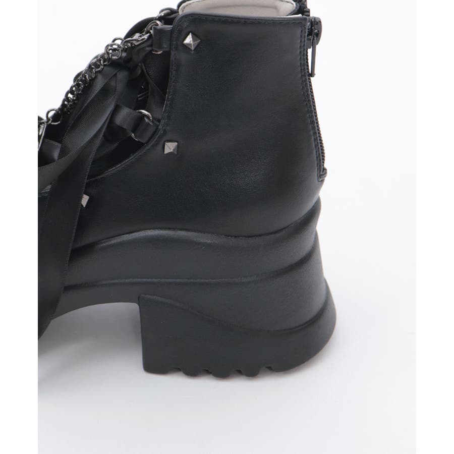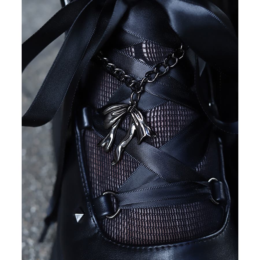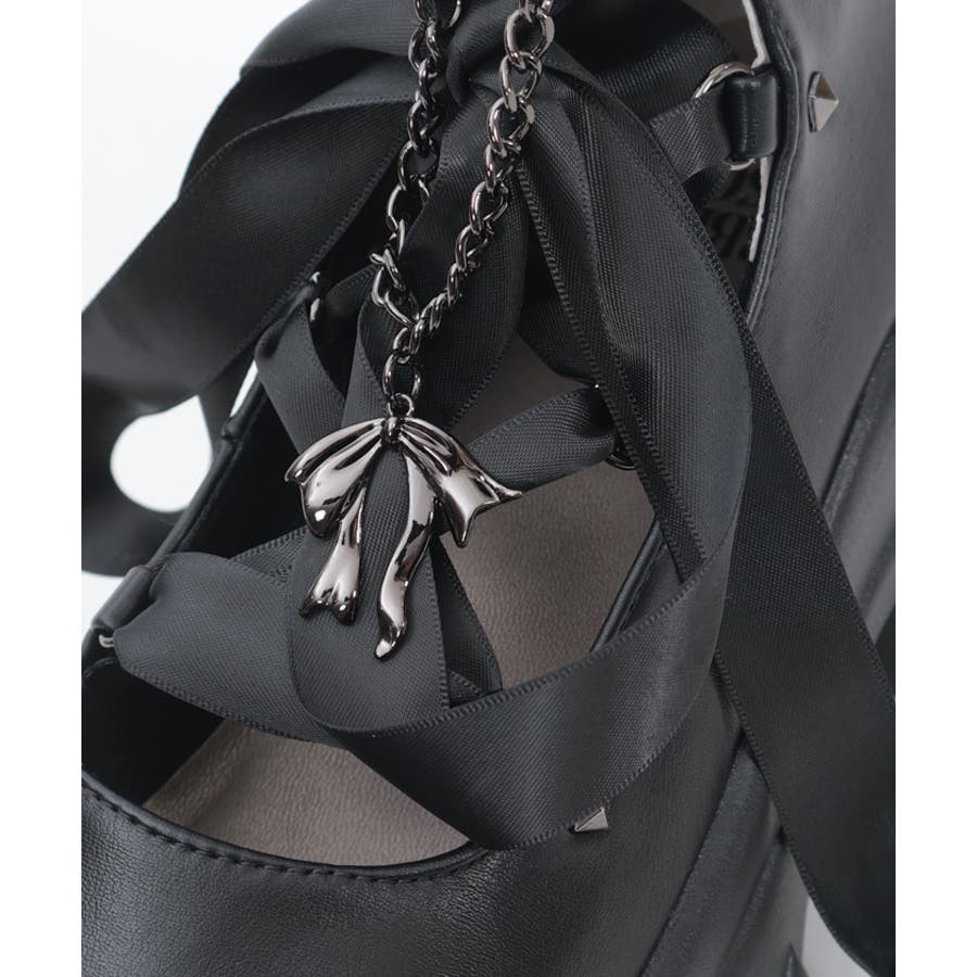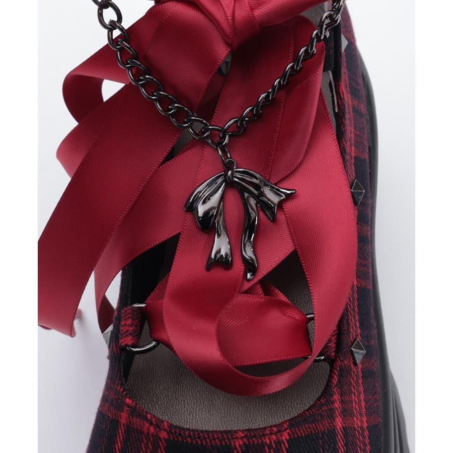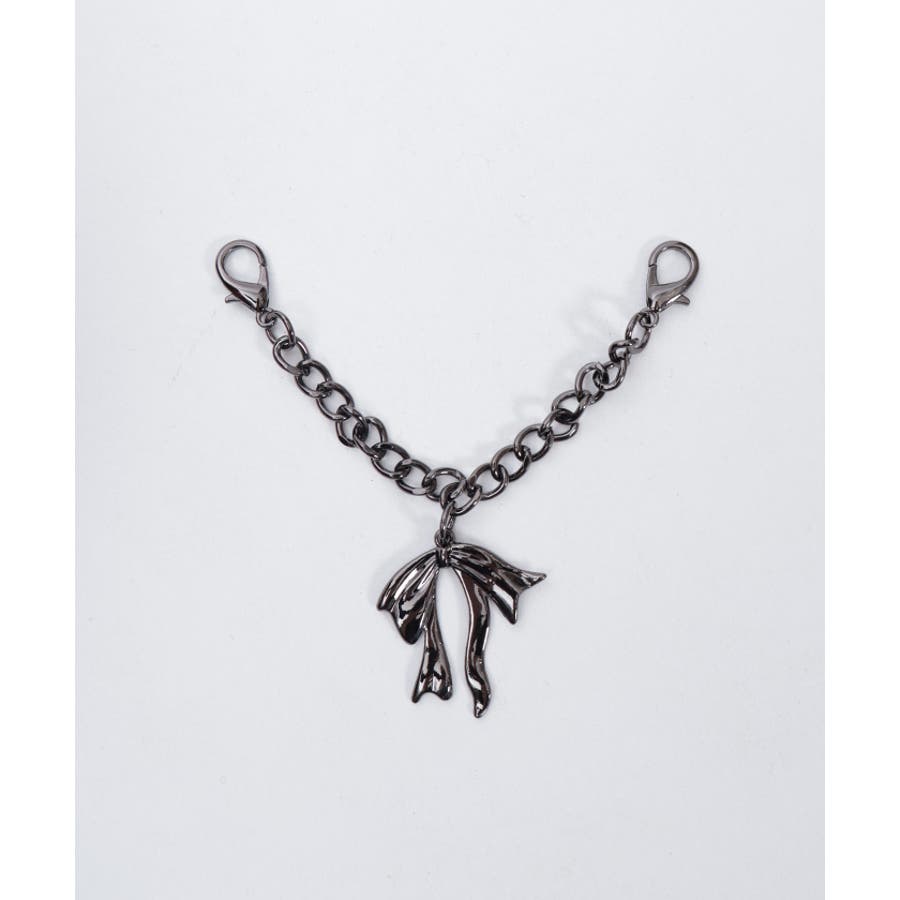 小さめスタッズとリボンチャーム付きのチェーンが辛口なアクセントになっています。