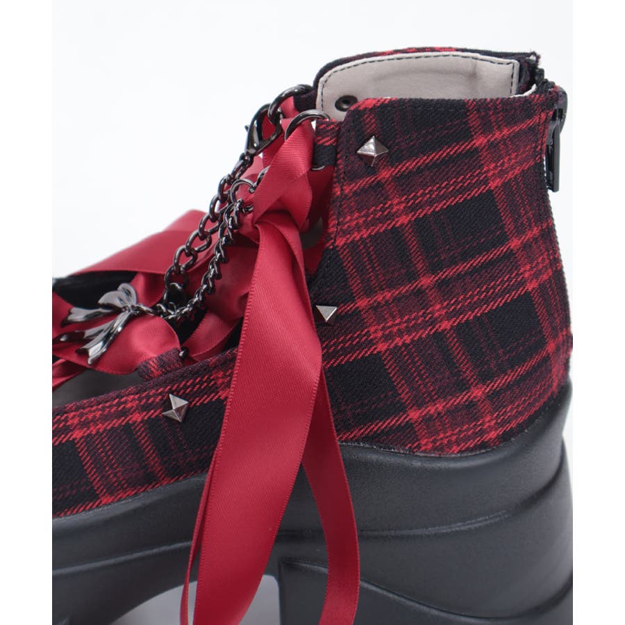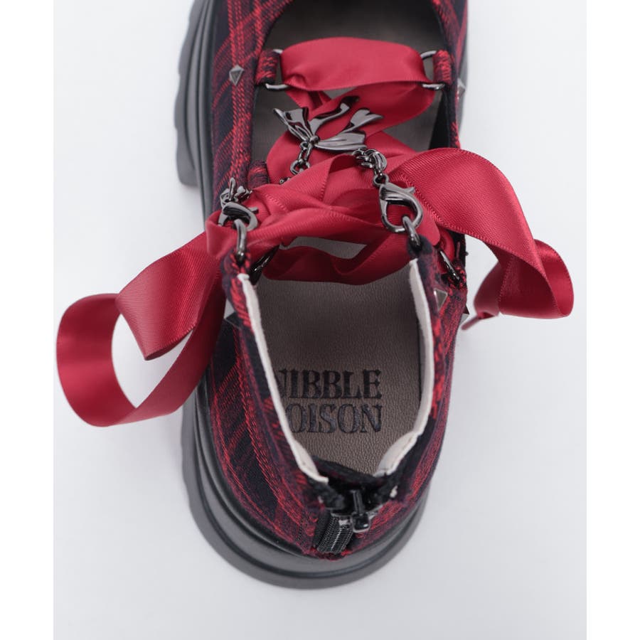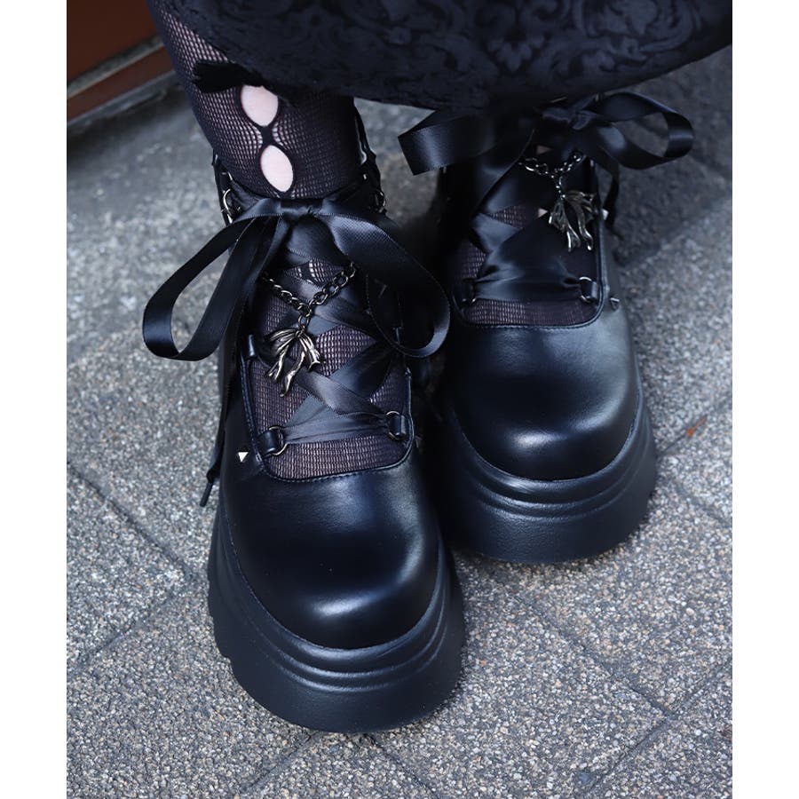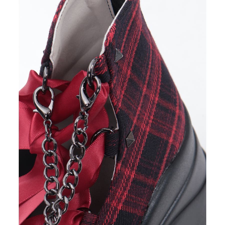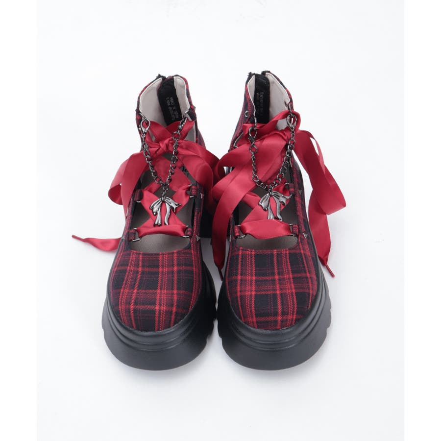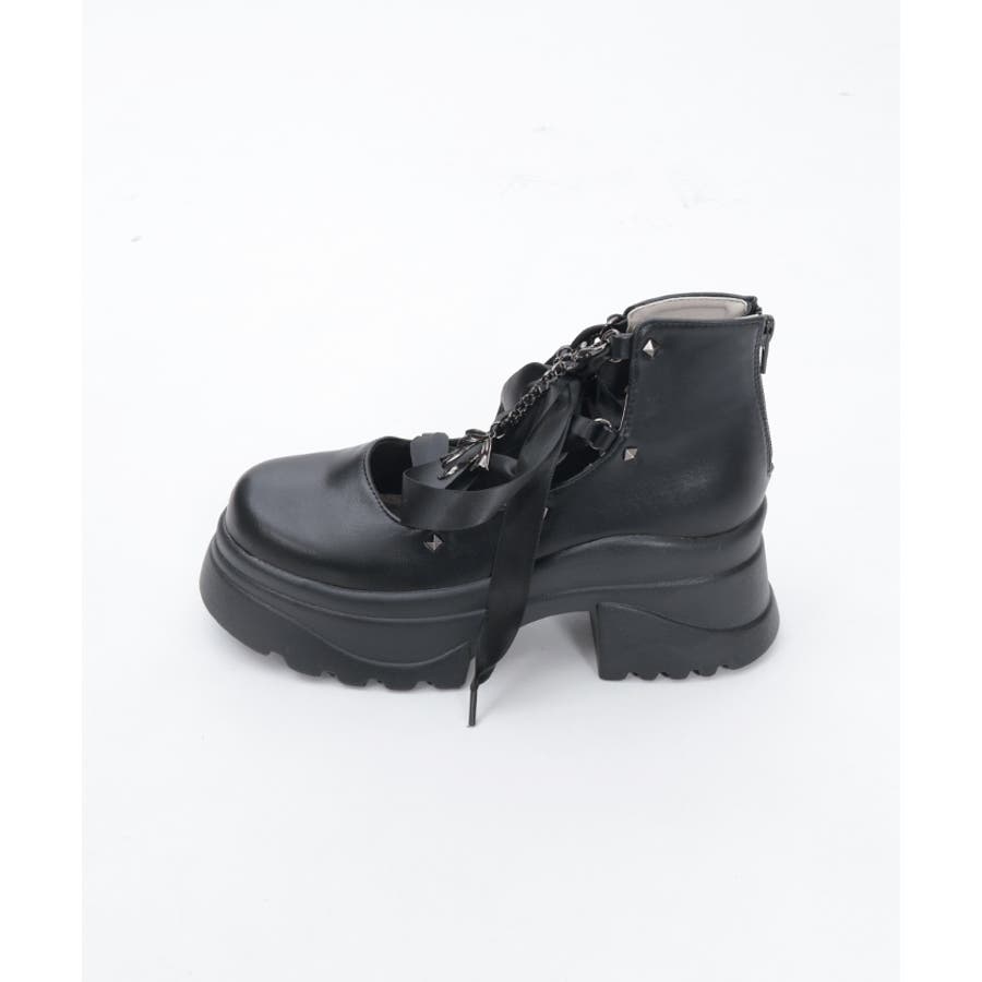 小さめスタッズとリボンチャーム付きのチェーンが辛口なアクセントになっています。