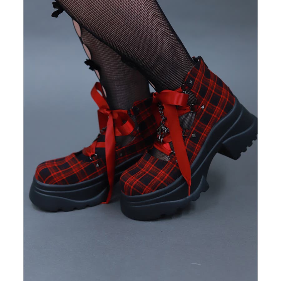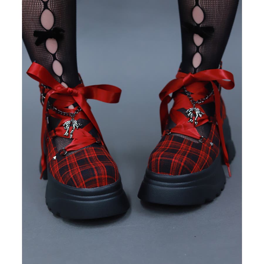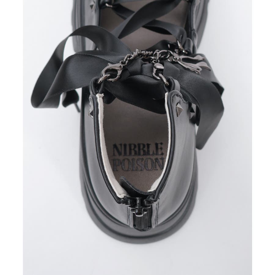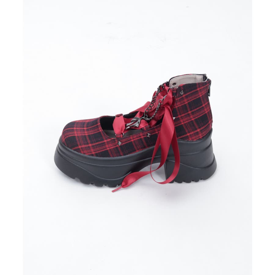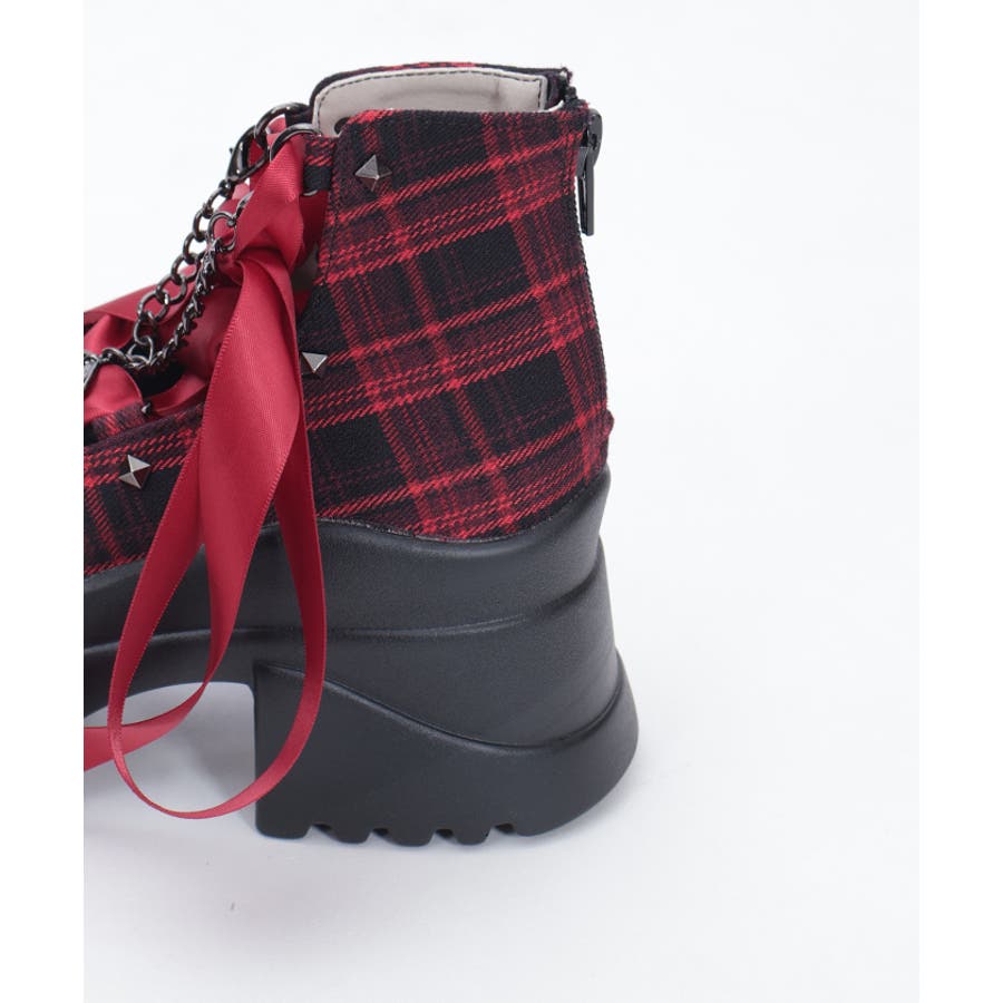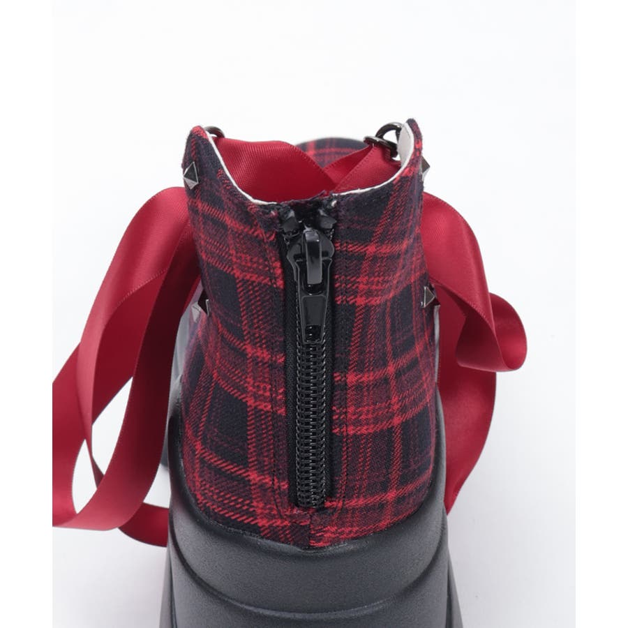 小さめスタッズとリボンチャーム付きのチェーンが辛口なアクセントになっています。