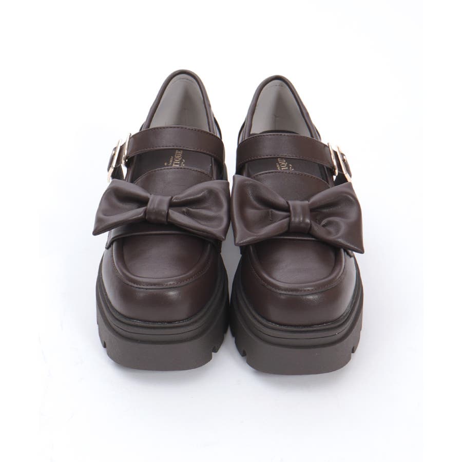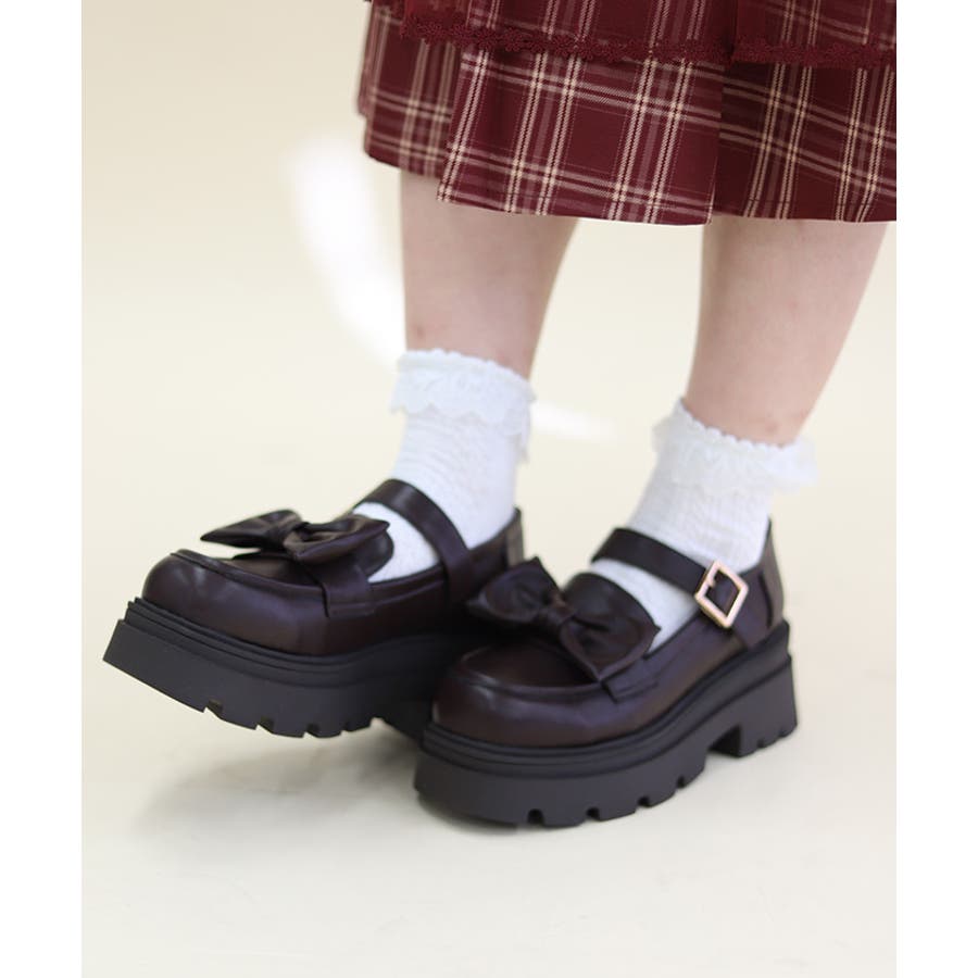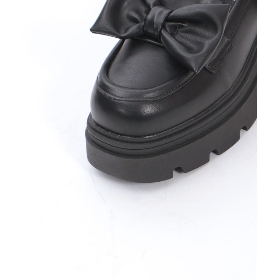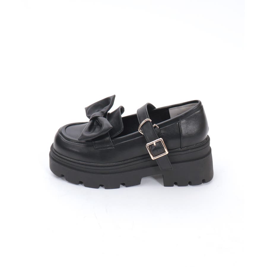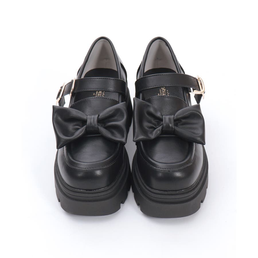スクエアトゥに大き目リボンを合わせて甘すぎずモードにもフレンチガーリーなコーデにも合わせやすいデザインです。かかととつま先に高低差が少ない厚みのあるソールでスタイルアップできます。