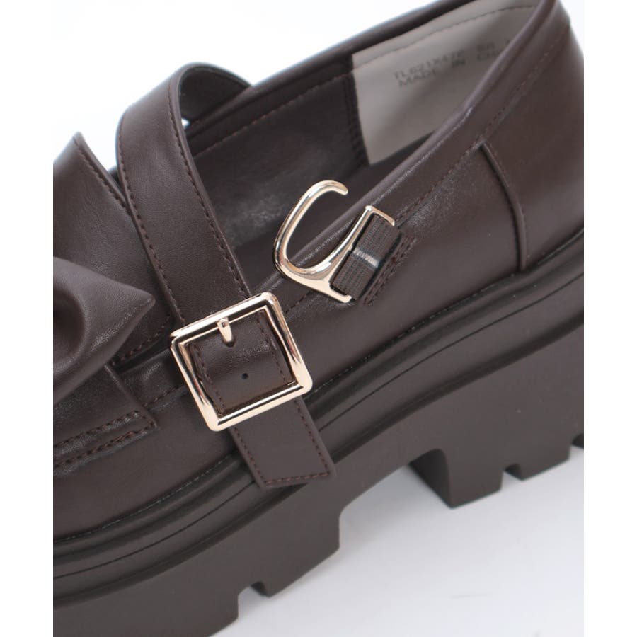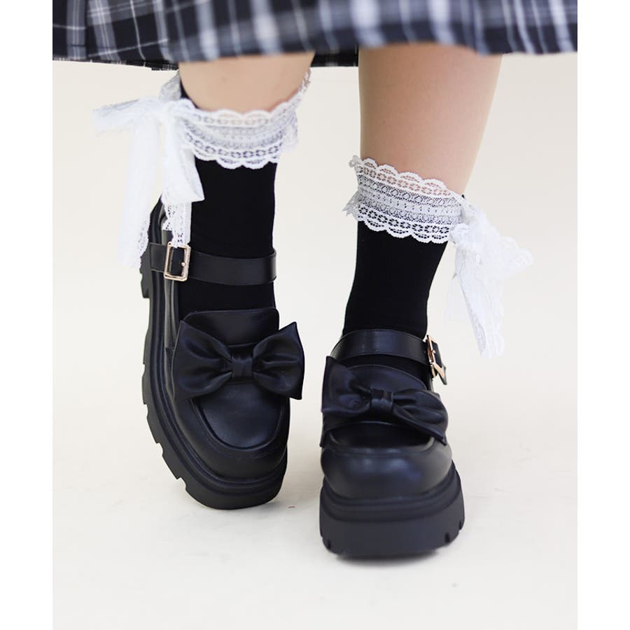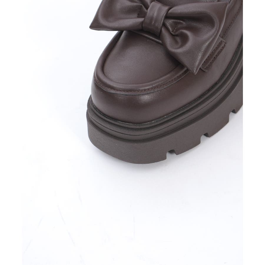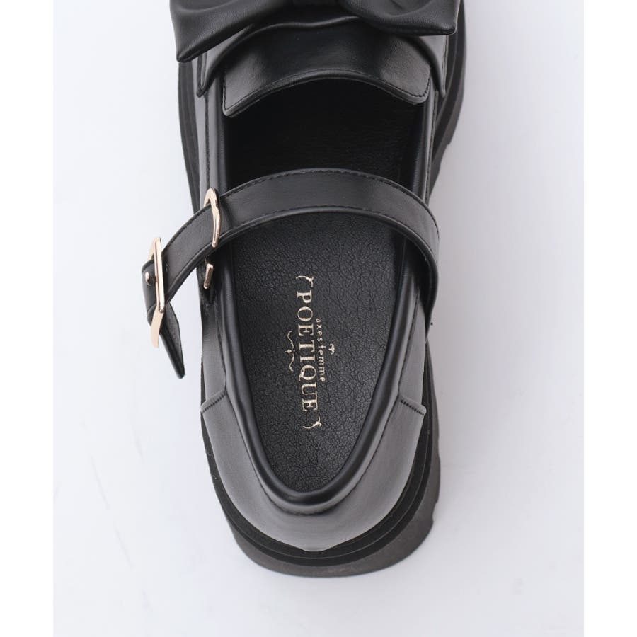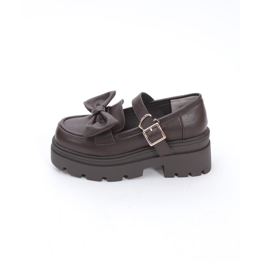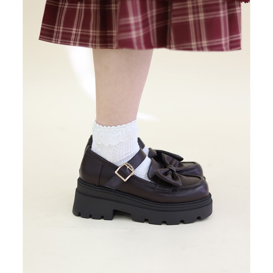 スクエアトゥに大き目リボンを合わせて甘すぎずモードにもフレンチガーリーなコーデにも合わせやすいデザインです。かかととつま先に高低差が少ない厚みのあるソールでスタイルアップできます。