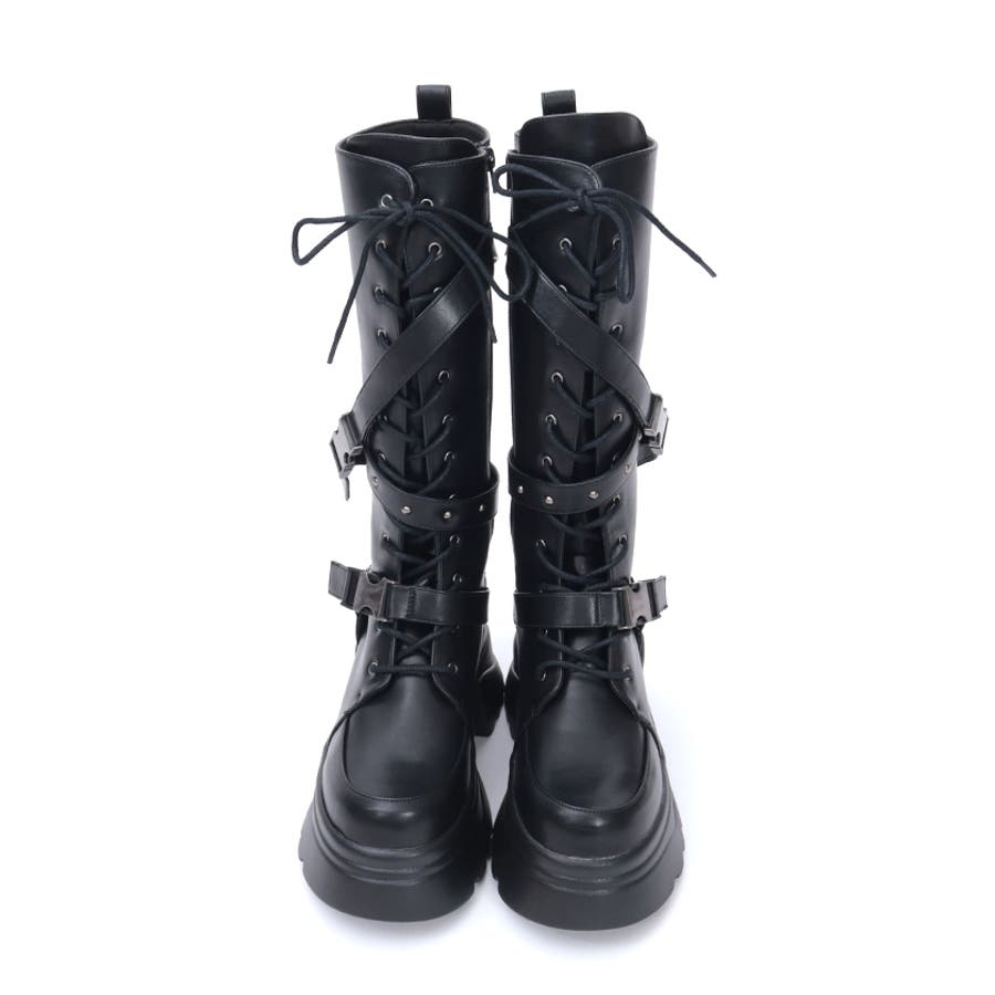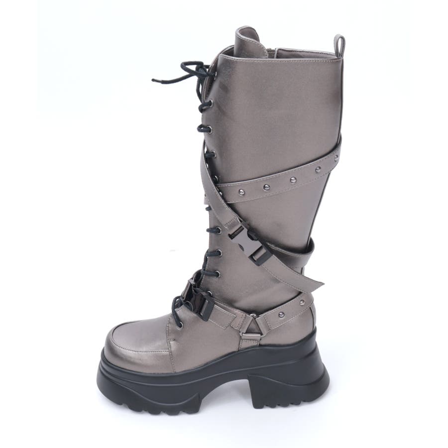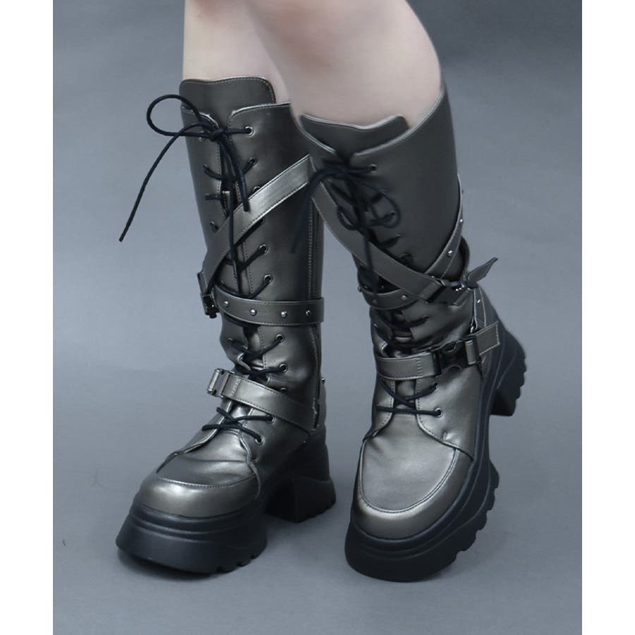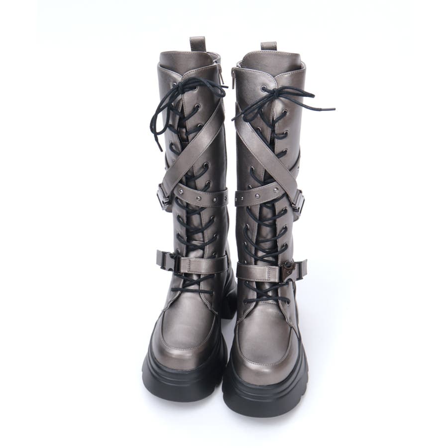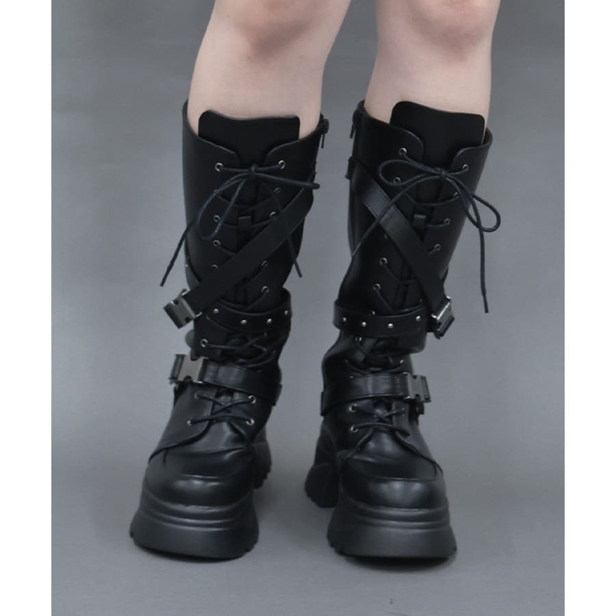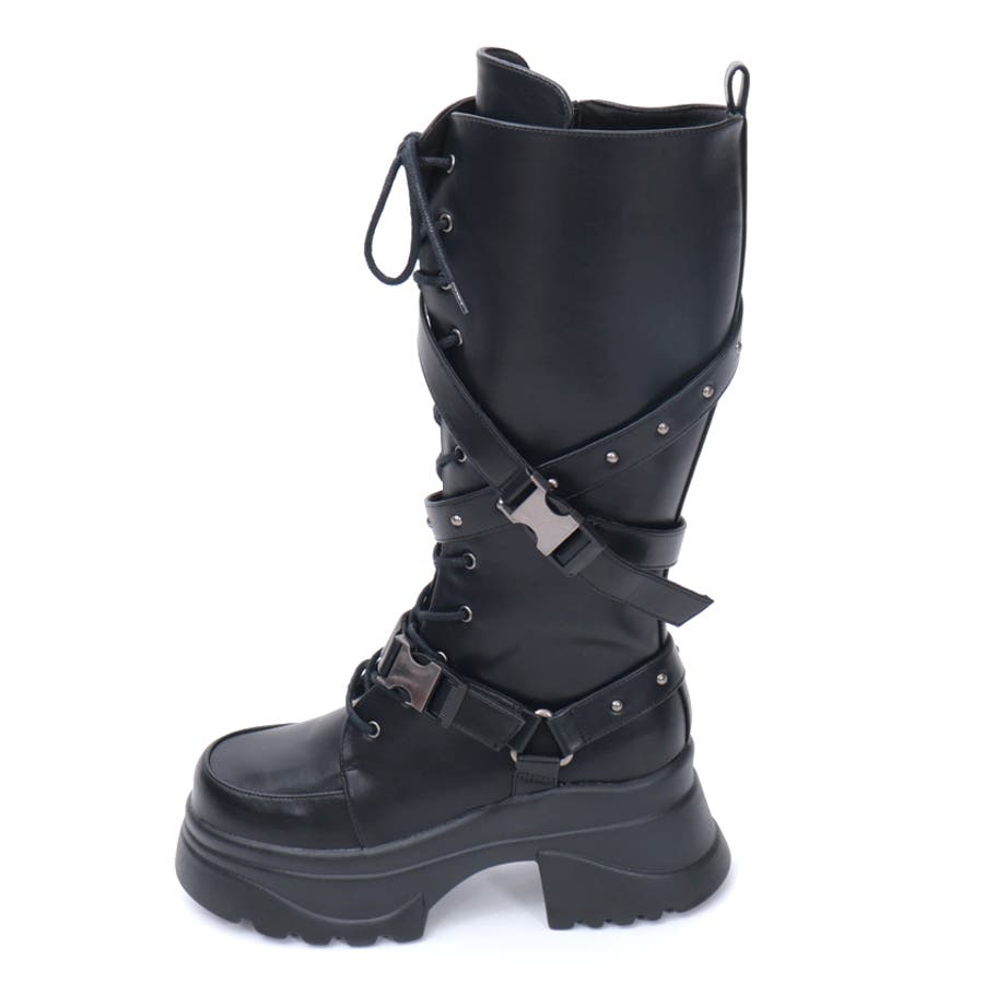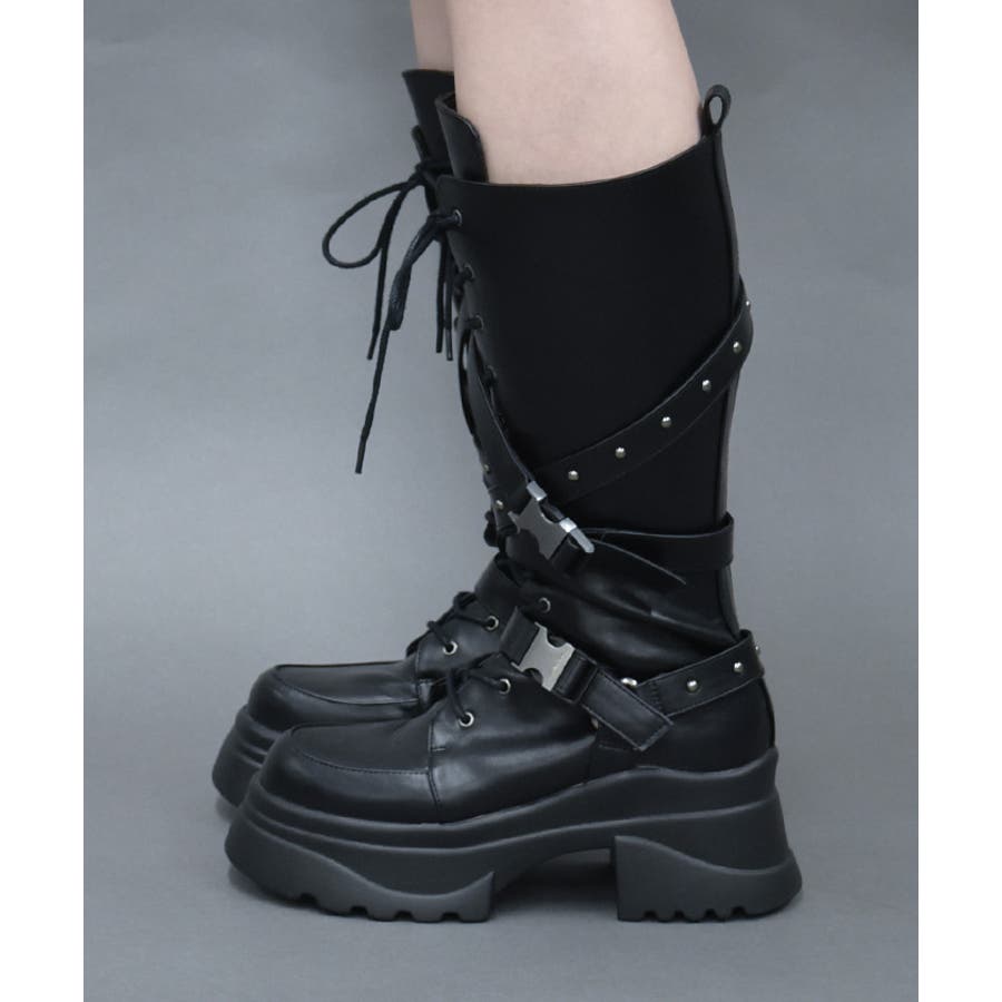 ガチャベルトをポイントであしらったレースアップロングブーツです。