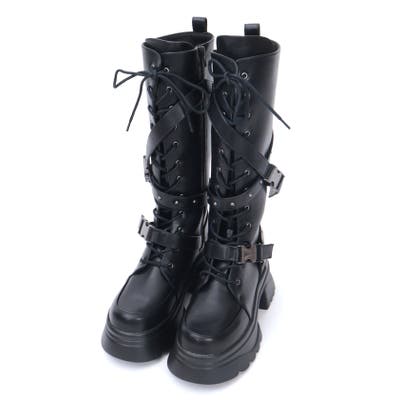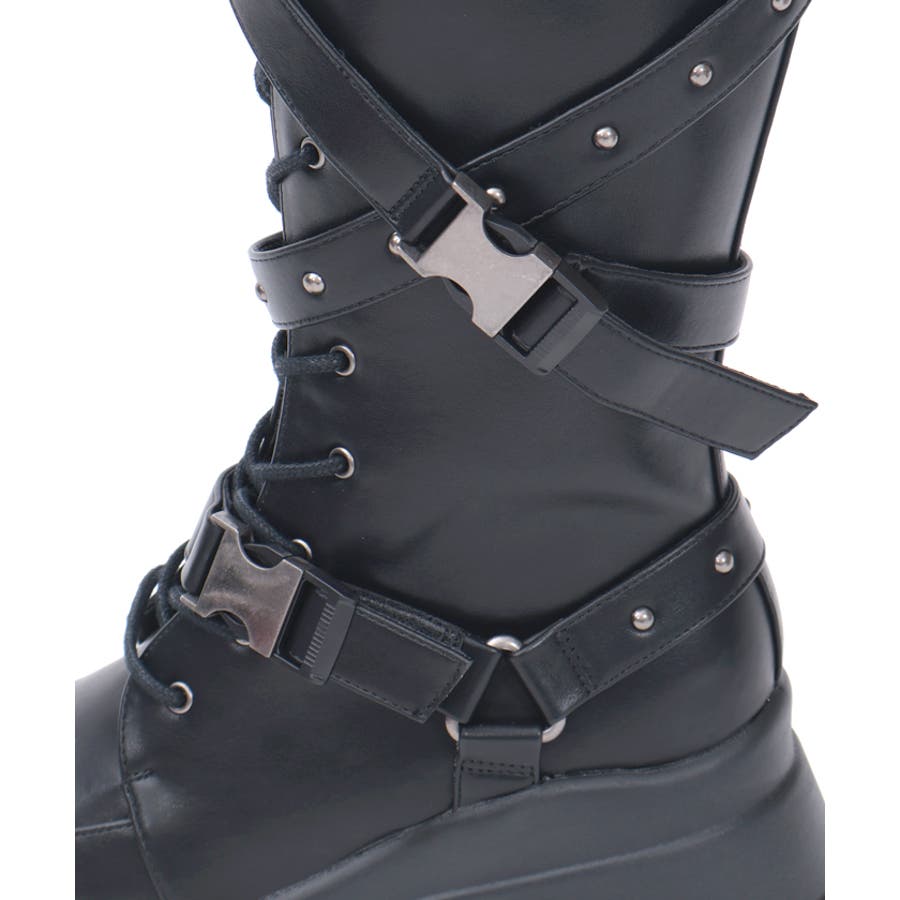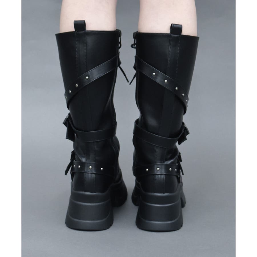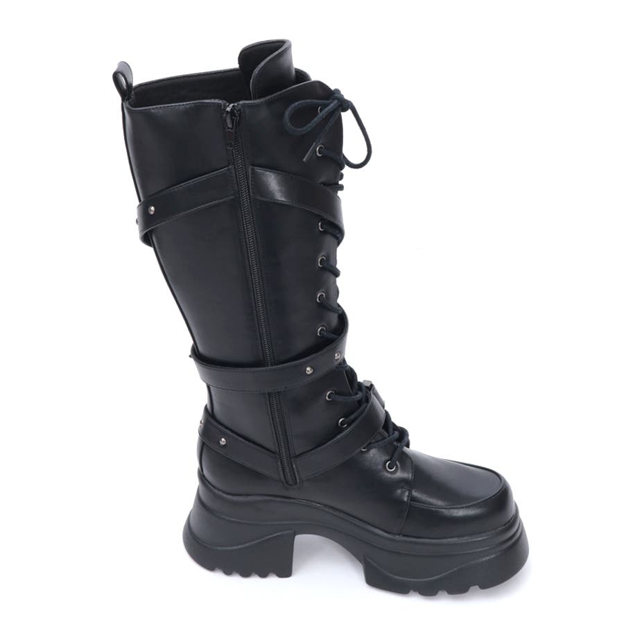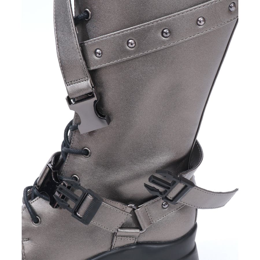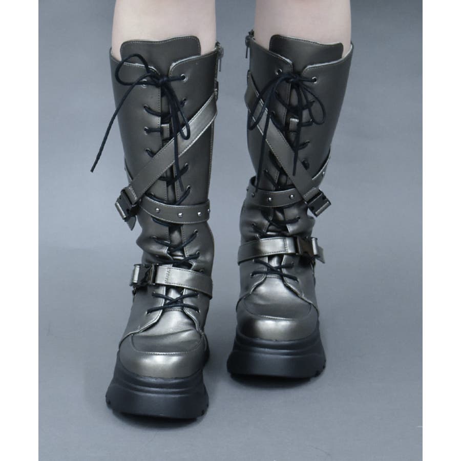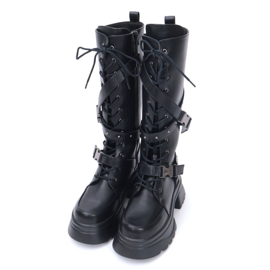 ガチャベルトをポイントであしらったレースアップロングブーツです。