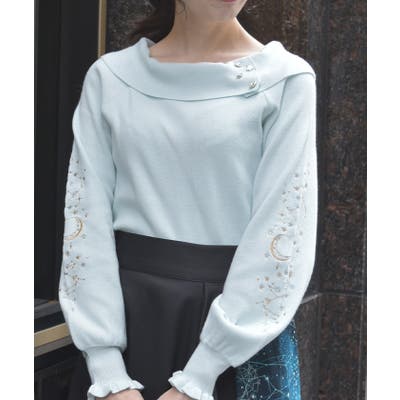 袖にキラキラのラメ糸で刺繍を施したニットトップスです。