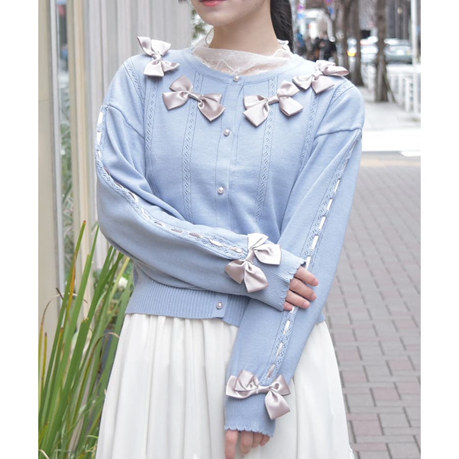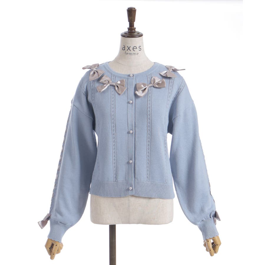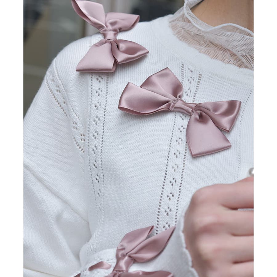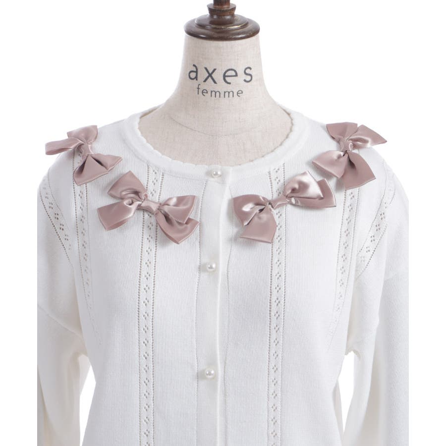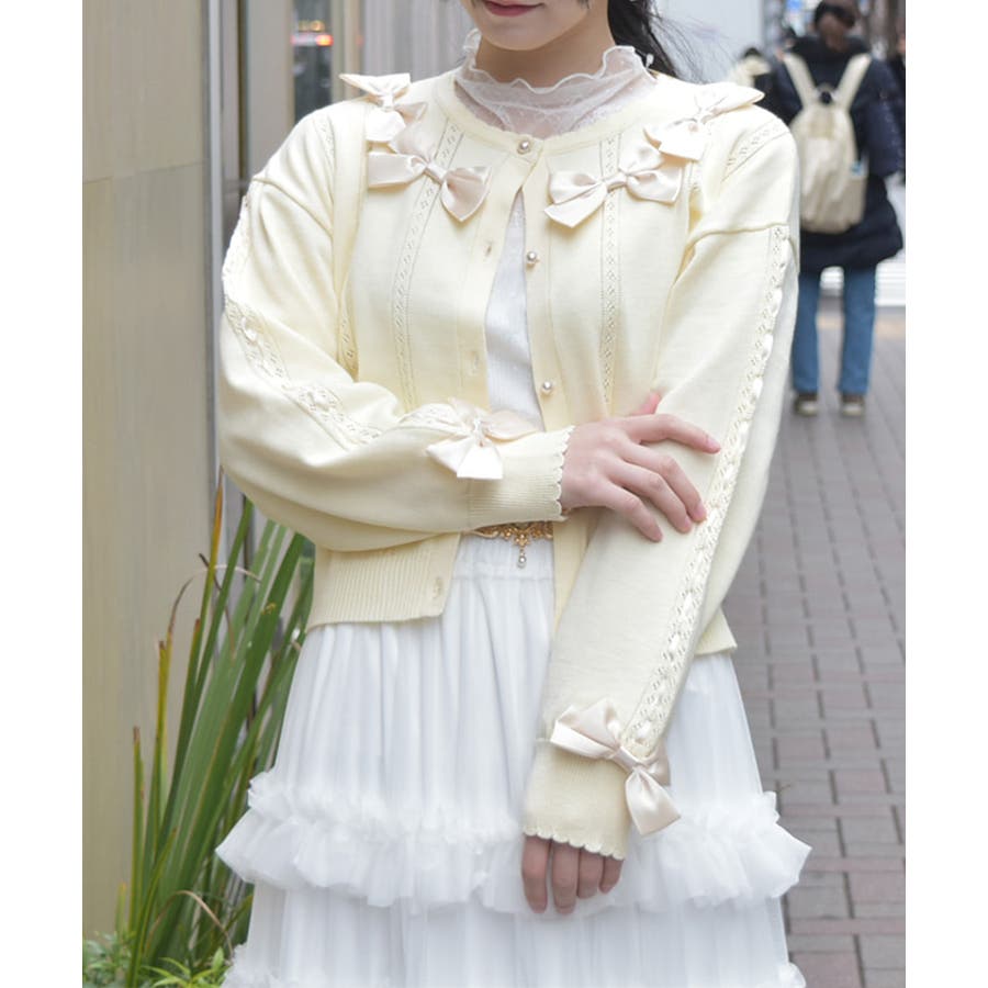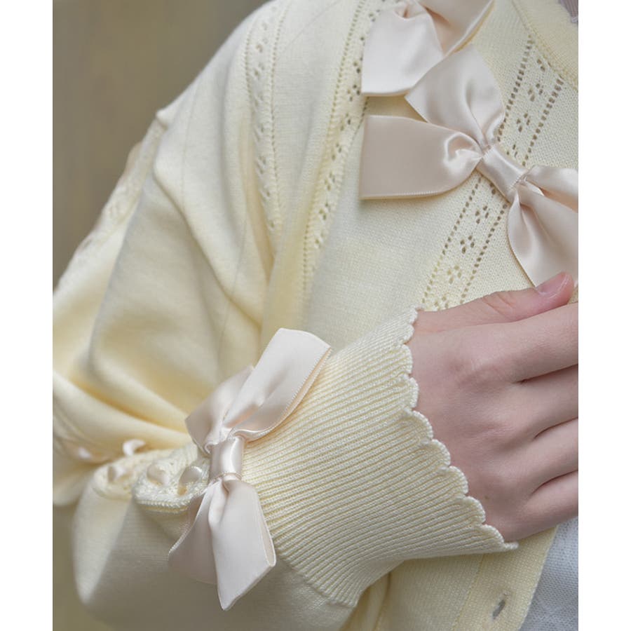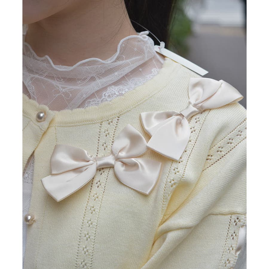 サテン生地で作られたリボンがたっぷりとあしらわれたカーディガンは、大人かわいさを引き立てるアイテムです。甘さと華やかさをプラスしてくれる一着です。