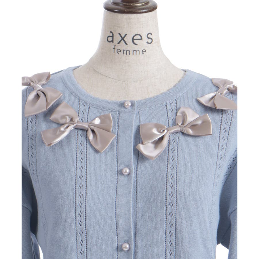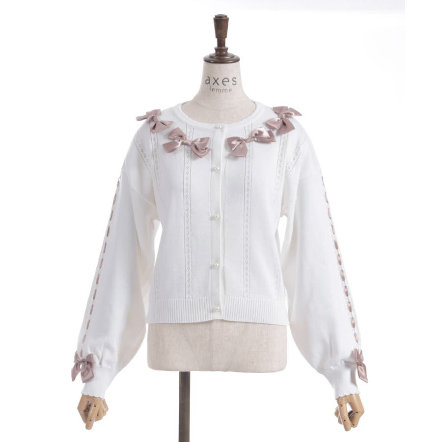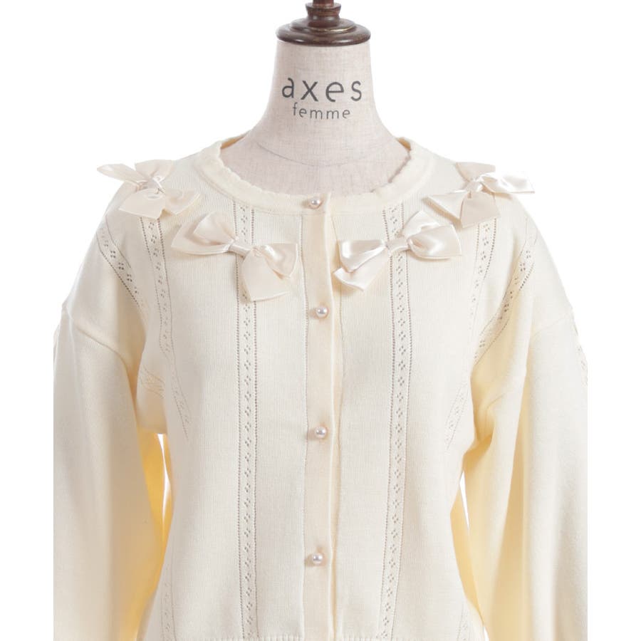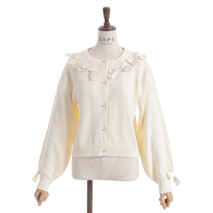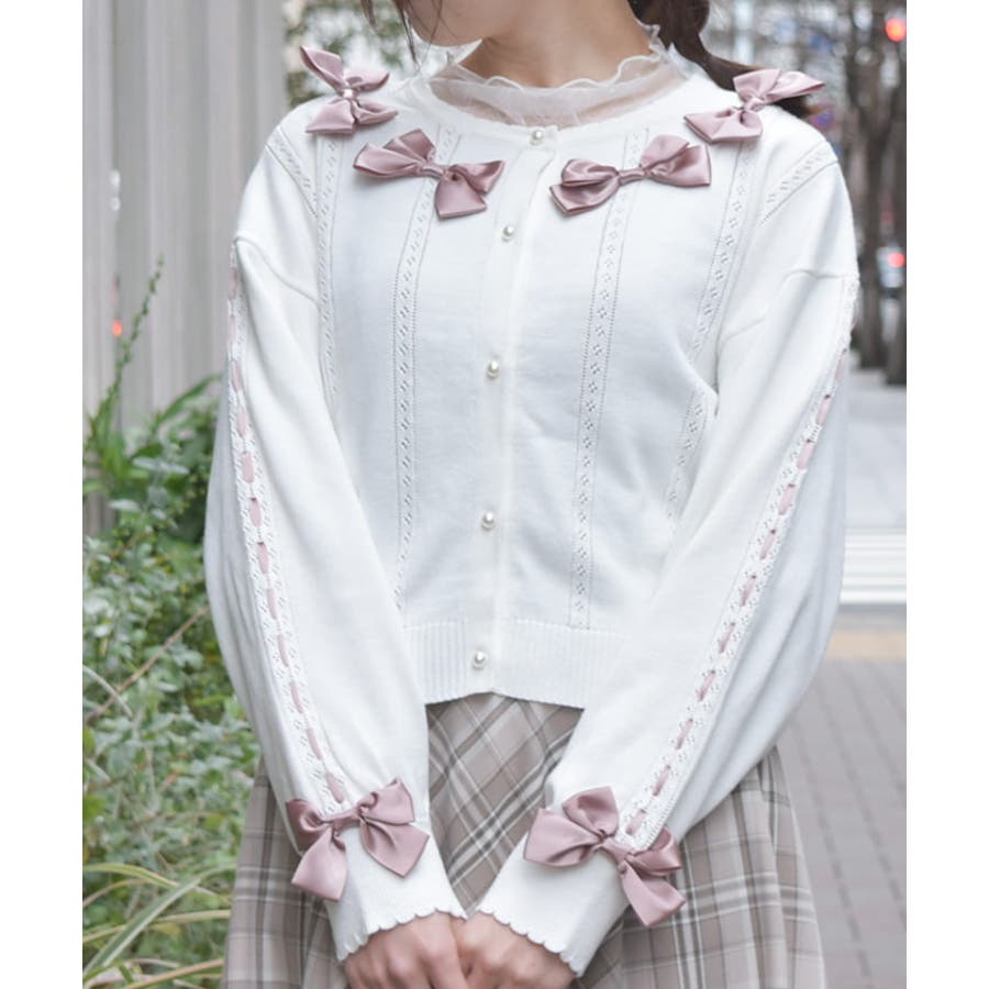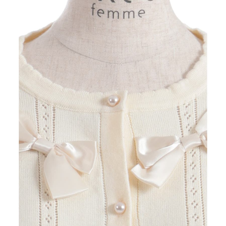サテン生地で作られたリボンがたっぷりとあしらわれたカーディガンは、大人かわいさを引き立てるアイテムです。甘さと華やかさをプラスしてくれる一着です。