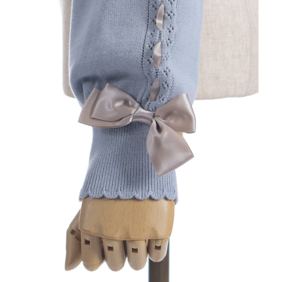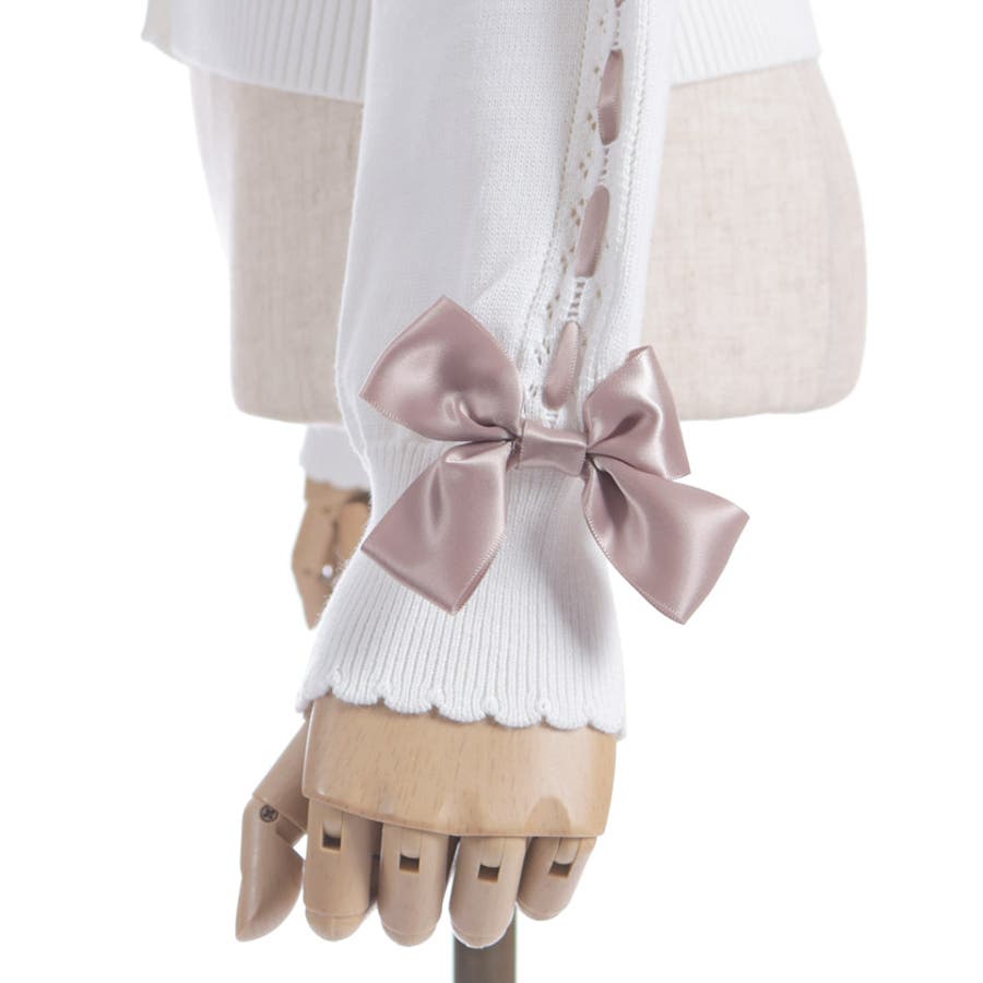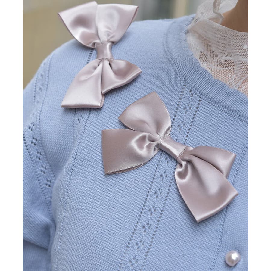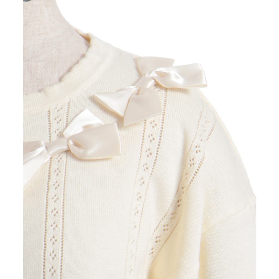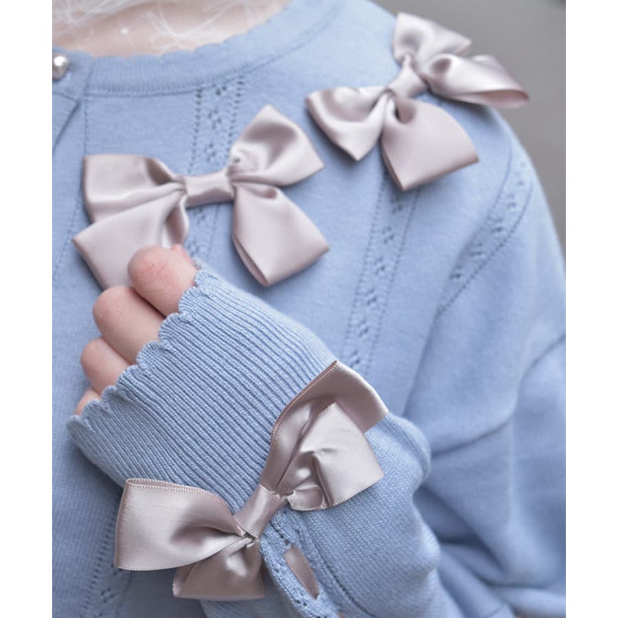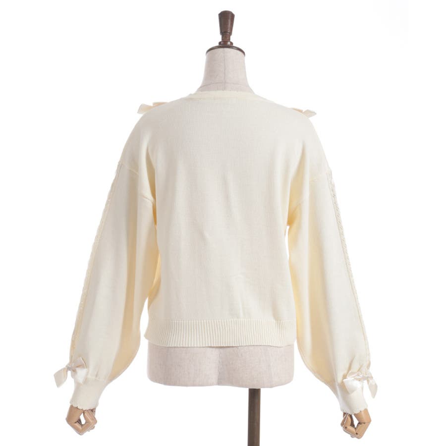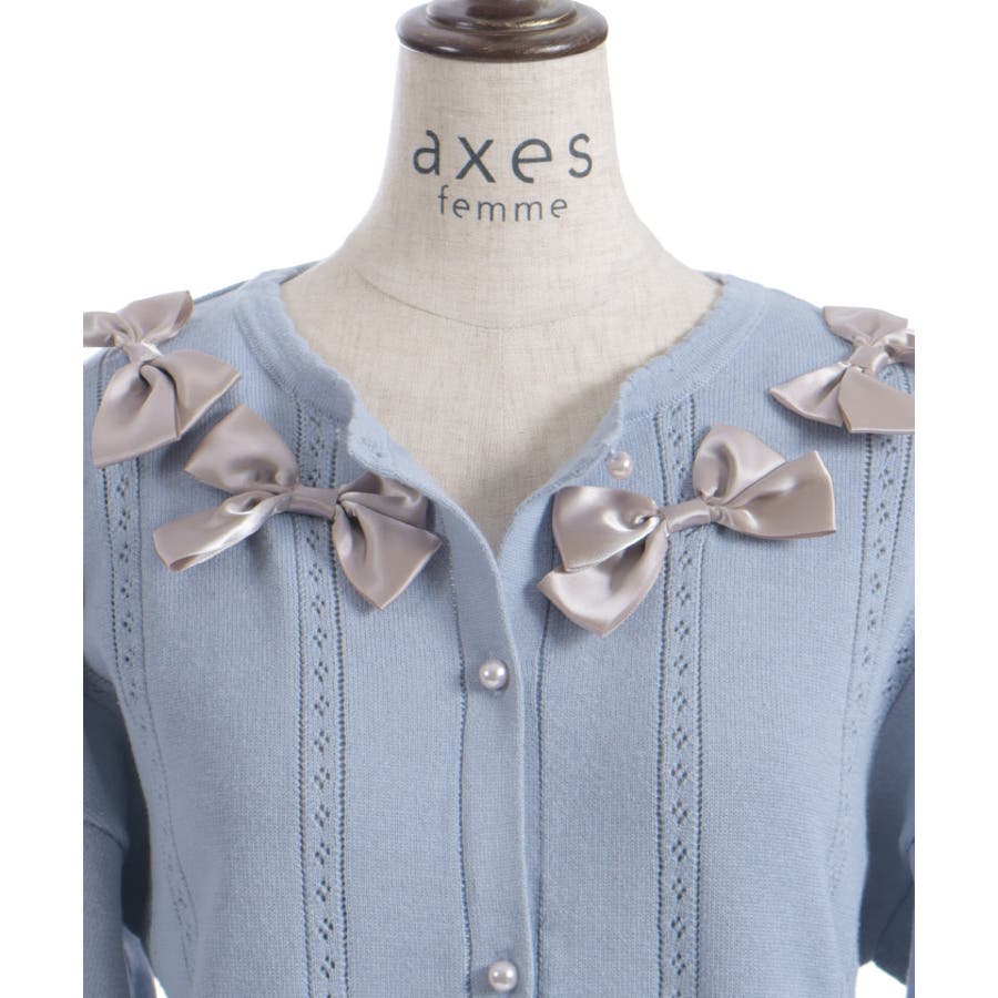 サテン生地で作られたリボンがたっぷりとあしらわれたカーディガンは、大人かわいさを引き立てるアイテムです。甘さと華やかさをプラスしてくれる一着です。