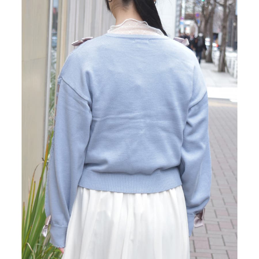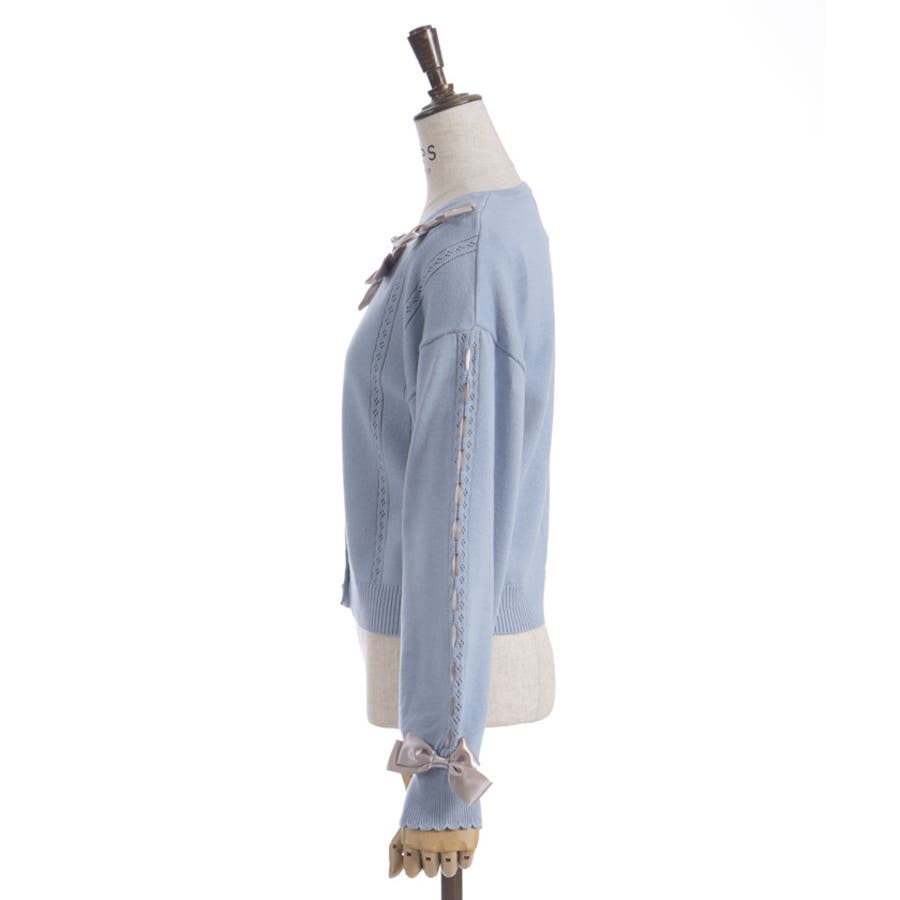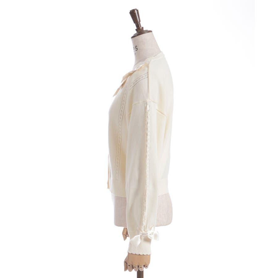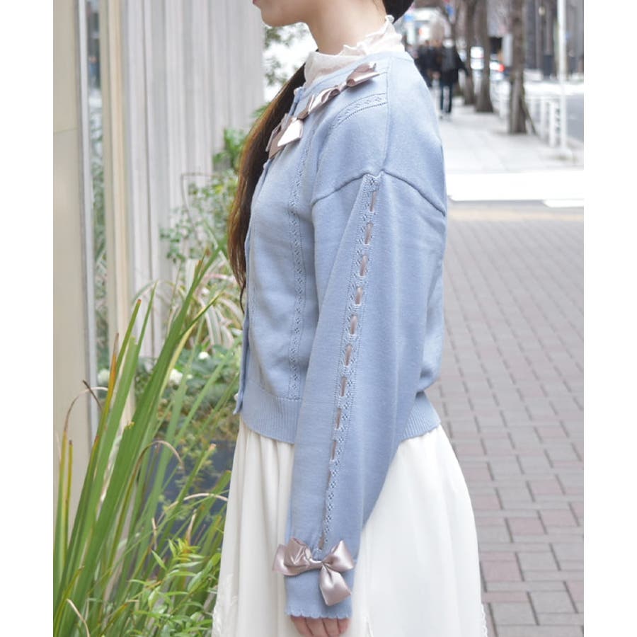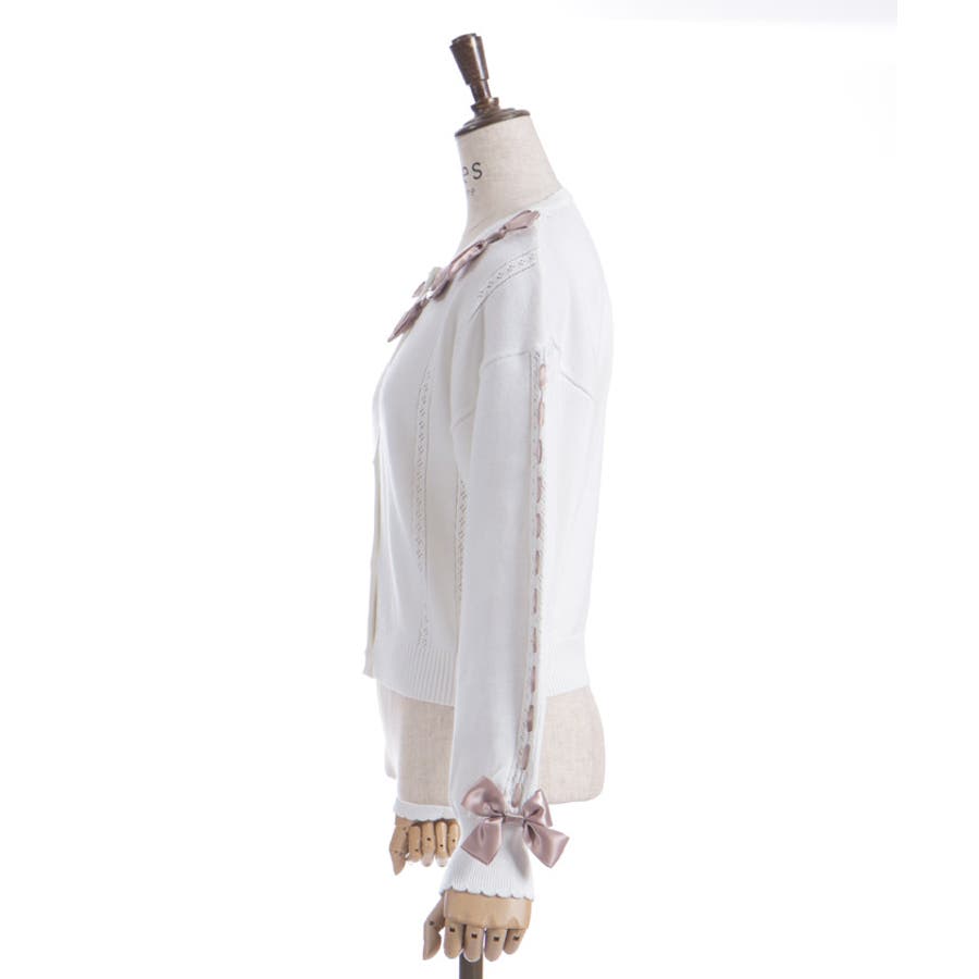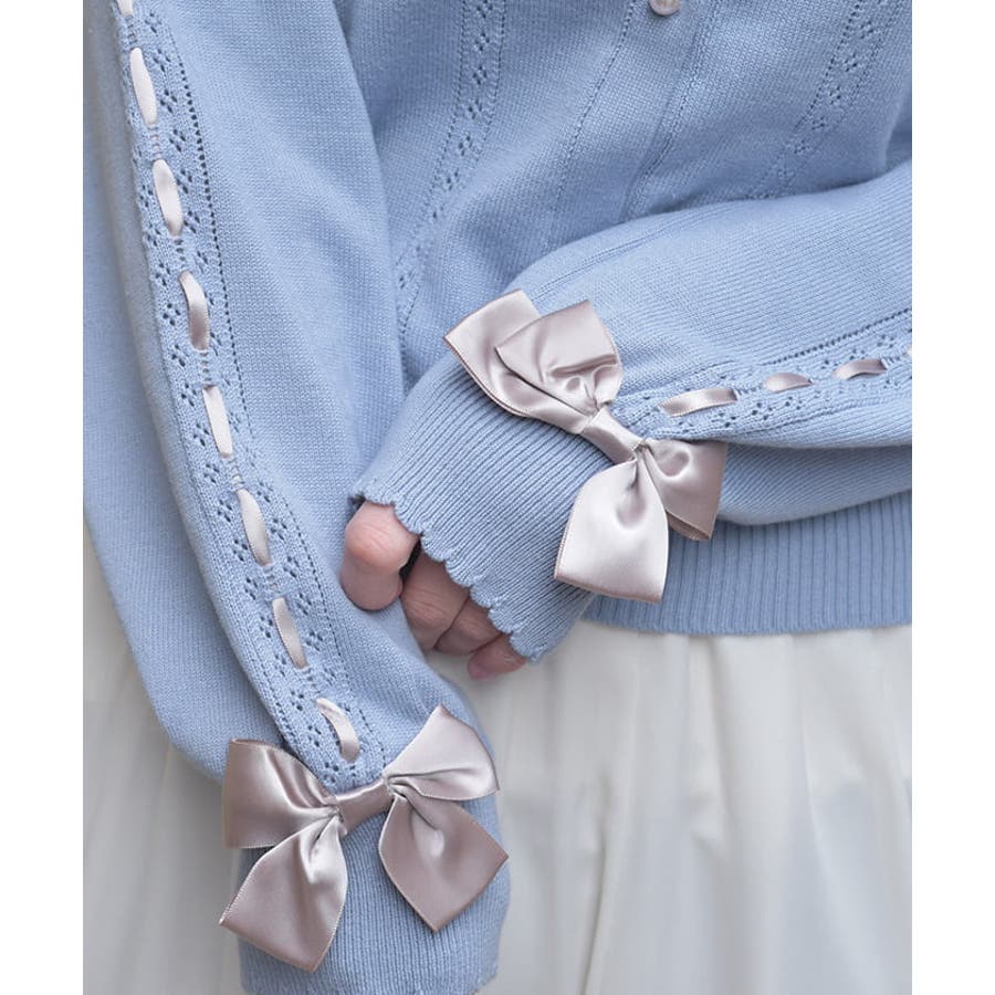 襟周りや袖に施されたサテンリボンが、甘さを加えつつ、エレガントな雰囲気を演出します。シンプルなカーディガンにリボンがアクセントとなり、フェミニンさを引き立てます。