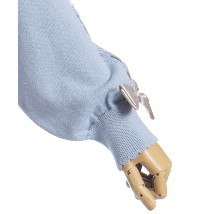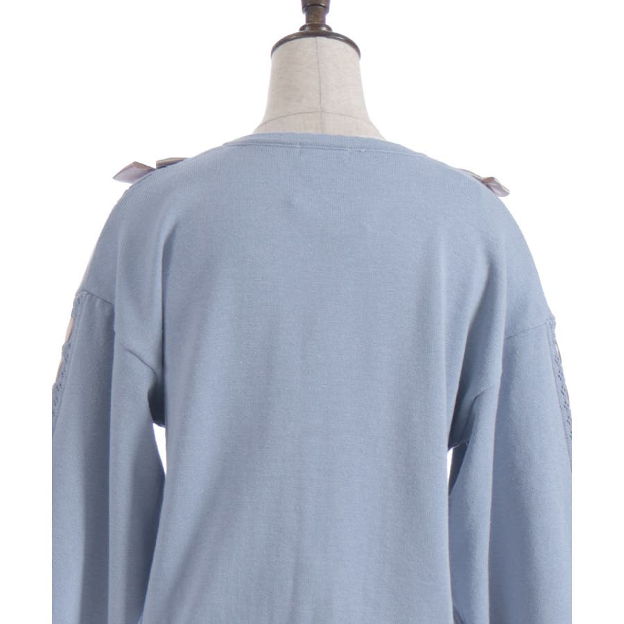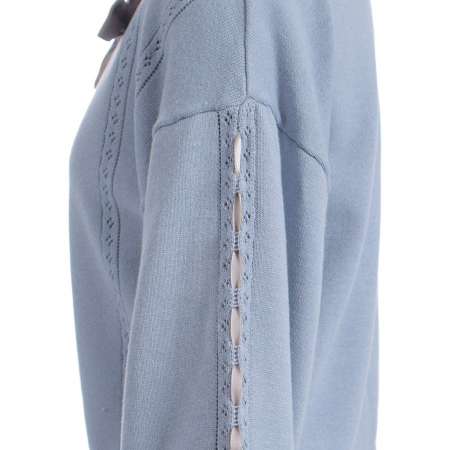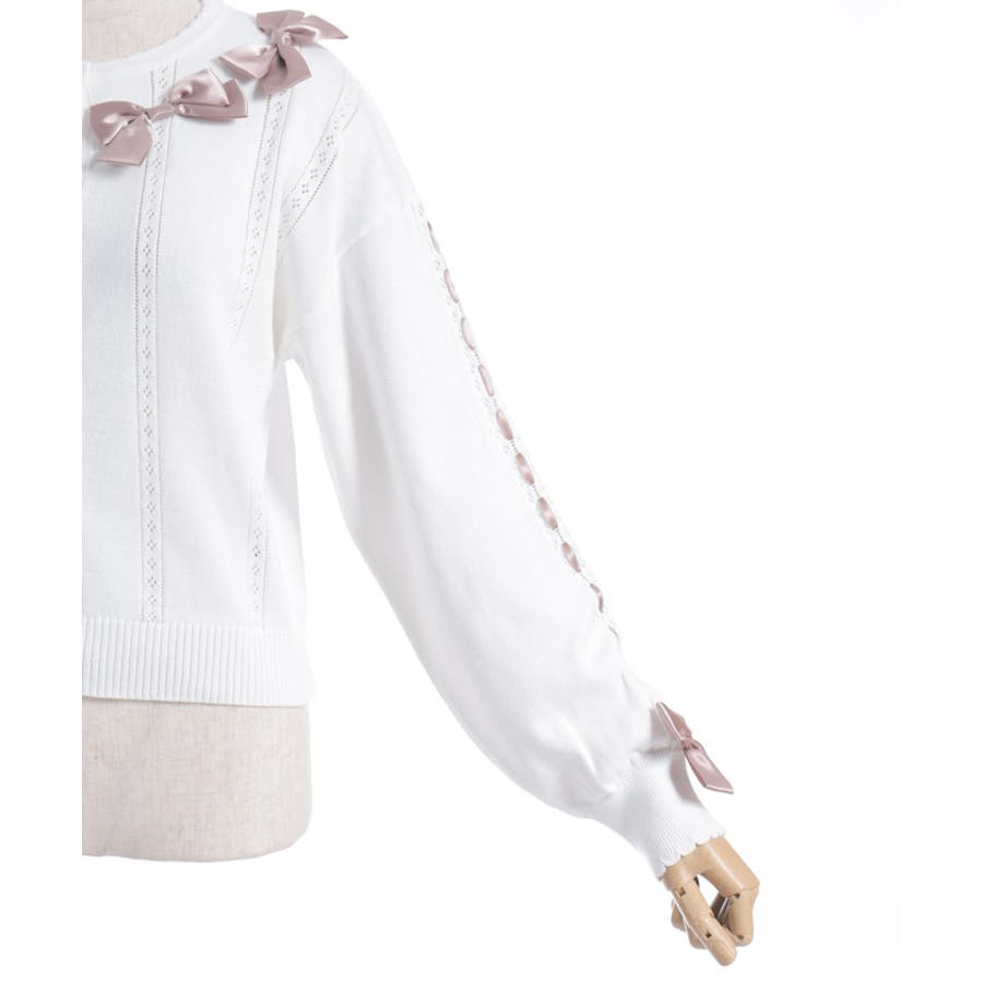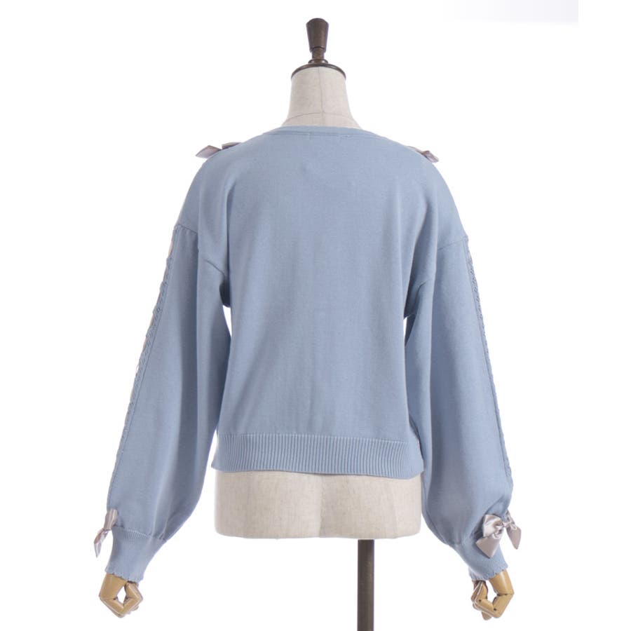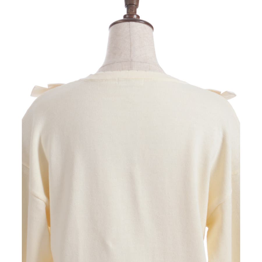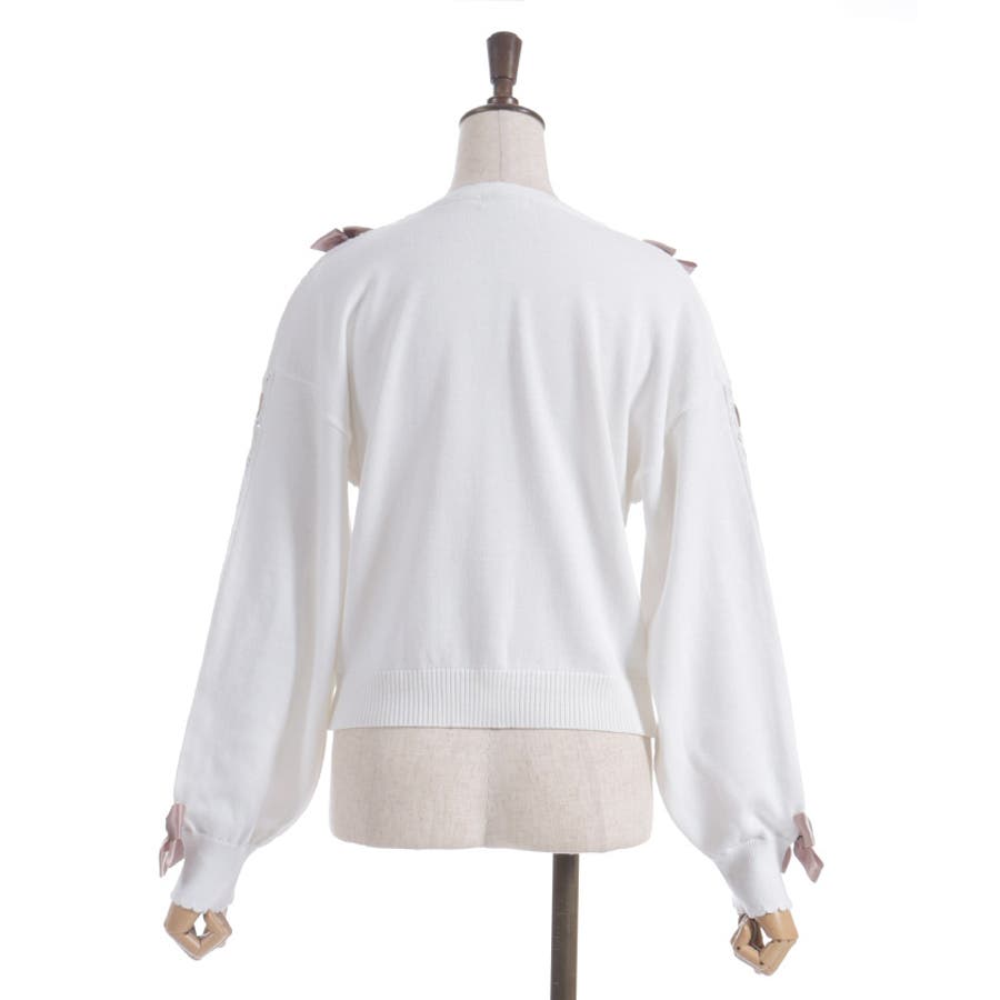 襟周りや袖に施されたサテンリボンが、甘さを加えつつ、エレガントな雰囲気を演出します。シンプルなカーディガンにリボンがアクセントとなり、フェミニンさを引き立てます。