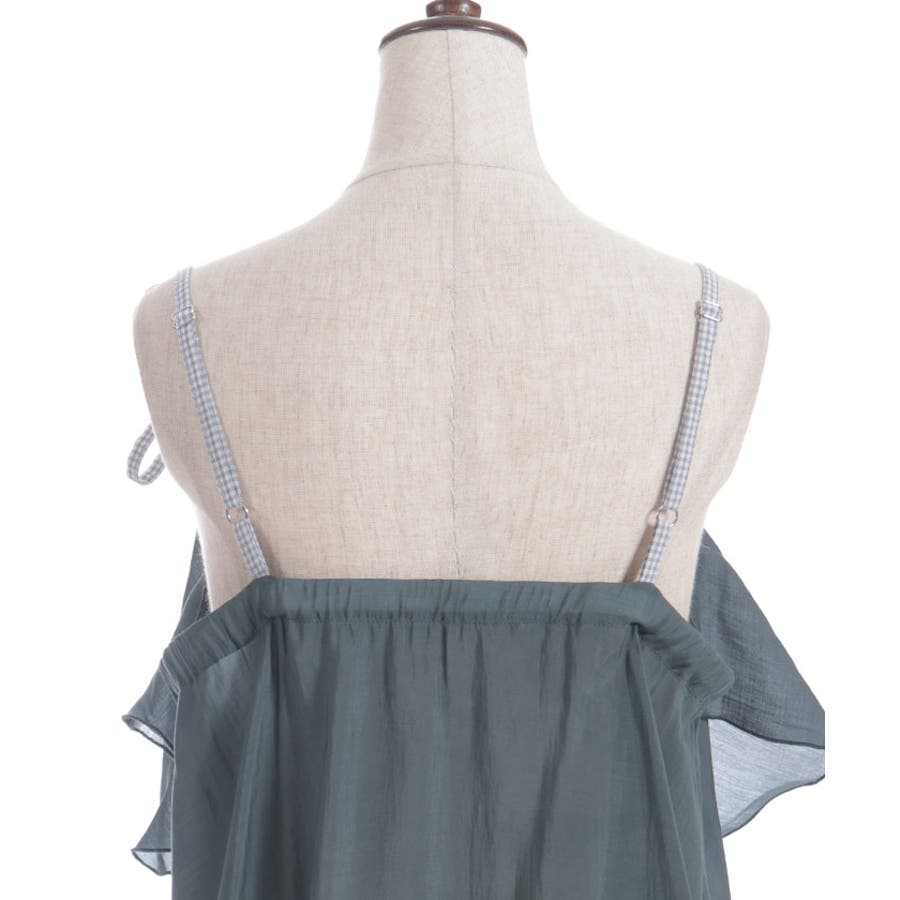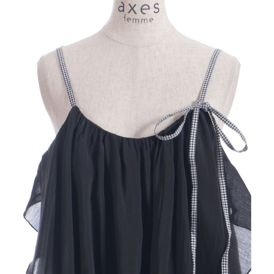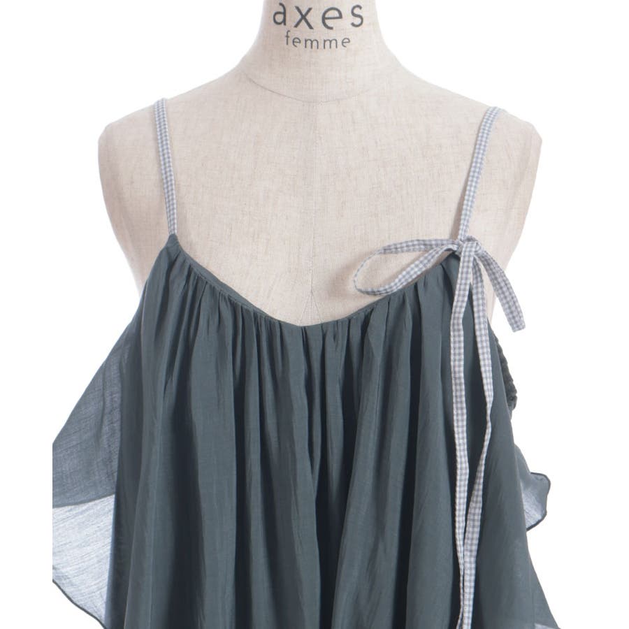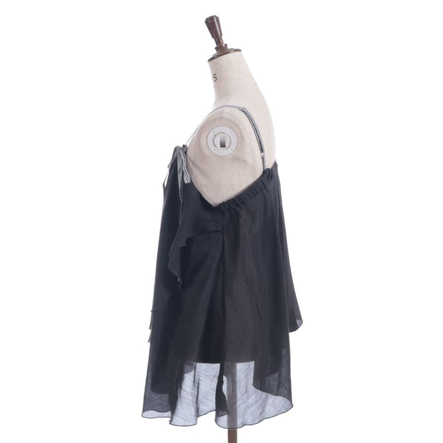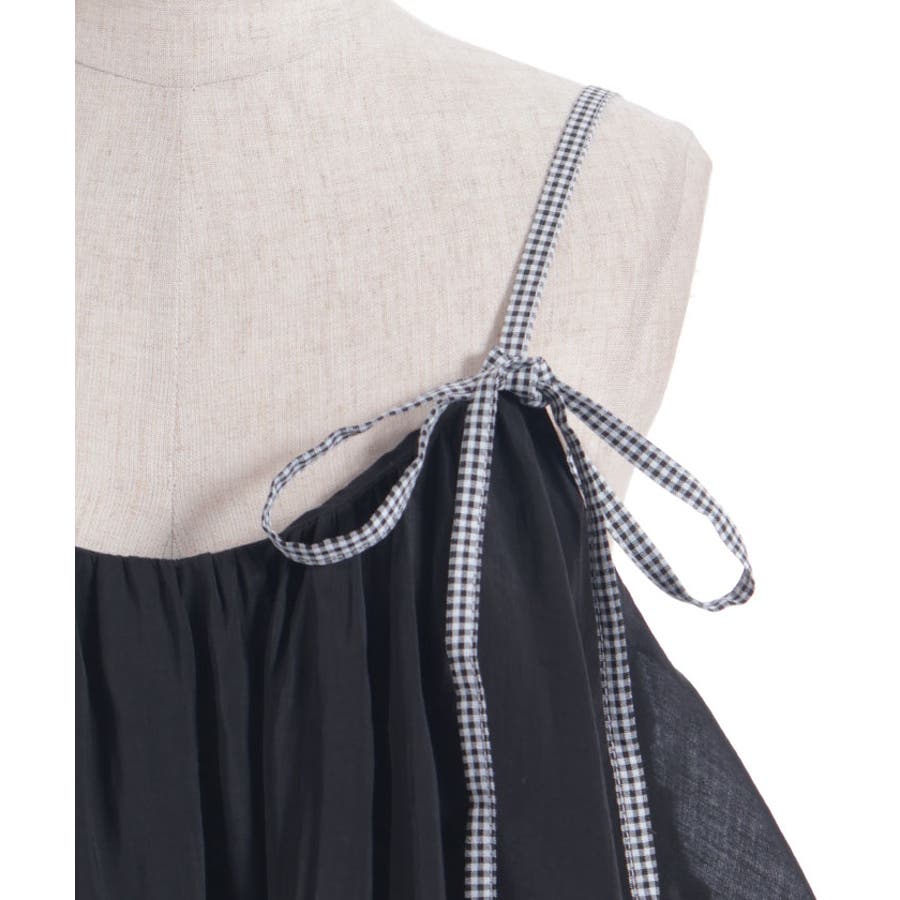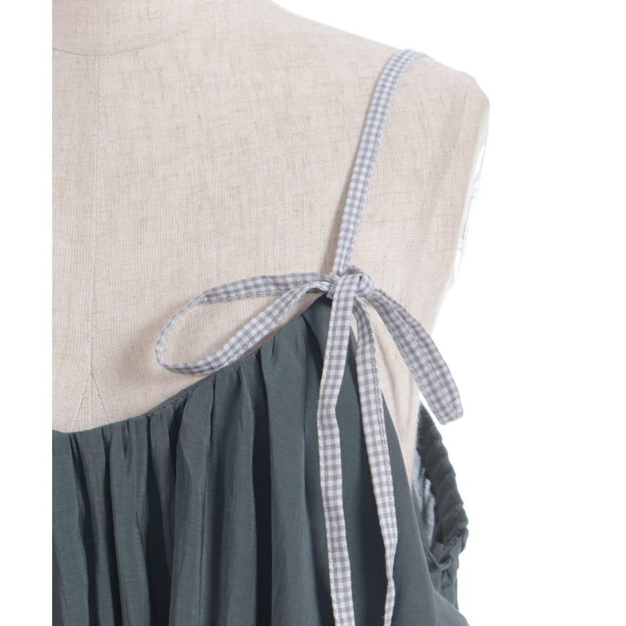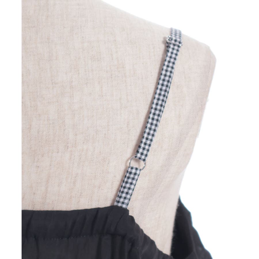 肩から流れるようなフリルとギャザーが女性らしさを引き立て、チェックリボンは取り外し可能・アレンジ自在。