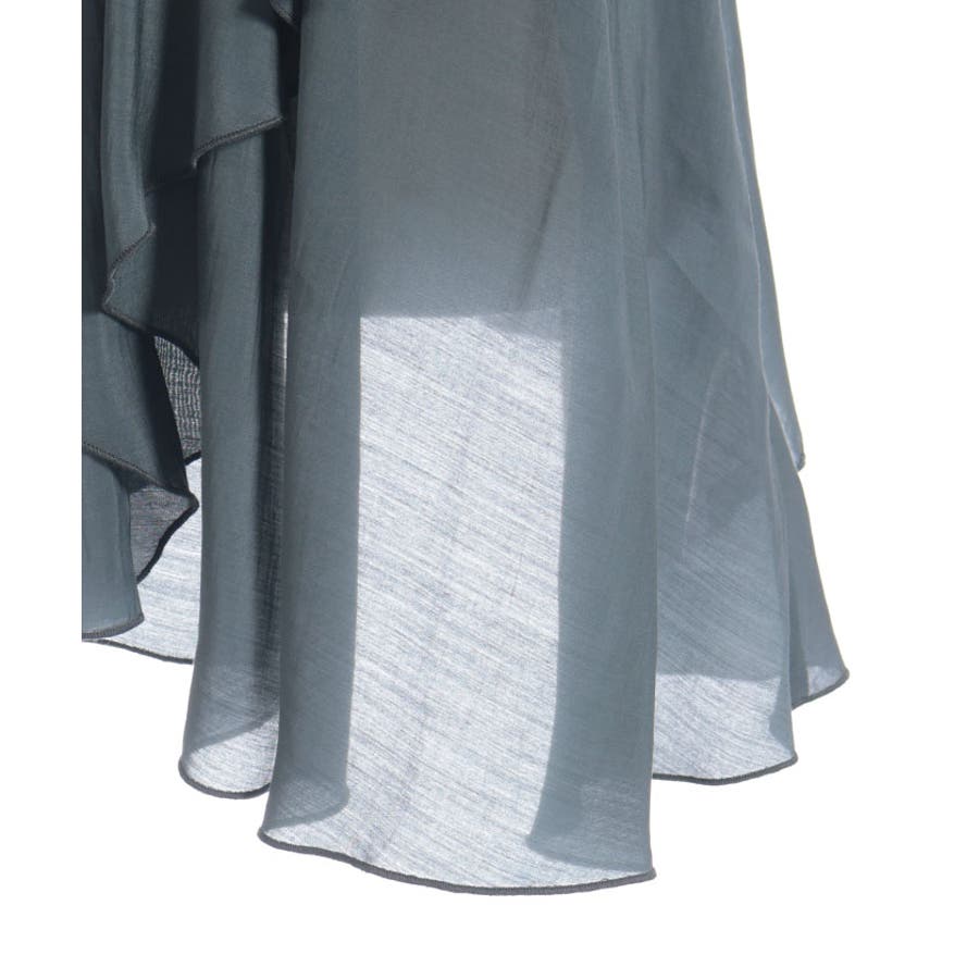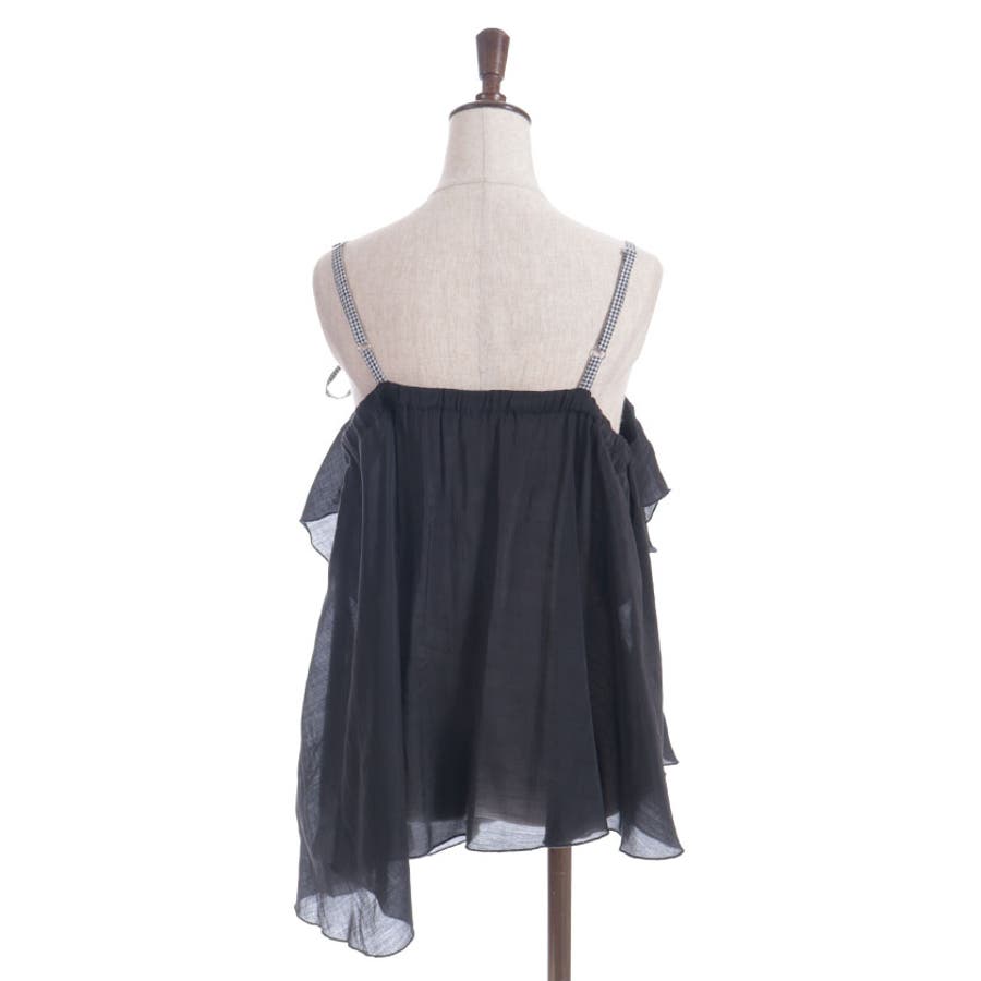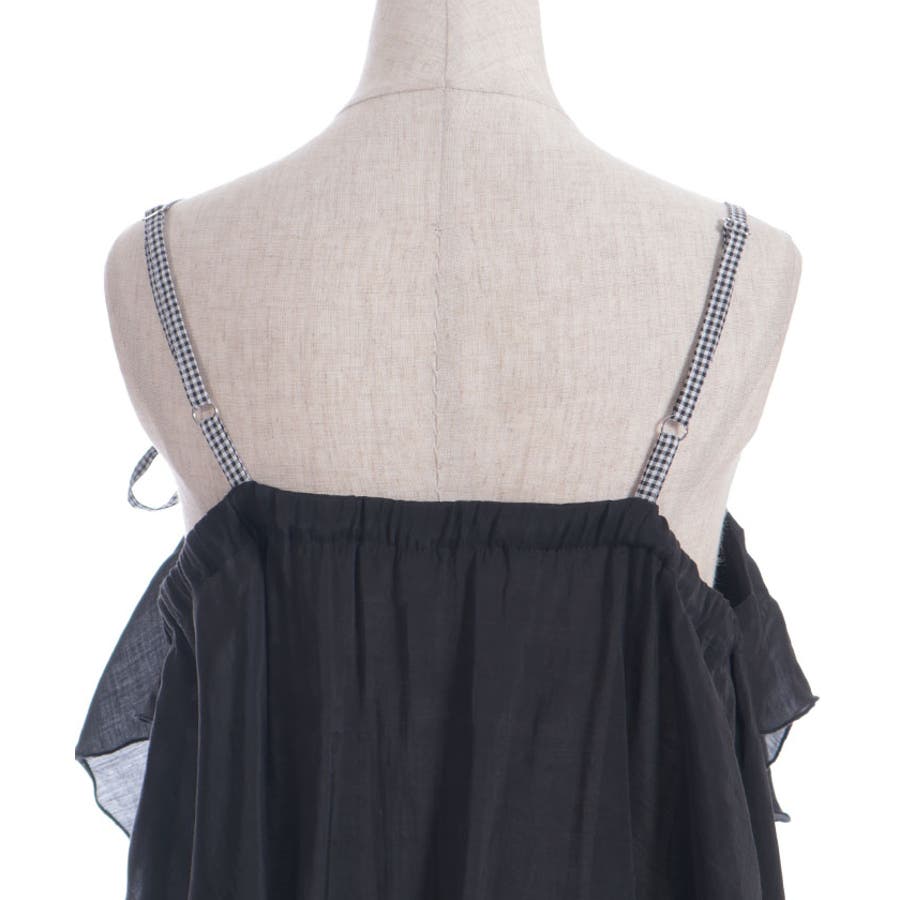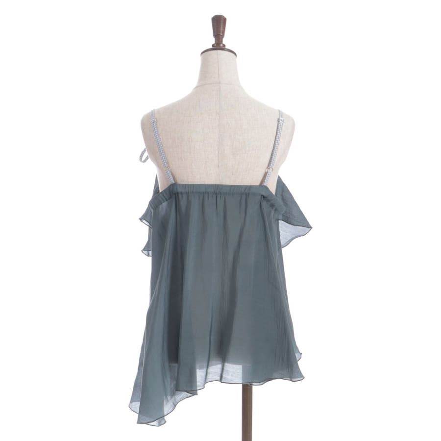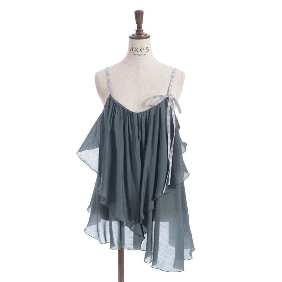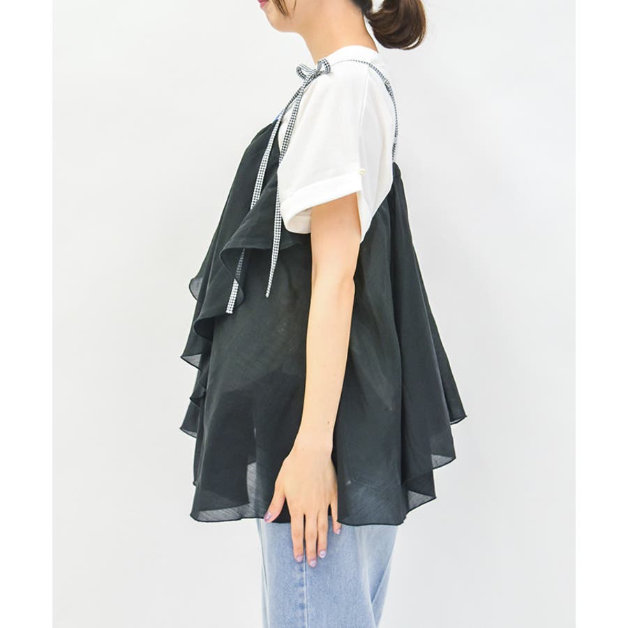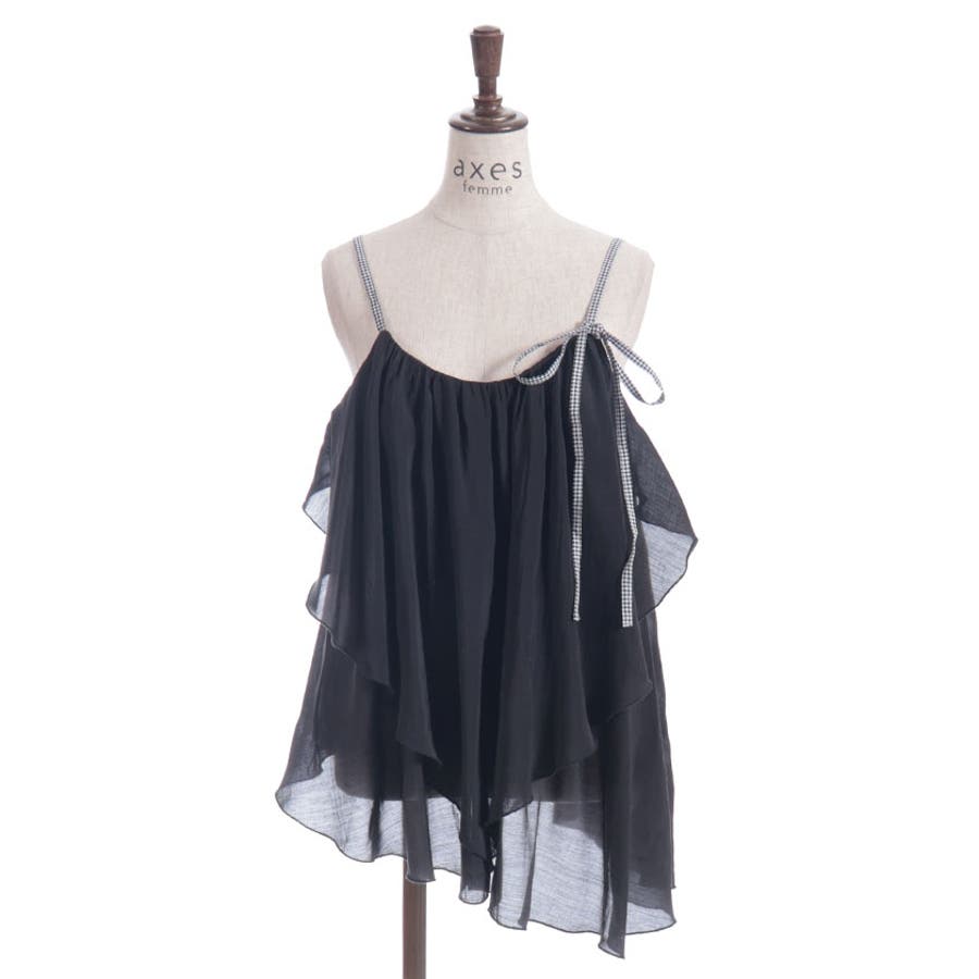 肩から流れるようなフリルとギャザーが女性らしさを引き立て、チェックリボンは取り外し可能・アレンジ自在。