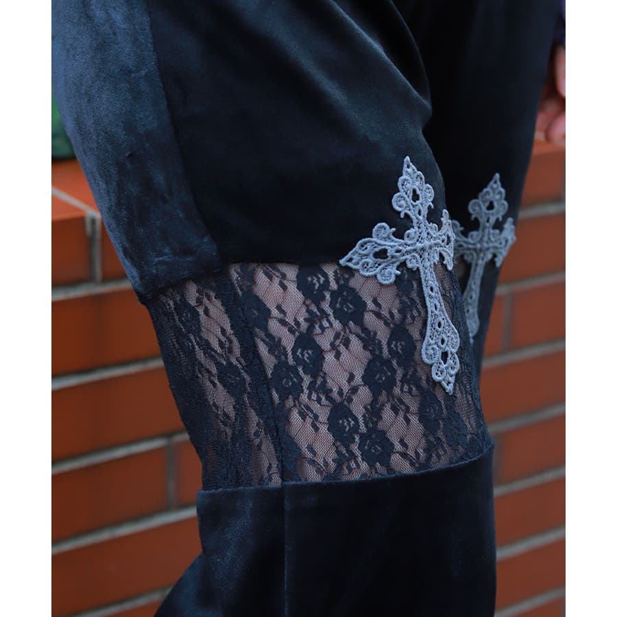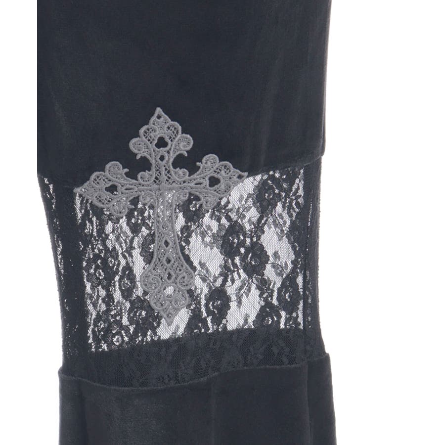 太もも部分にあしらったレースの透け感とクロスモチーフがミステリアスな雰囲気を醸し出しています。
