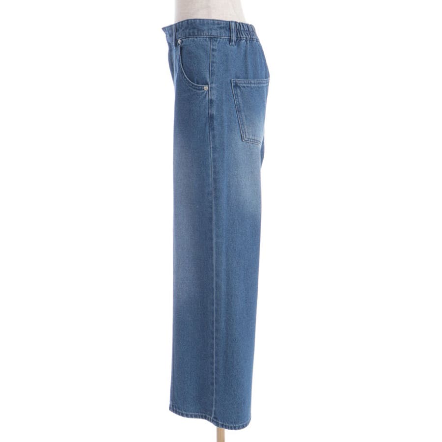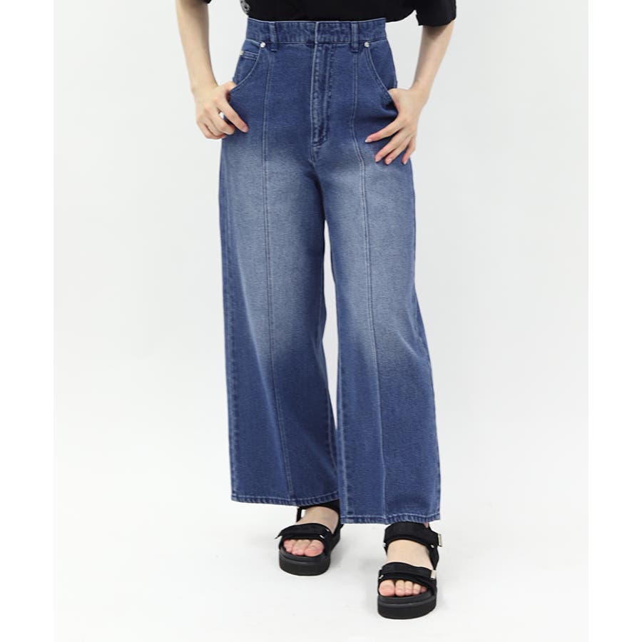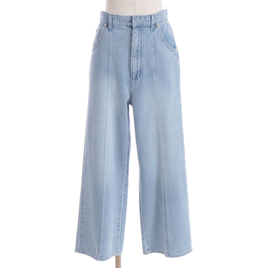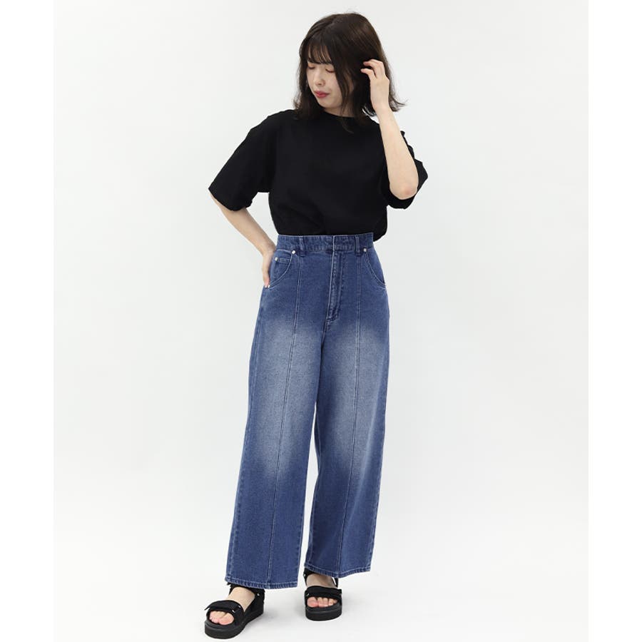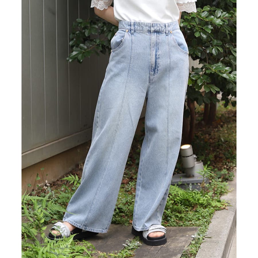 ストレートシルエットが美しく、すっきりとした印象を与えるデニムパンツ。