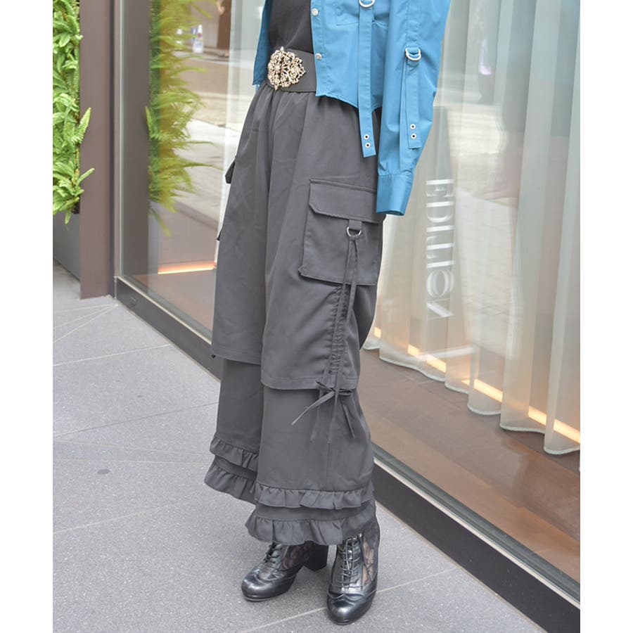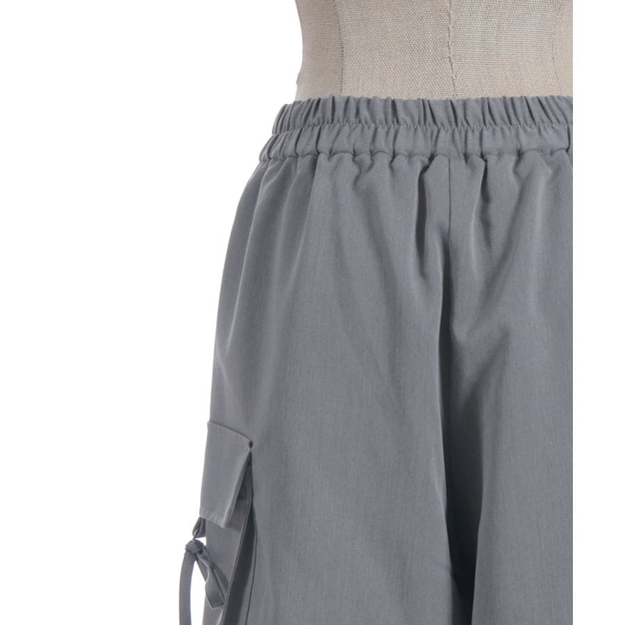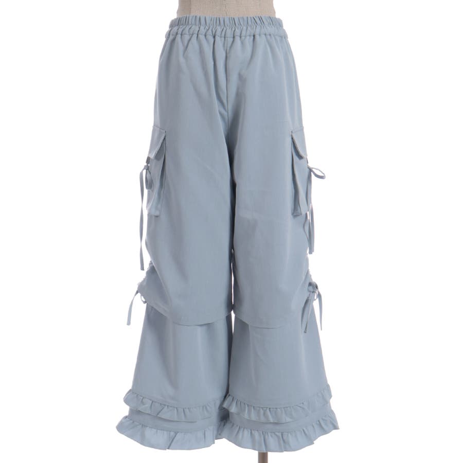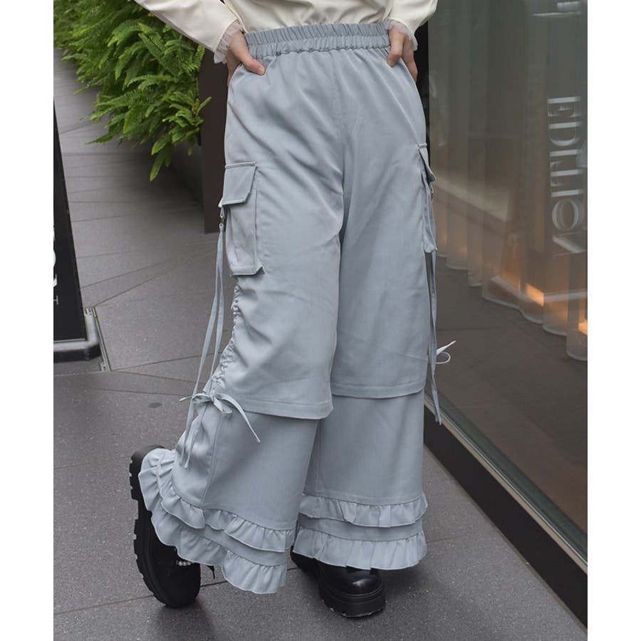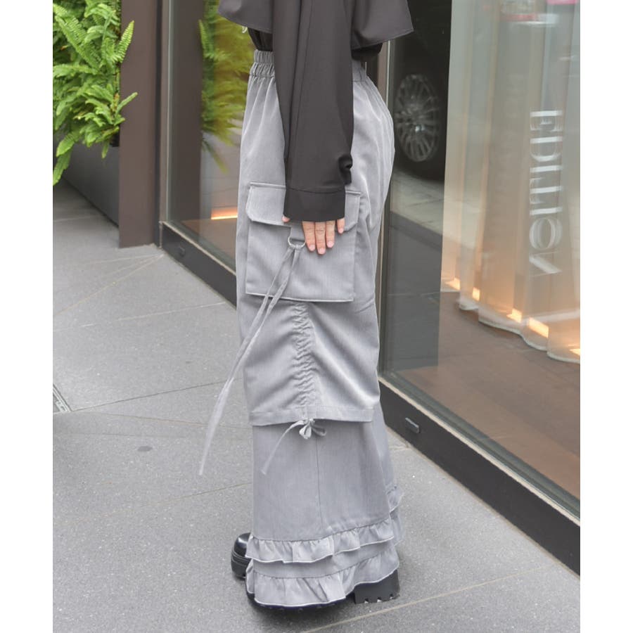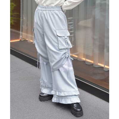 ボリューム感のあるポケットがサイドに配され、ワーク感を残しながらも裾にはフリルをたっぷり重ねて華やかに仕上げています。ドロストを上げるとレース×シアー素材がのぞき、フェミニンさと抜け感をプラスできるのも魅力。リラックス感のあるウエストゴム仕様で着心地も快適です。