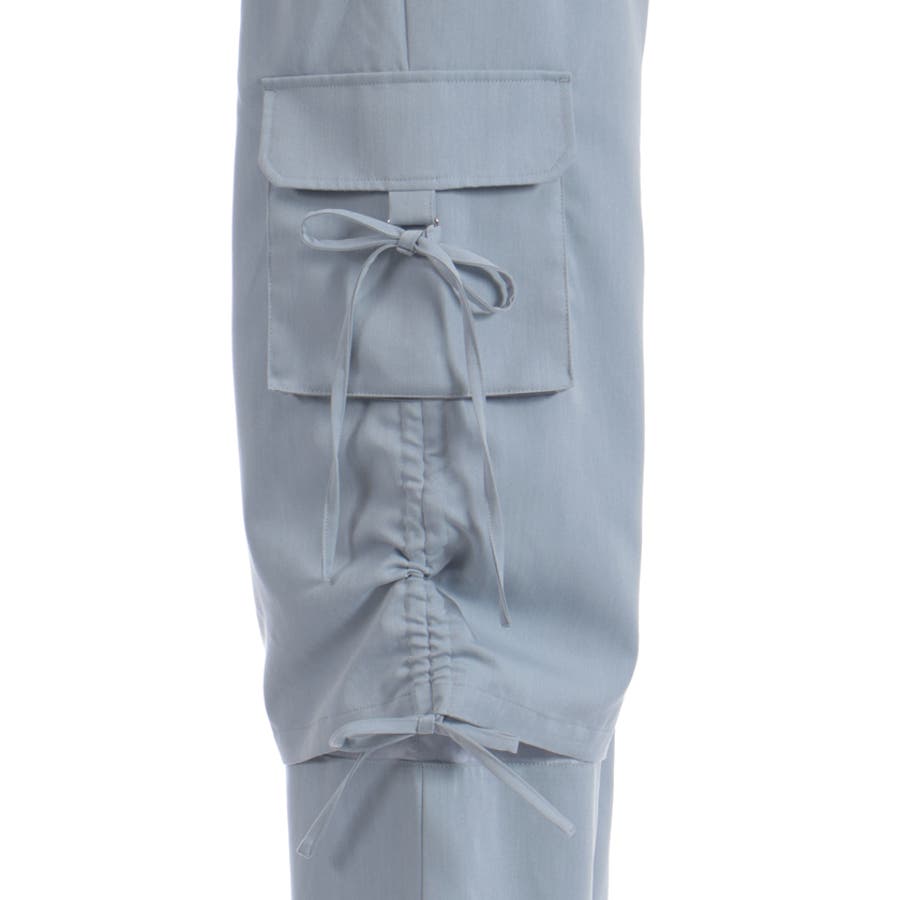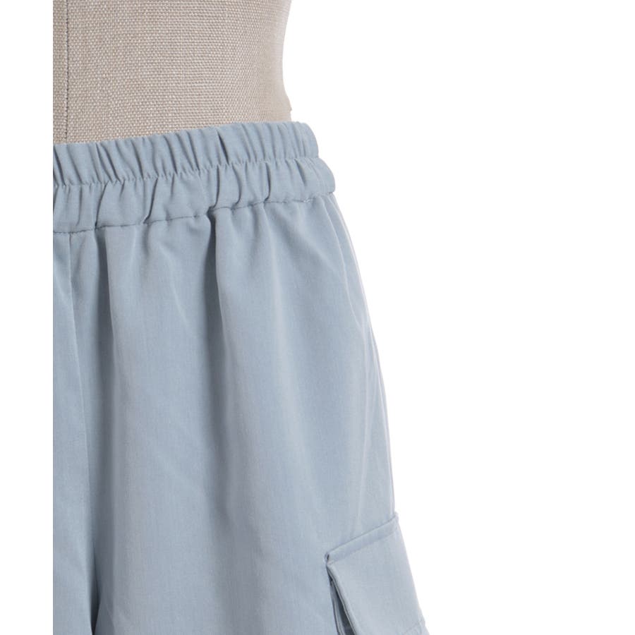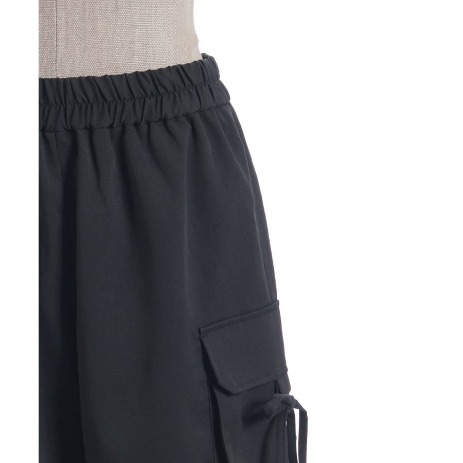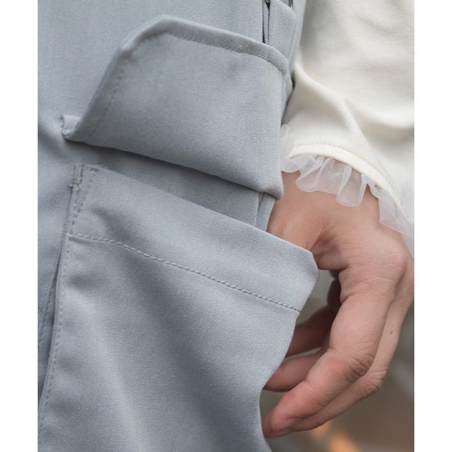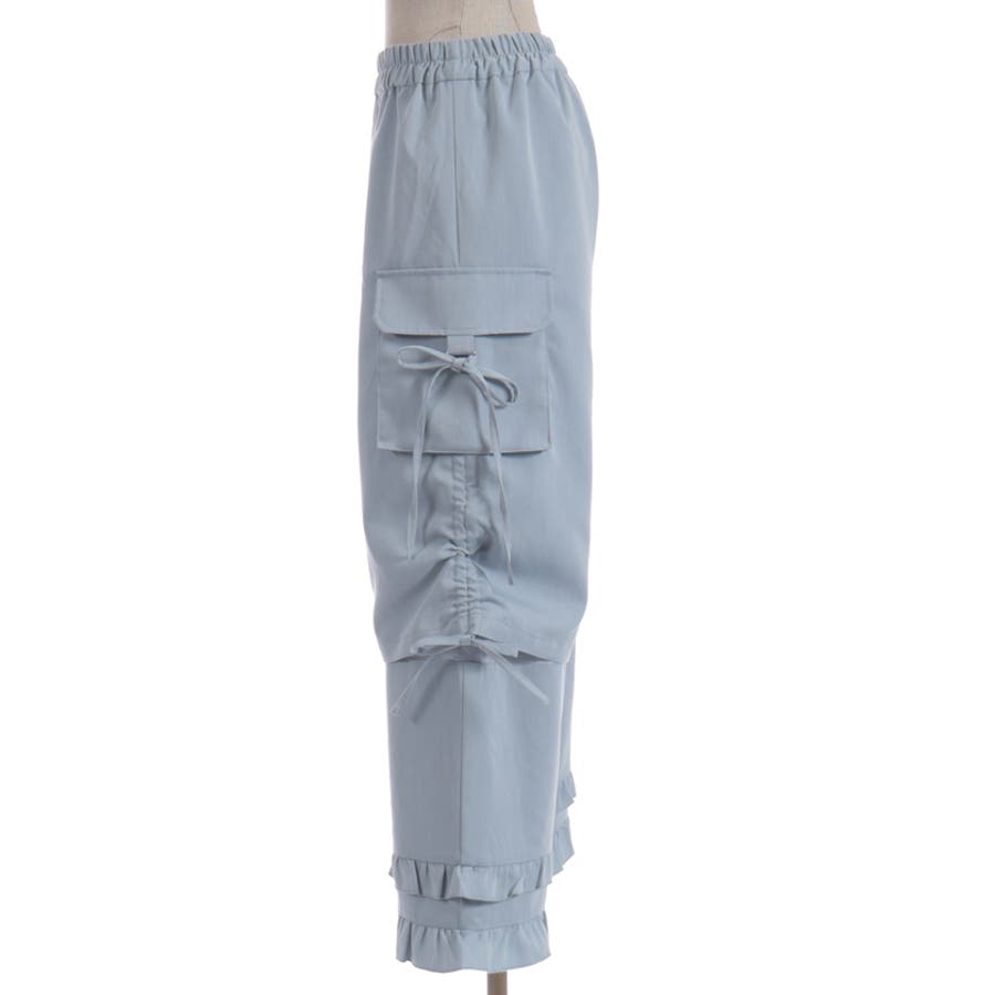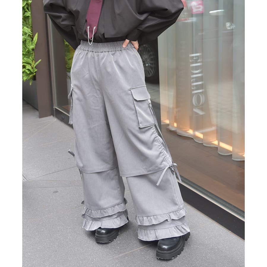 ボリューム感のあるポケットがサイドに配され、ワーク感を残しながらも裾にはフリルをたっぷり重ねて華やかに仕上げています。ドロストを上げるとレース×シアー素材がのぞき、フェミニンさと抜け感をプラスできるのも魅力。リラックス感のあるウエストゴム仕様で着心地も快適です。