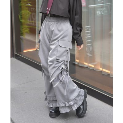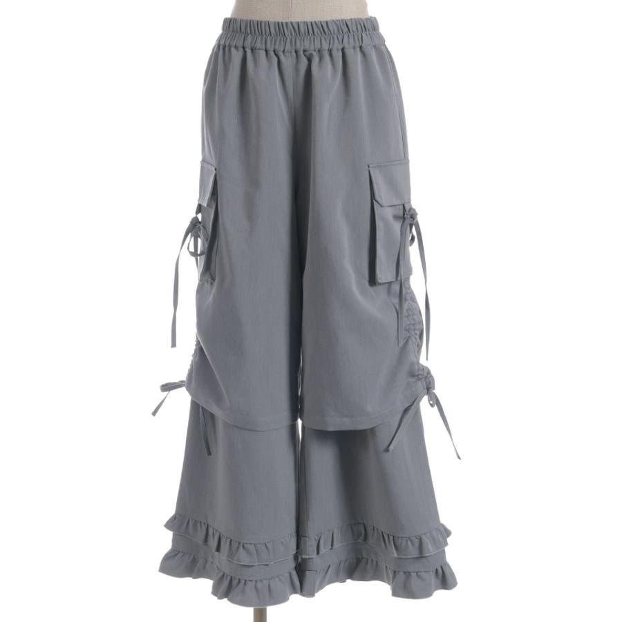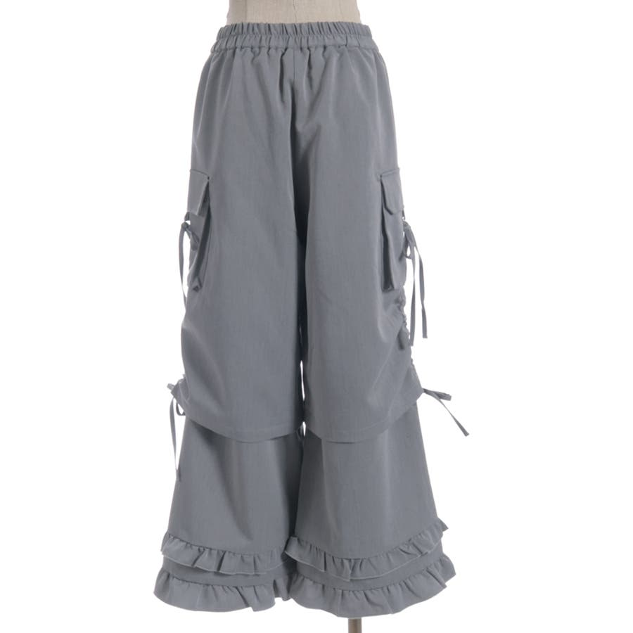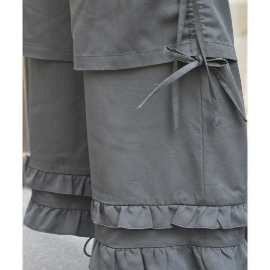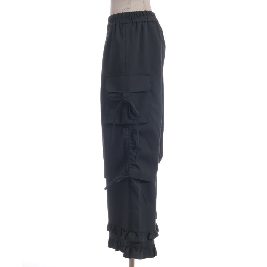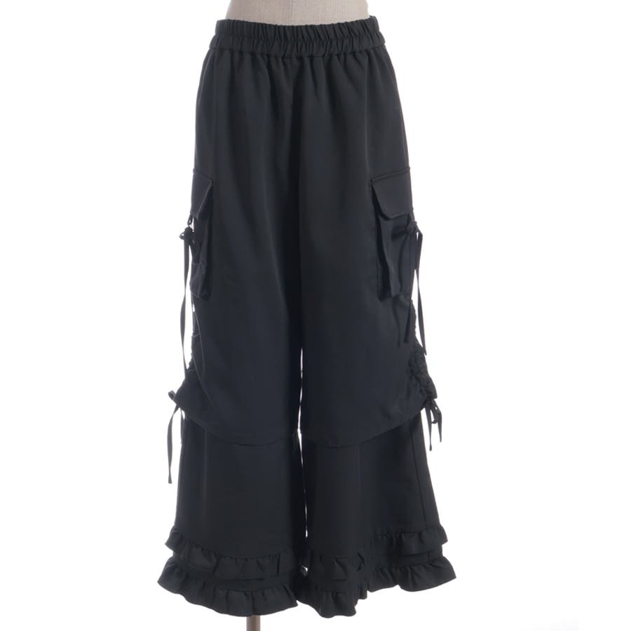 レースとフリルを組み合わせたディテールが印象的なワイドパンツ。サイドにはドロストが施されており、シルエットやデザインを自在にアレンジできる遊び心ある一枚です。