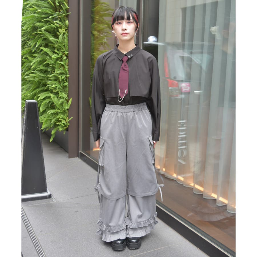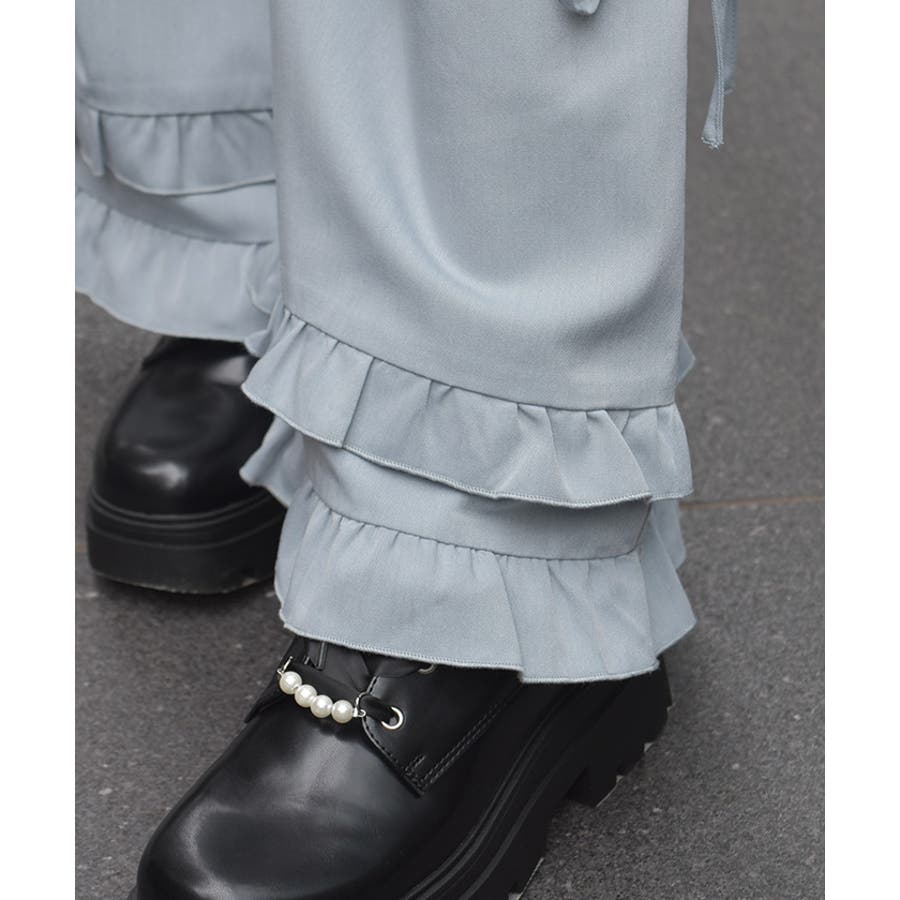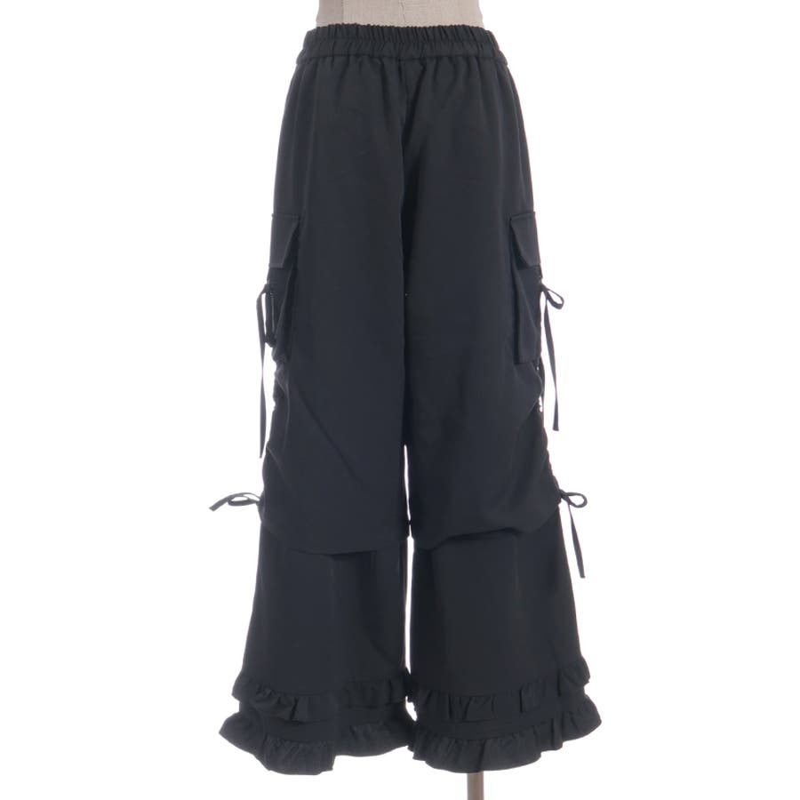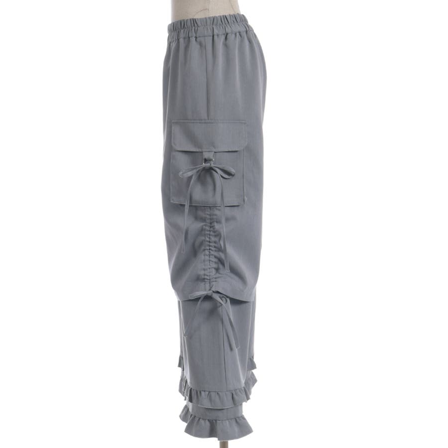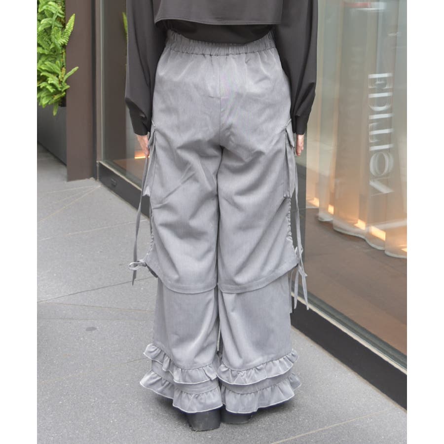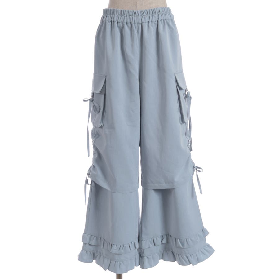 レースとフリルを組み合わせたディテールが印象的なワイドパンツ。サイドにはドロストが施されており、シルエットやデザインを自在にアレンジできる遊び心ある一枚です。
