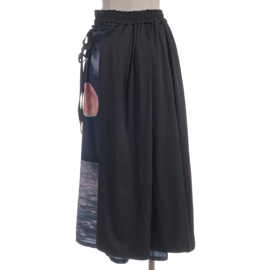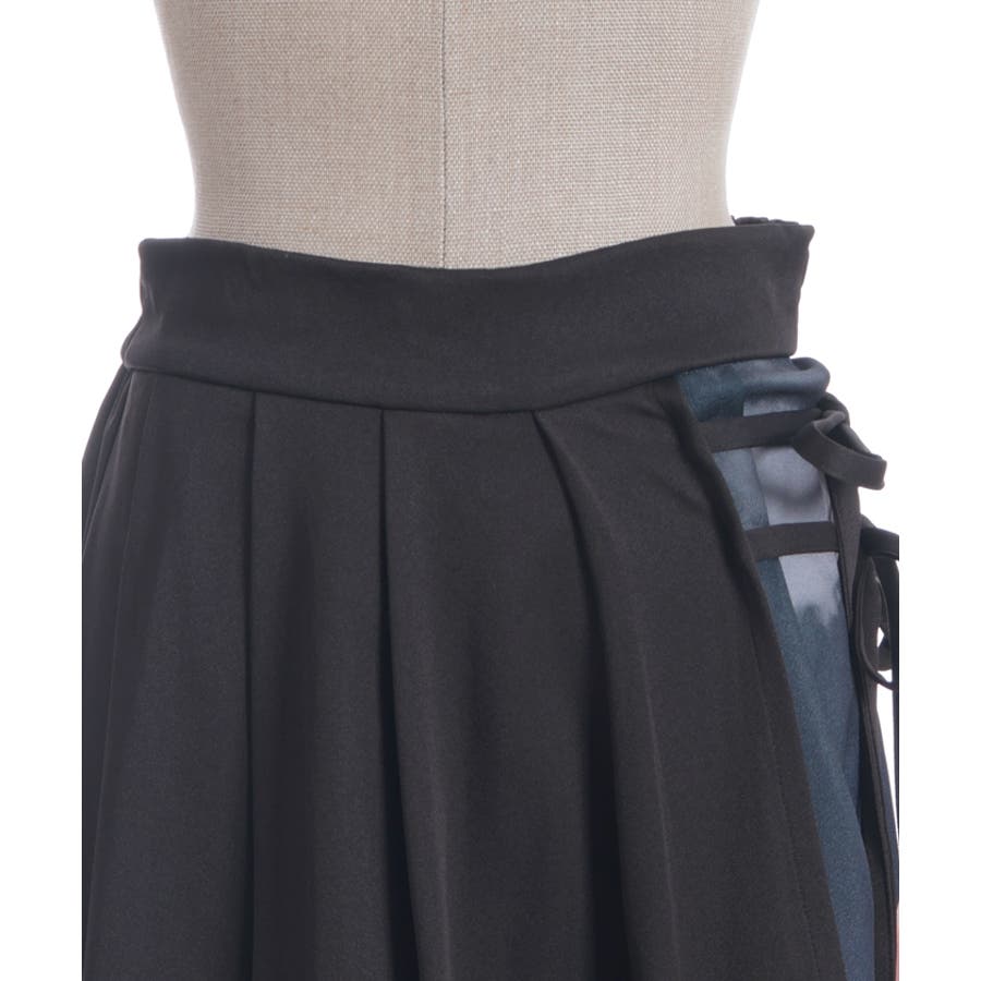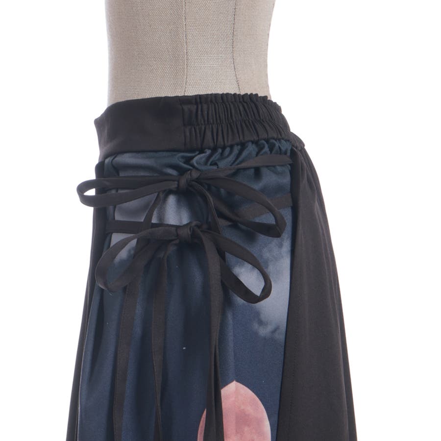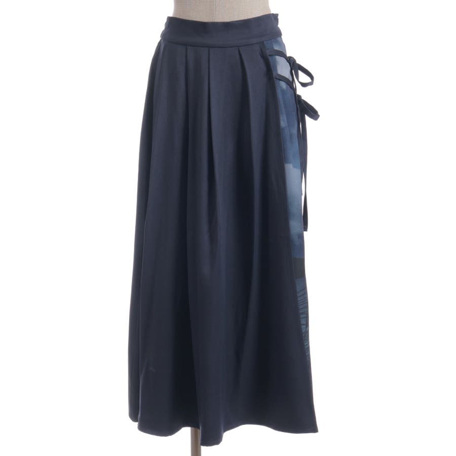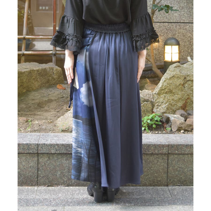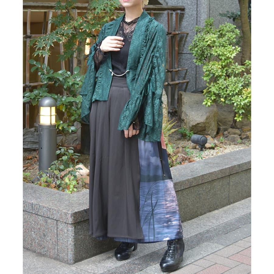 落ち感のあるシルエットが美しく、歩くたびに裾が揺れて上品な雰囲気を演出します。サイドにあしらわれたプリントは存在感がありながらもさりげなく、モダンな大正ロマンのテイストを感じさせます。ウエストのサイドリボンがさりげないアクセントとなり、女性らしさをプラス。