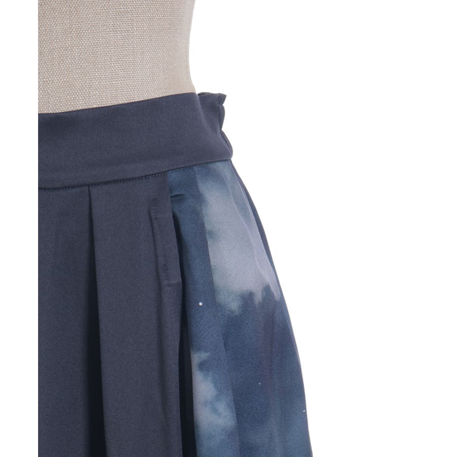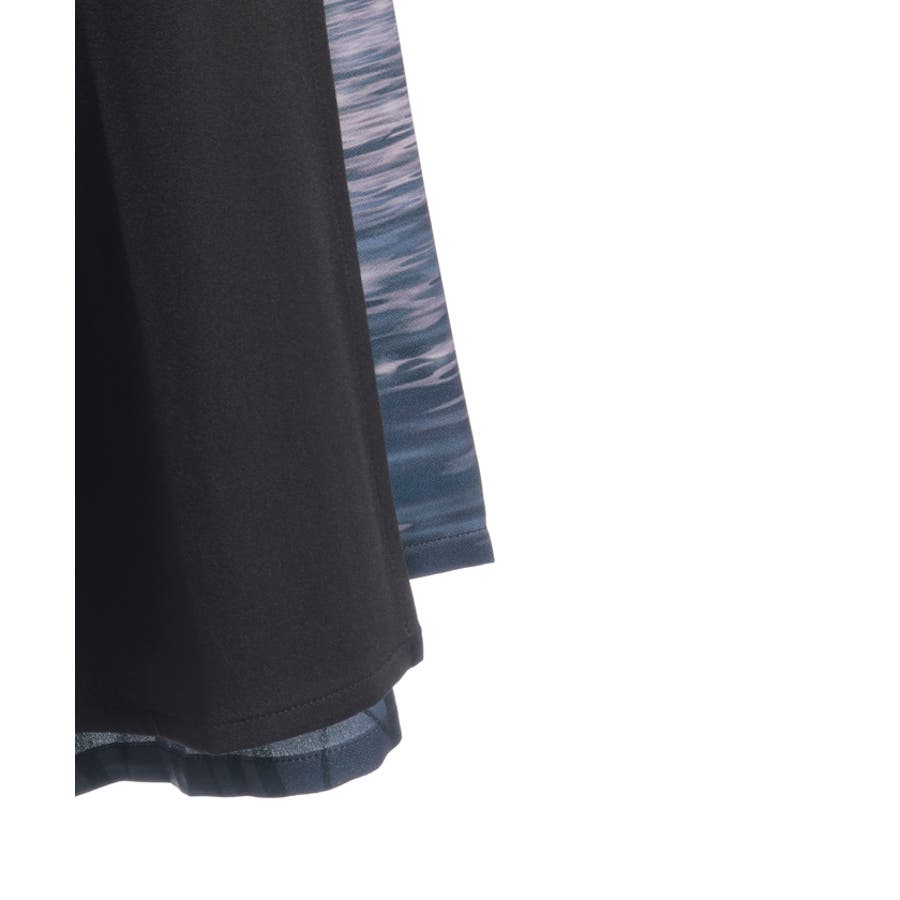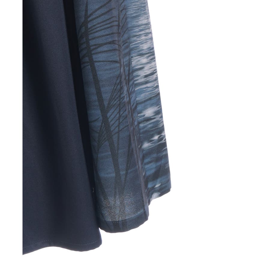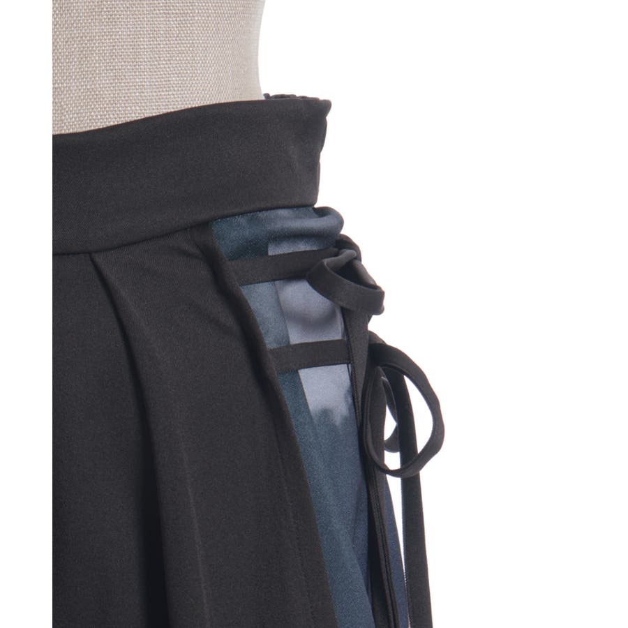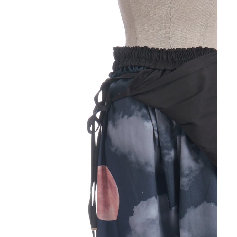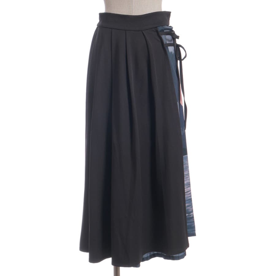 落ち感のあるシルエットが美しく、歩くたびに裾が揺れて上品な雰囲気を演出します。サイドにあしらわれたプリントは存在感がありながらもさりげなく、モダンな大正ロマンのテイストを感じさせます。ウエストのサイドリボンがさりげないアクセントとなり、女性らしさをプラス。